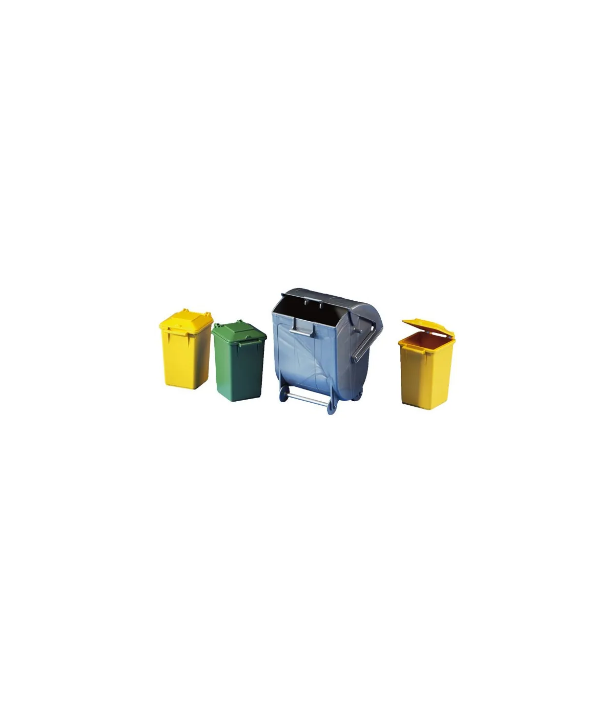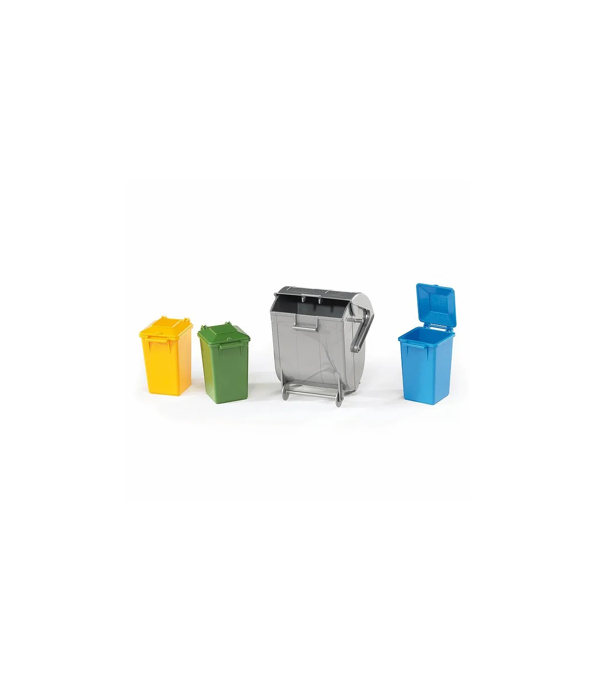El set de contenedores de basura consta de tres pequeños contenedores de colores y uno grande gris. Para jugar, el set de contenedores se puede colocar en los camiones de recogida de basura de BRUDER.