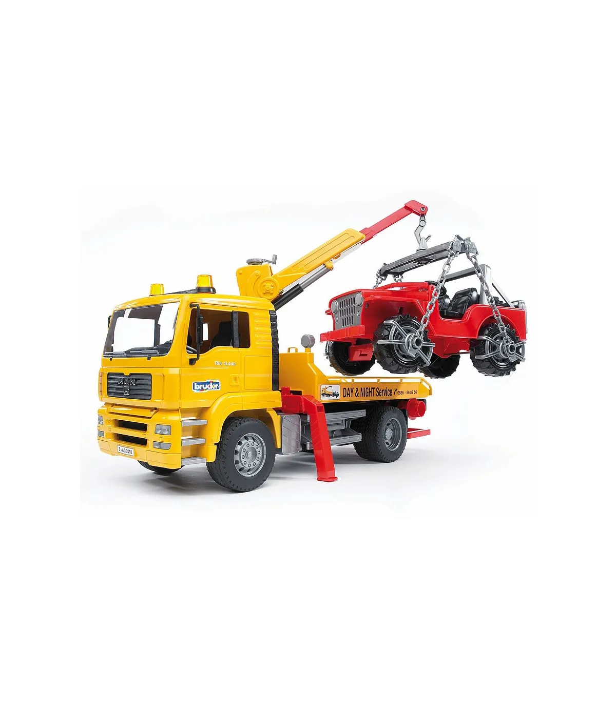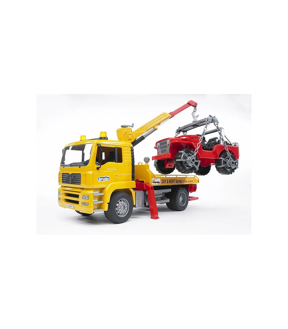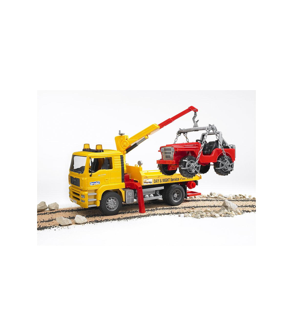Todos hemos visto este camión-grúa en acción, cuando cargavehículos averiados y los lleva al taller. Para poder asistir a losvehículos se puede asentar la plataforma de carga y extender y girarla grúa elevadora. Así, el gancho de remolque extensible y elaparejo de carga, compuesto por cadenas y cepos para ruedas permitenun remolque seguro y rápido. Los calces y soportes abatibles ofrecenuna fijación segura y los neumáticos perfilados completan elconjunto. La cabina del conductor basculante del camión MAN permitever el bloque de motor y los espejos de la cabina del conductor sonabatibles. También se puede abrir el capó de motor del todoterreno yel parabrisas se puede plegar. Además el todoterreno es dirigible.Además, se puede equipar el camión-grúa MAN TGA con el Light andSound Module, nº de art.: 02801 (no incluido en el volumen desuministro).