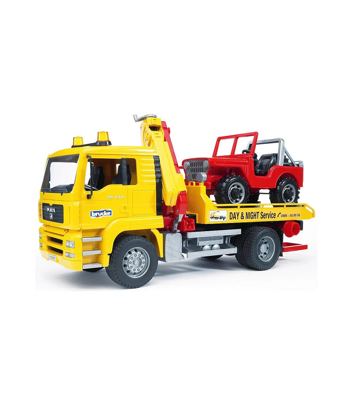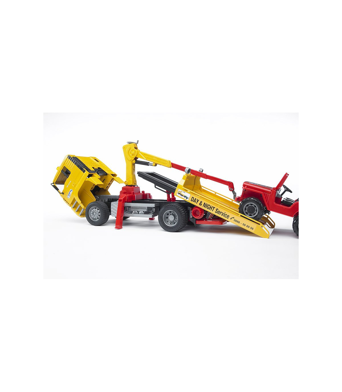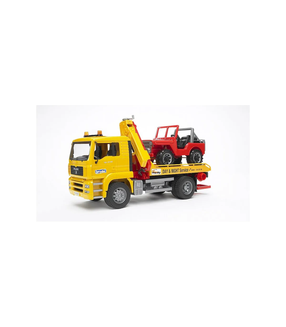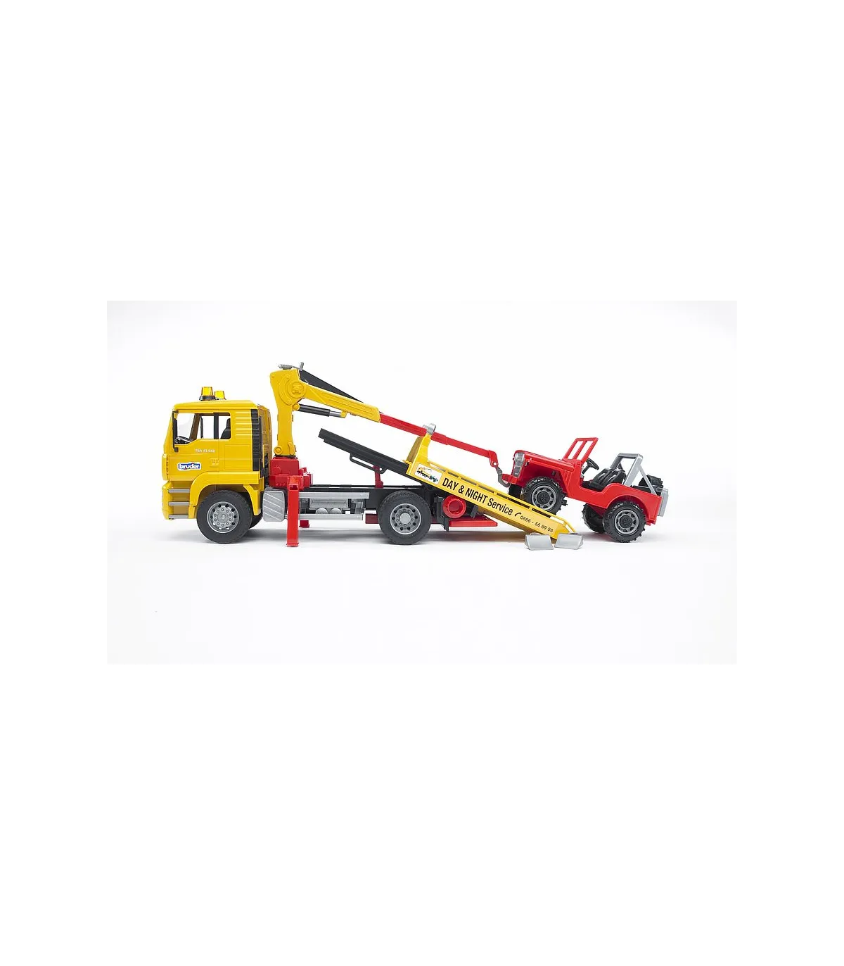 Todos hemos visto este camión-grúa en acción, cuando cargavehículos averiados y los lleva al taller. Para poder asistir a losvehículos se puede asentar la plataforma de carga y extender y girarla grúa elevadora. Así, el gancho de remolque extensible y elaparejo de carga, compuesto por cadenas y cepos para ruedas permitenun remolque seguro y rápido. Los calces y soportes abatibles ofrecenuna fijación segura y los neumáticos perfilados completan elconjunto. La cabina del conductor basculante del camión MAN permitever el bloque de motor y los espejos de la cabina del conductor sonabatibles. También se puede abrir el capó de motor del todoterreno yel parabrisas se puede plegar. Además el todoterreno es dirigible.Además, se puede equipar el camión-grúa MAN TGA con el Light andSound Module, nº de art.: 02801 (no incluido en el volumen desuministro).
