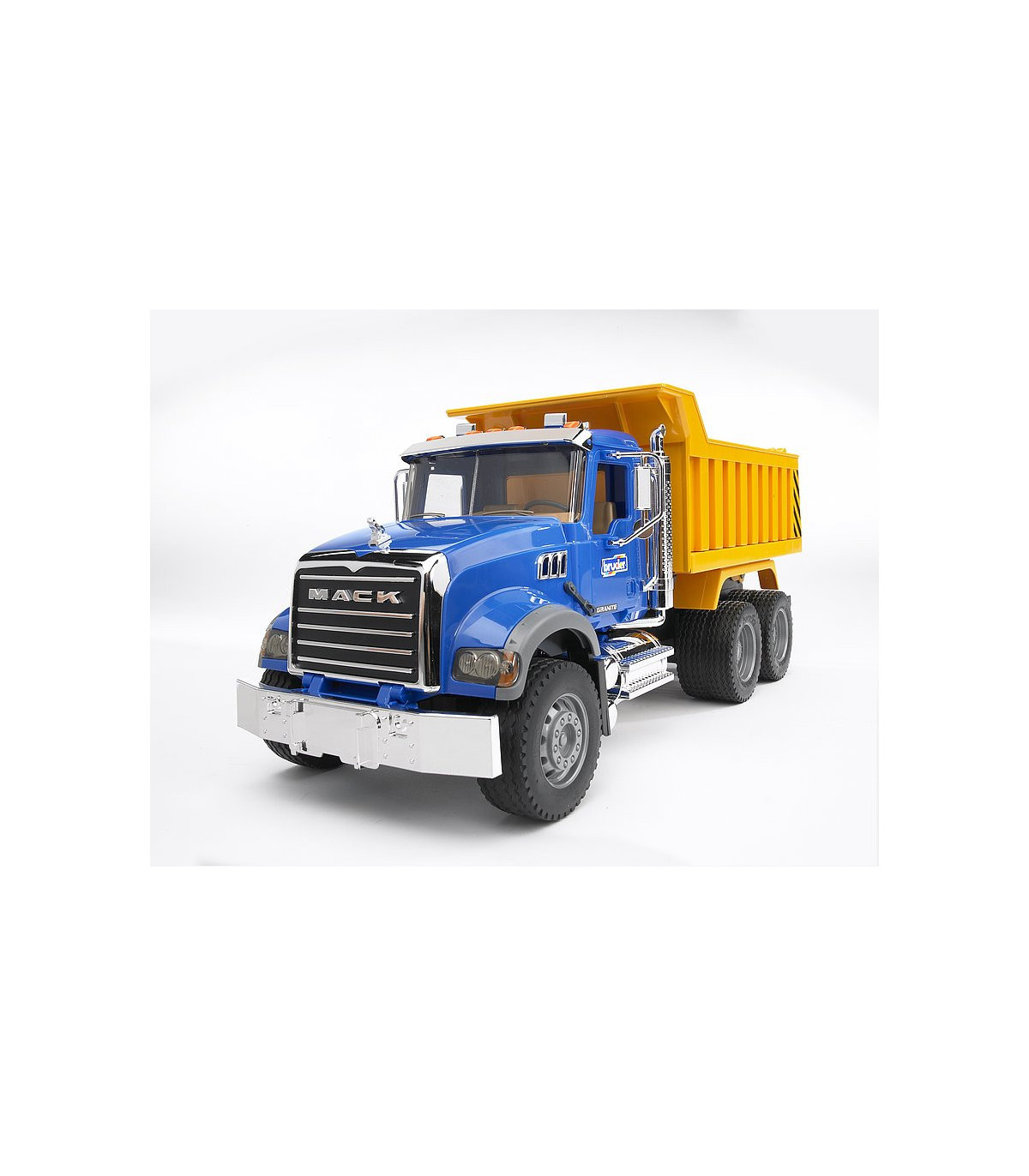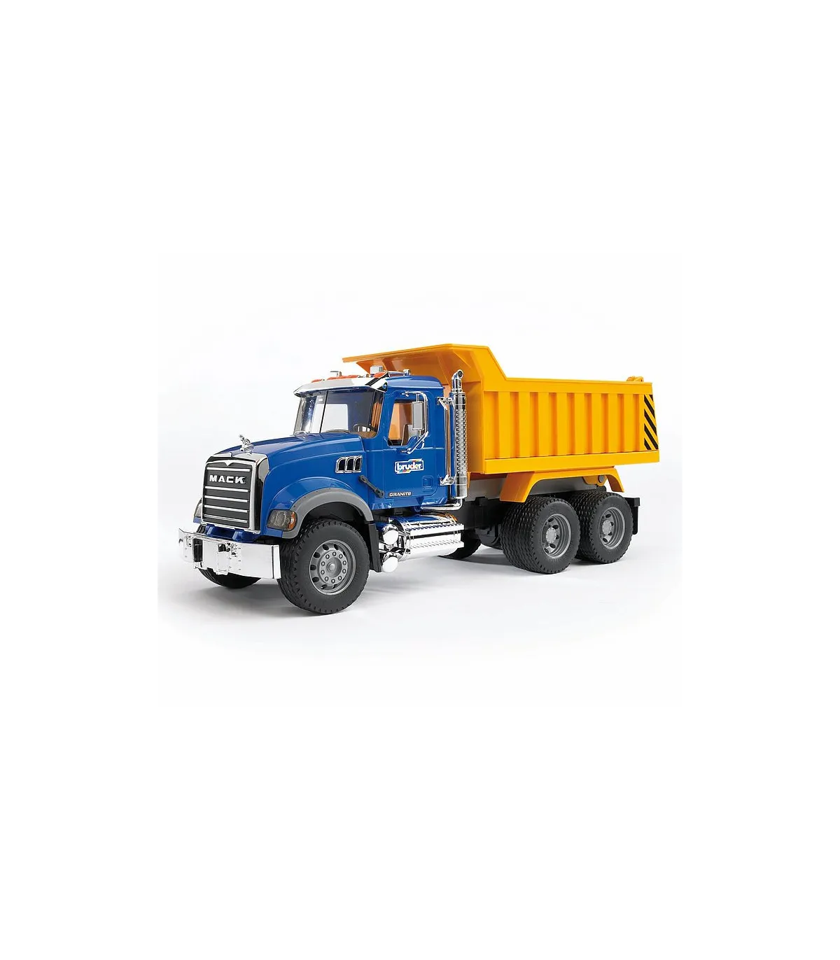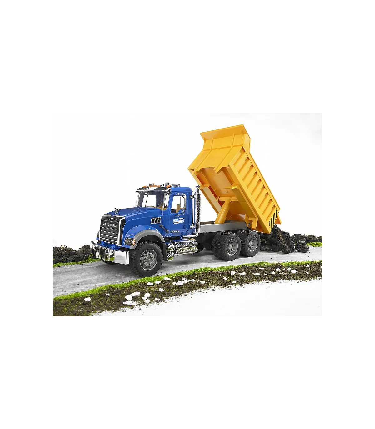 La cabina del conductor realista con puertas que se pueden abrir, ventanas acristaladas, espejos traseros abatibles y piezas cromadas, así como los faros que parecen de verdad llaman verdaderamente la atención no sólo a los aficionados a los camiones. Mediante un mecanismo hidráulico se puede inclinar la caja del volquete y el portón trasero se puede abrir. Para ampliar las posibilidades de juego se puede equipar el Mack Granite, que dispone de un soporte de alojamiento (en el parachoques), con una pala niveladora, un cortacésped mulching o una barredera (no incluidos en el volumen de suministro). Los niños pueden usar el camión de construcción de carreteras conocido por todos tanto en el interior como en el exterior. Así, los niños conocen el mundo de los mayores mientras juegan.