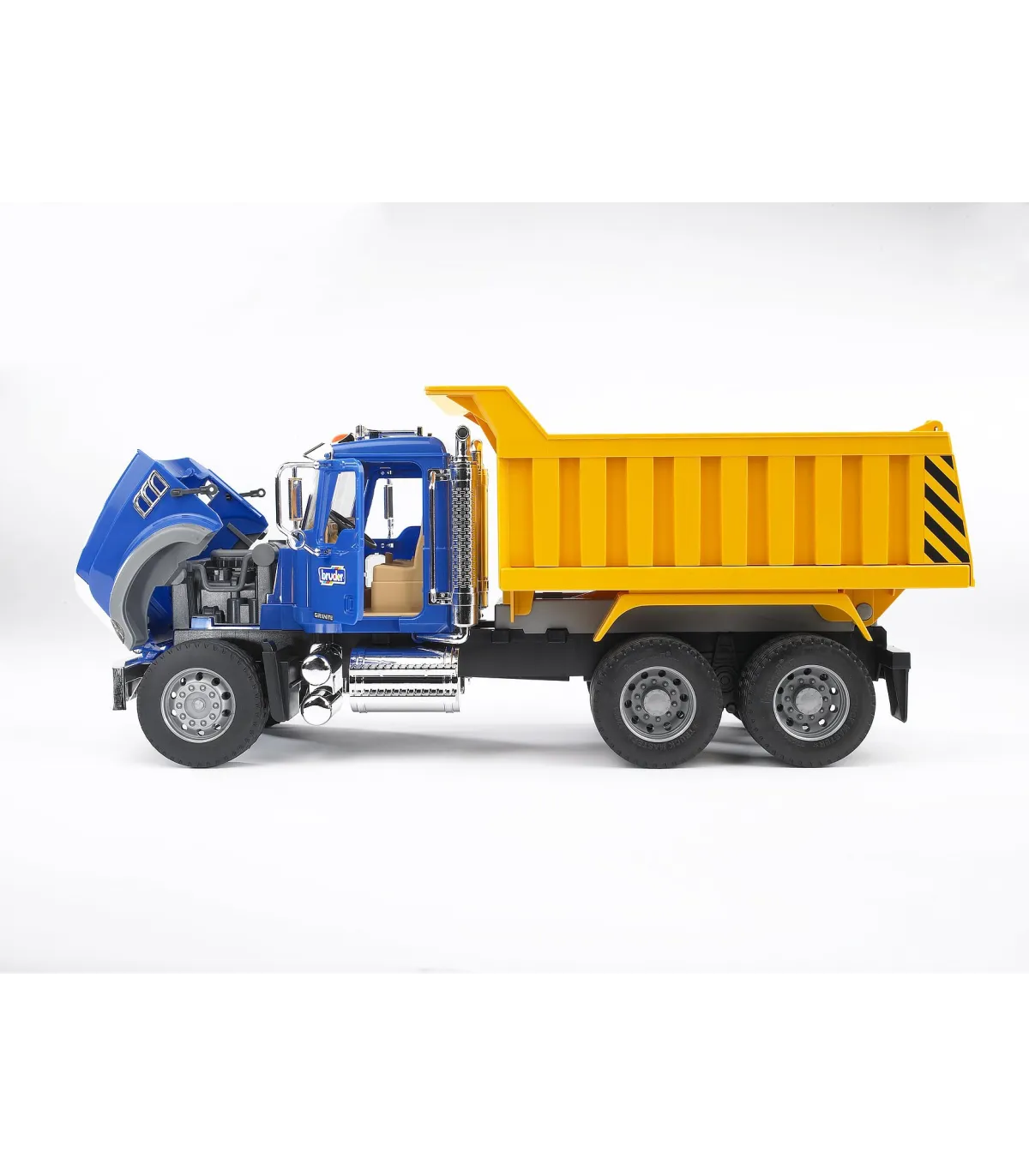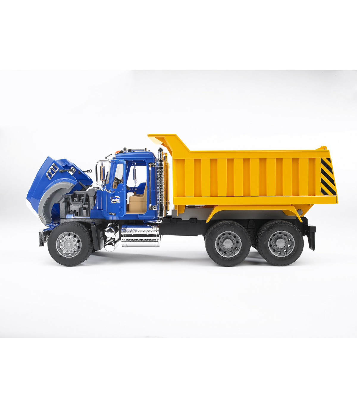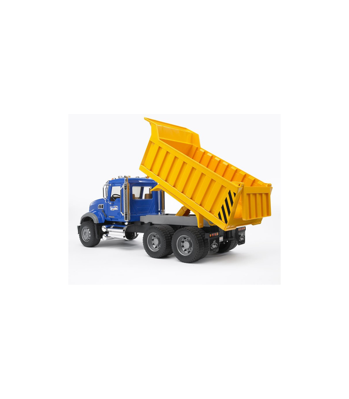 La cabina del conductor realista con puertas que se pueden abrir, ventanas acristaladas, espejos traseros abatibles y piezas cromadas, así como los faros que parecen de verdad llaman verdaderamente la atención no sólo a los aficionados a los camiones. Mediante un mecanismo hidráulico se puede inclinar la caja del volquete y el portón trasero se puede abrir. Para ampliar las posibilidades de juego se puede equipar el Mack Granite, que dispone de un soporte de alojamiento (en el parachoques), con una pala niveladora, un cortacésped mulching o una barredera (no incluidos en el volumen de suministro). Los niños pueden usar el camión de construcción de carreteras conocido por todos tanto en el interior como en el exterior. Así, los niños conocen el mundo de los mayores mientras juegan.