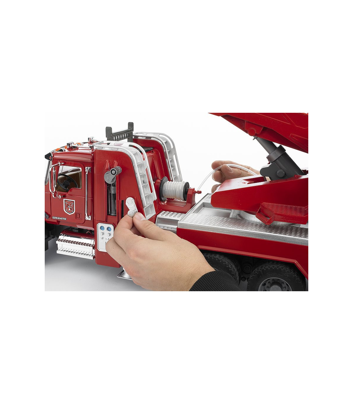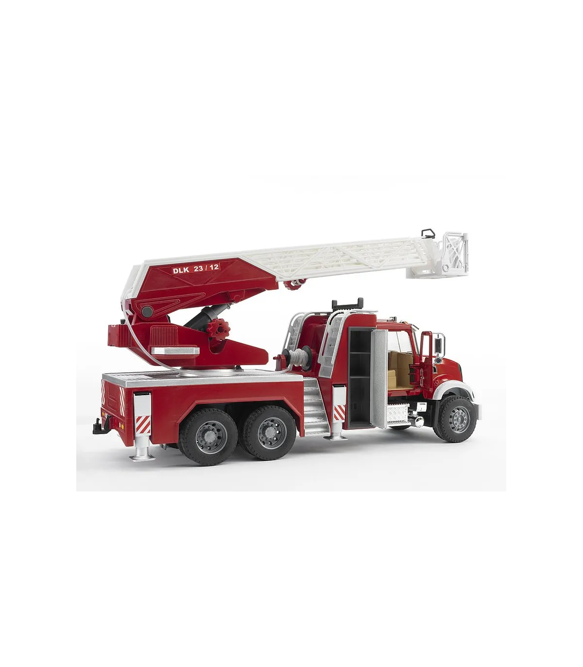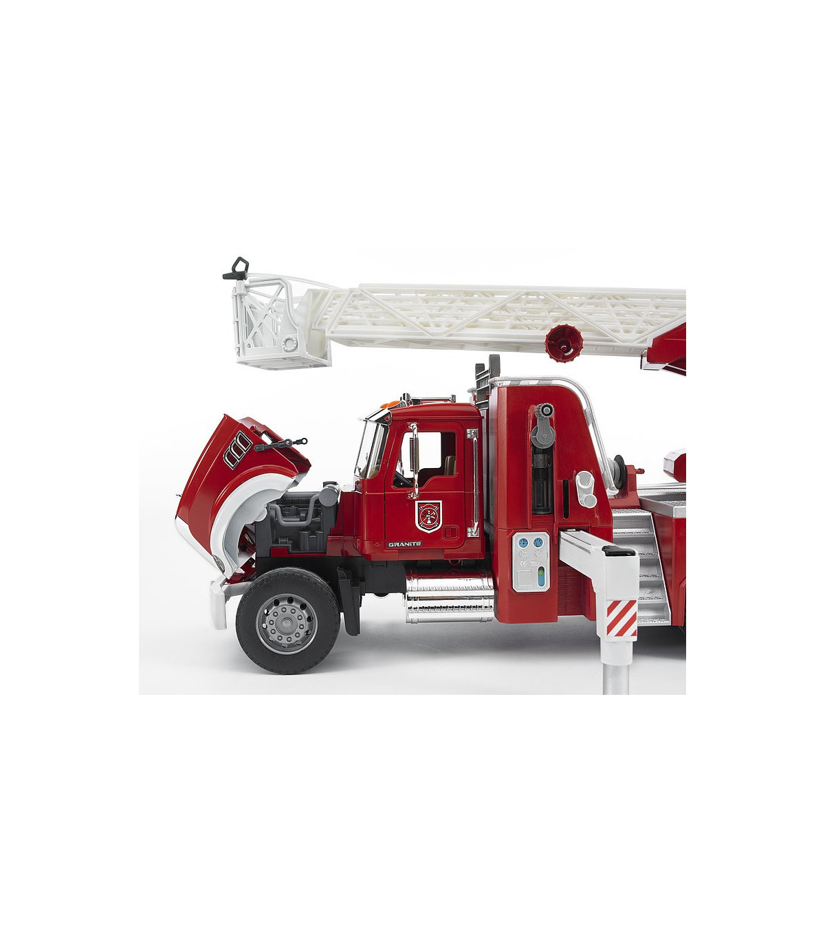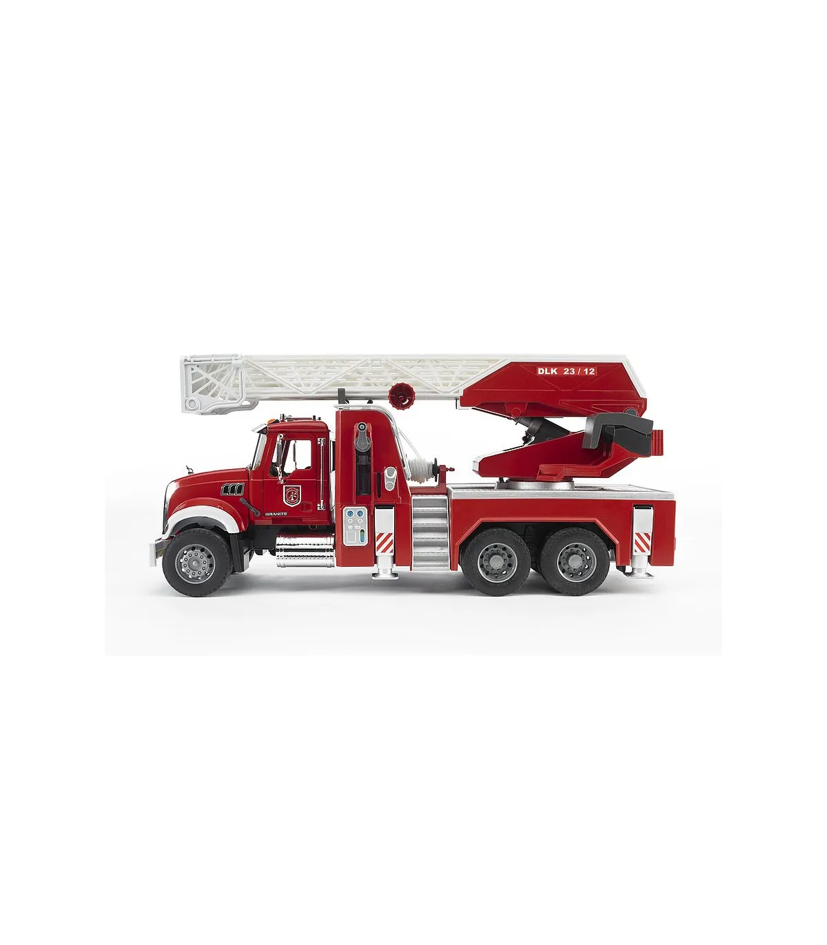 No existe nada más fascinante que reproducir una gran actuación de los bomberos. La novedad de BRUDER en el surtido de bomberos es el camión de bomberos con escalera MACK Granite. Además de todos los detalles, como p. ej. las puertas que se abren, los espejos abatibles, el capó de motor que se abre y algunos componentes cromados, el vehículo dispone de un depósito de agua integrado que se puede llenar mientras se juega. La manguera de agua se puede desenrollar, las figuras de BRUDER la pueden sujetar (p. ej. nº de art. 60000, no incluidas en el volumen de suministro), se puede sujetar al cesto de la escalera y tiene una boquilla de agua completamente funcional. La escalera giratoria con cesto de salvamento se puede desplegar y regular en altura mediante un volante. Además de los dos asientos de la cabina del conductor hay otro asiento adicional para la figura de BRUDER en la escalera de bomberos. Los cuatro pies de apoyo garantizan una fijación segura del vehículo en cualquier situación y el compartimento con puerta abatible crea espacio adicional para guardar herramientas. Gracias al gran número de funciones y a los muchos detalles del modelo, no hay limites para las escenas de juego creativas.