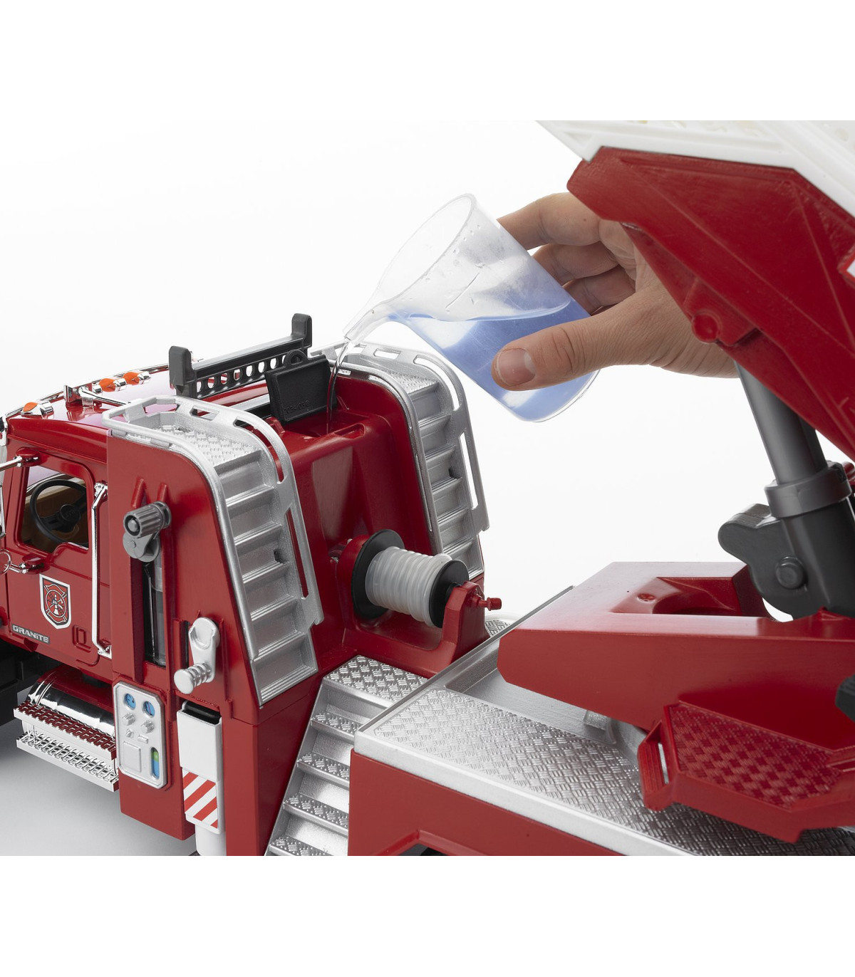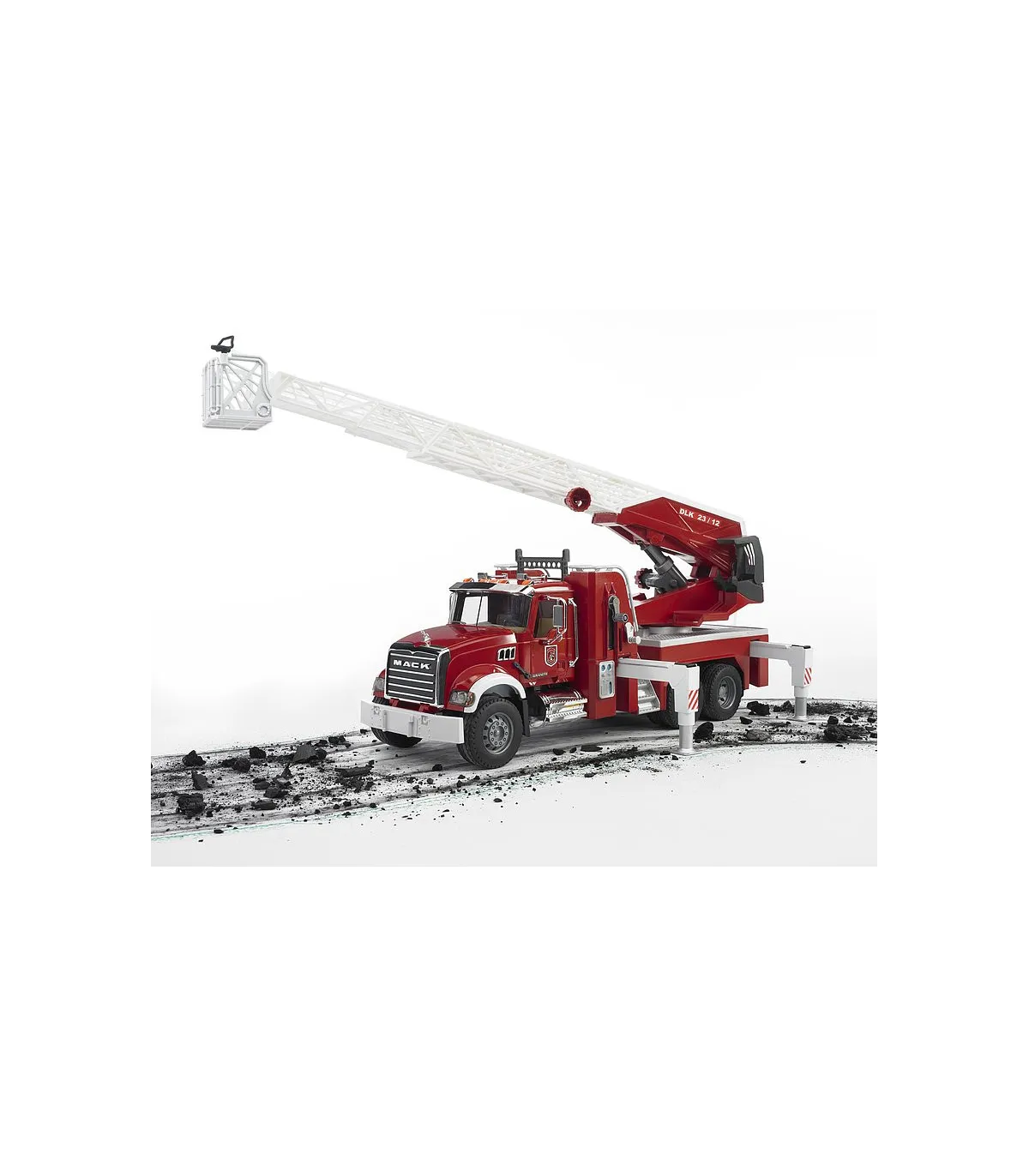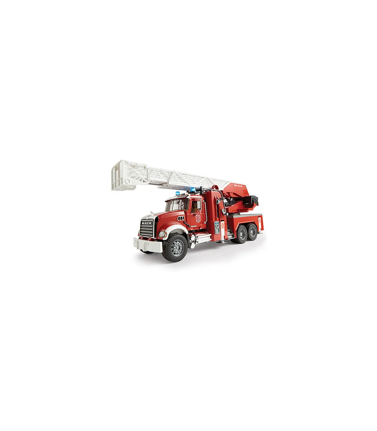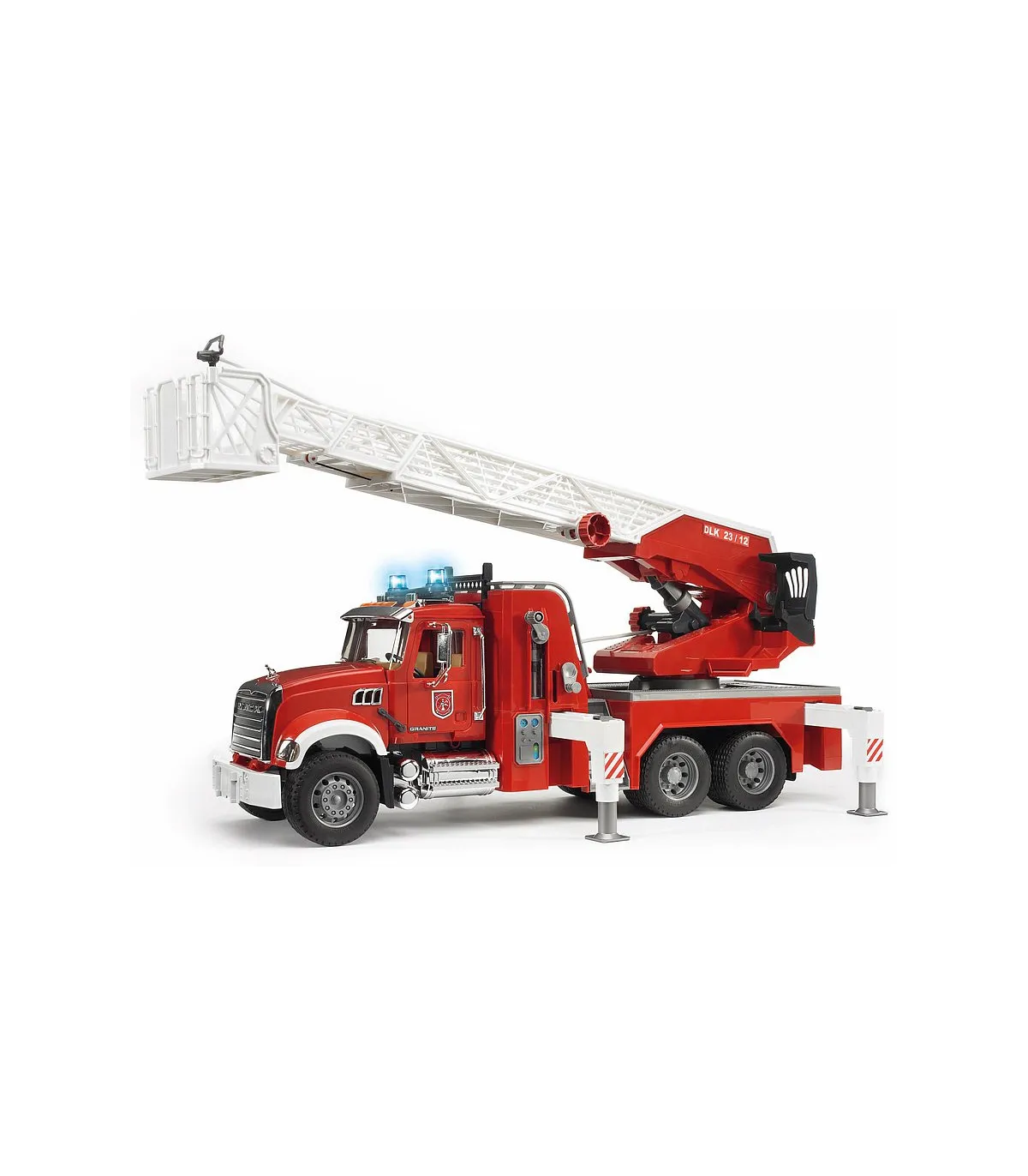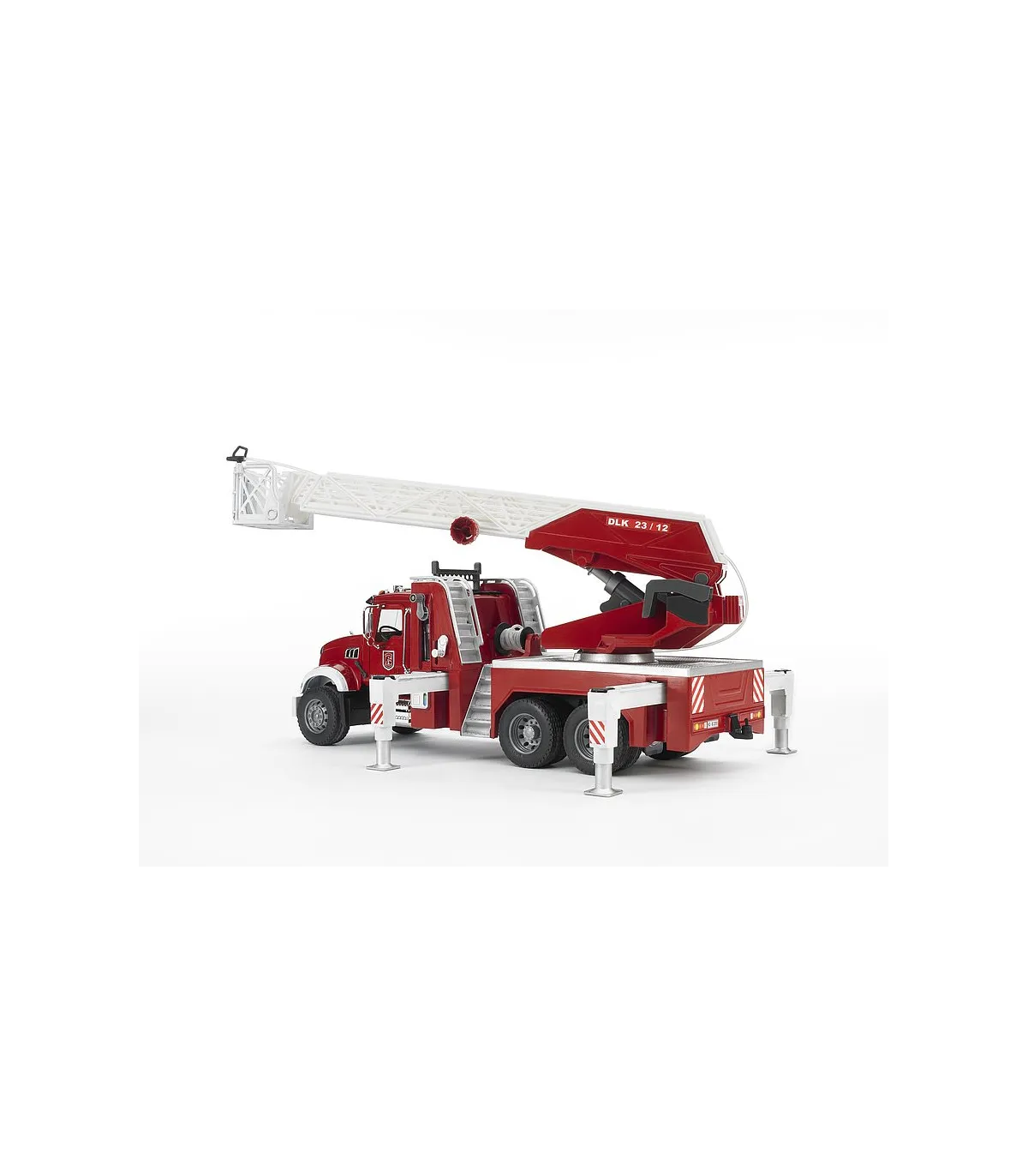No existe nada más fascinante que reproducir una gran actuación de los bomberos. La novedad de BRUDER en el surtido de bomberos es el camión de bomberos con escalera MACK Granite. Además de todos los detalles, como p. ej. las puertas que se abren, los espejos abatibles, el capó de motor que se abre y algunos componentes cromados, el vehículo dispone de un depósito de agua integrado que se puede llenar mientras se juega. La manguera de agua se puede desenrollar, las figuras de BRUDER la pueden sujetar (p. ej. nº de art. 60000, no incluidas en el volumen de suministro), se puede sujetar al cesto de la escalera y tiene una boquilla de agua completamente funcional. La escalera giratoria con cesto de salvamento se puede desplegar y regular en altura mediante un volante. Además de los dos asientos de la cabina del conductor hay otro asiento adicional para la figura de BRUDER en la escalera de bomberos. Los cuatro pies de apoyo garantizan una fijación segura del vehículo en cualquier situación y el compartimento con puerta abatible crea espacio adicional para guardar herramientas. Gracias al gran número de funciones y a los muchos detalles del modelo, no hay limites para las escenas de juego creativas.