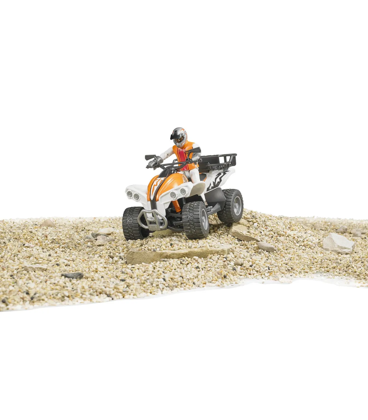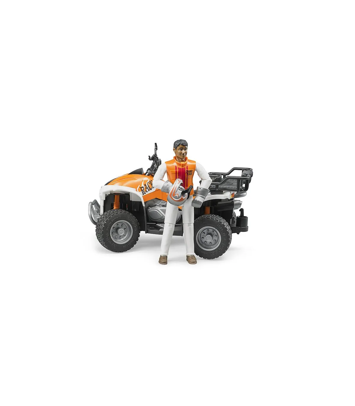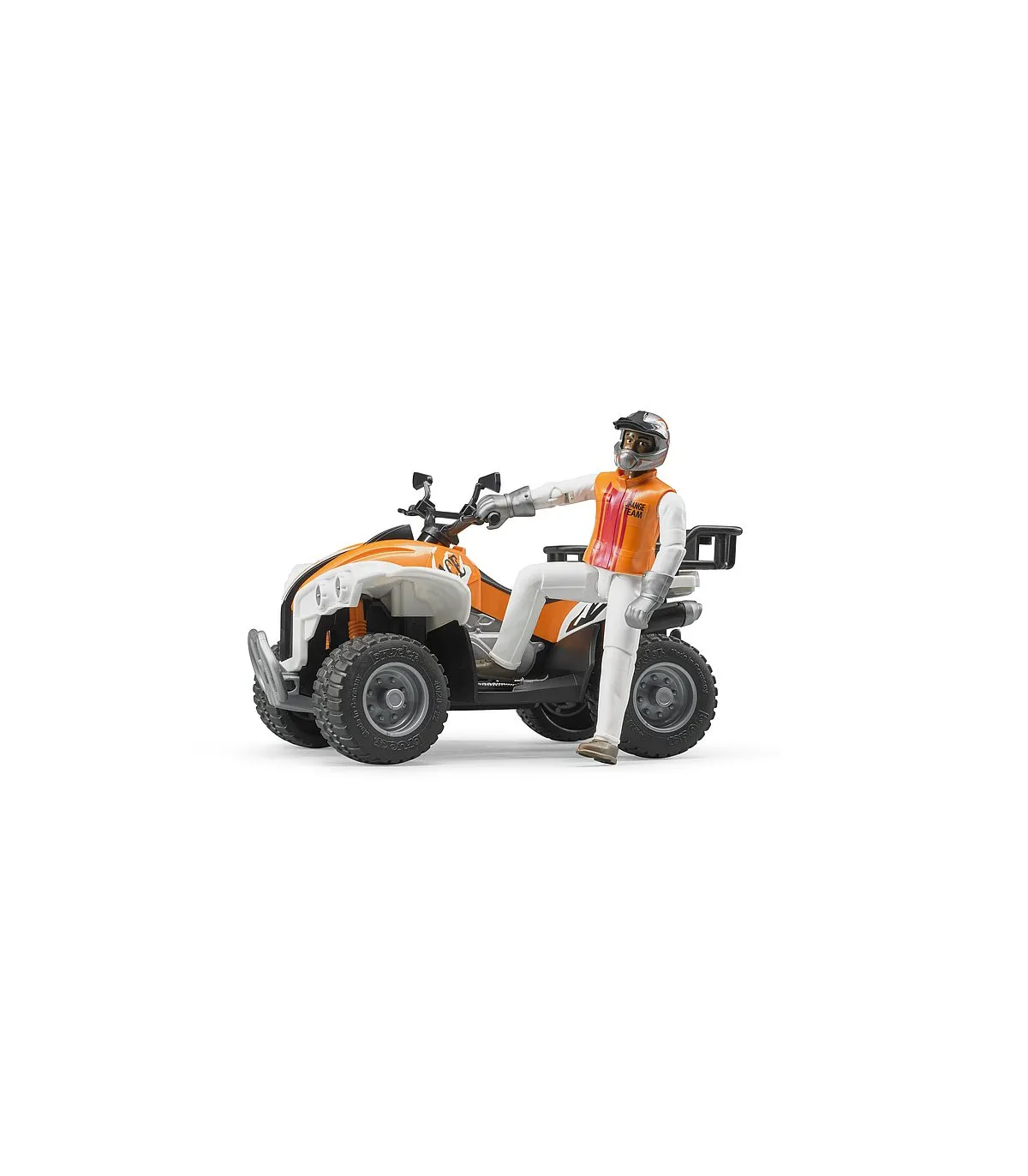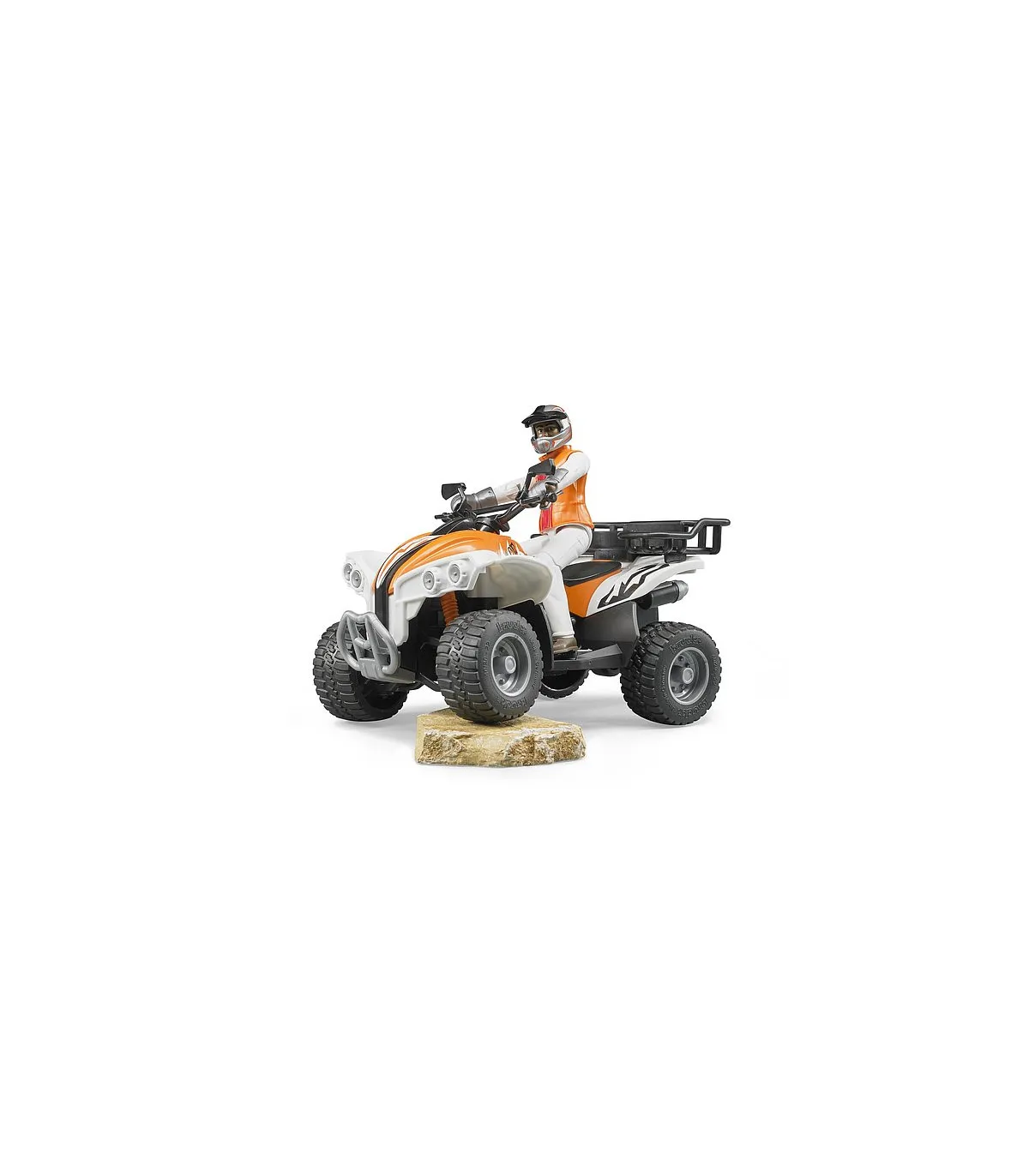 Un quad combina la diversión de una motocicleta con la flexibilidad de un vehículo todoterreno. Por lo tanto, no es de extrañar que los quads se utilicen en la silvicultura y la agricultura, así como en las obras de construcción o para el ocio, y sean cada vez más populares. El Quad de BRUDER impresiona por su diseño ópticamente muy moderno y de alta calidad, lo que significa que deja una impresión duradera tanto en la vida cotidiana como en las rutas deportivas todoterreno. Debido a la suspensión de ambos ejes y la direccionalidad del eje delantero, el quad es muy ágil y permite maniobras precisas incluso en los terrenos más difíciles. Con un portaequipajes desmontable, un enganche de remolque y soportes para herramientas, el quad también es ideal como vehículo utilitario. La implementación realista del vehículo en relación con la figura de bworld difícilmente puede ser superada en términos de realismo. Entre otras cosas, la impresión de la figura, que continúa el tema de las carreras todoterreno con el casco del conductor y el moderno chaleco protector, es impresionante. Con un agarre firme en el manillar y un asiento del conductor optimizado para una posición deportiva, el conductor siempre mantiene el control, incluso cuando se conduce a alta velocidad sobre terreno accidentado. Una protección de ariete estable y los neumáticos antideslizantes completan el cuadro. Con un agarre firme en el manillar y un asiento del conductor optimizado para una posición deportiva, el conductor siempre mantiene el control, incluso cuando se conduce a alta velocidad sobre terreno accidentado. Una protección de ariete estable y los neumáticos antideslizantes completan el cuadro. Con un agarre firme en el manillar y un asiento del conductor optimizado para una posición deportiva, el conductor siempre mantiene el control, incluso cuando conduce a alta velocidad en terreno accidentado. Una protección de ariete estable y los neumáticos antideslizantes completan el cuadro.