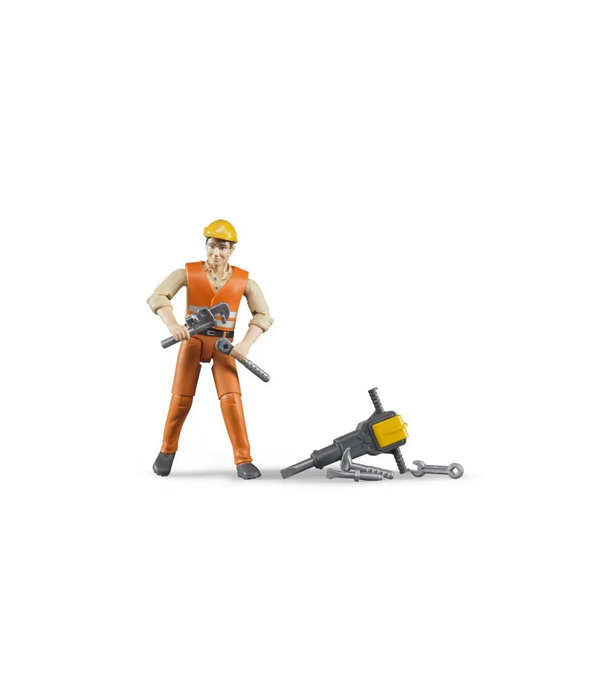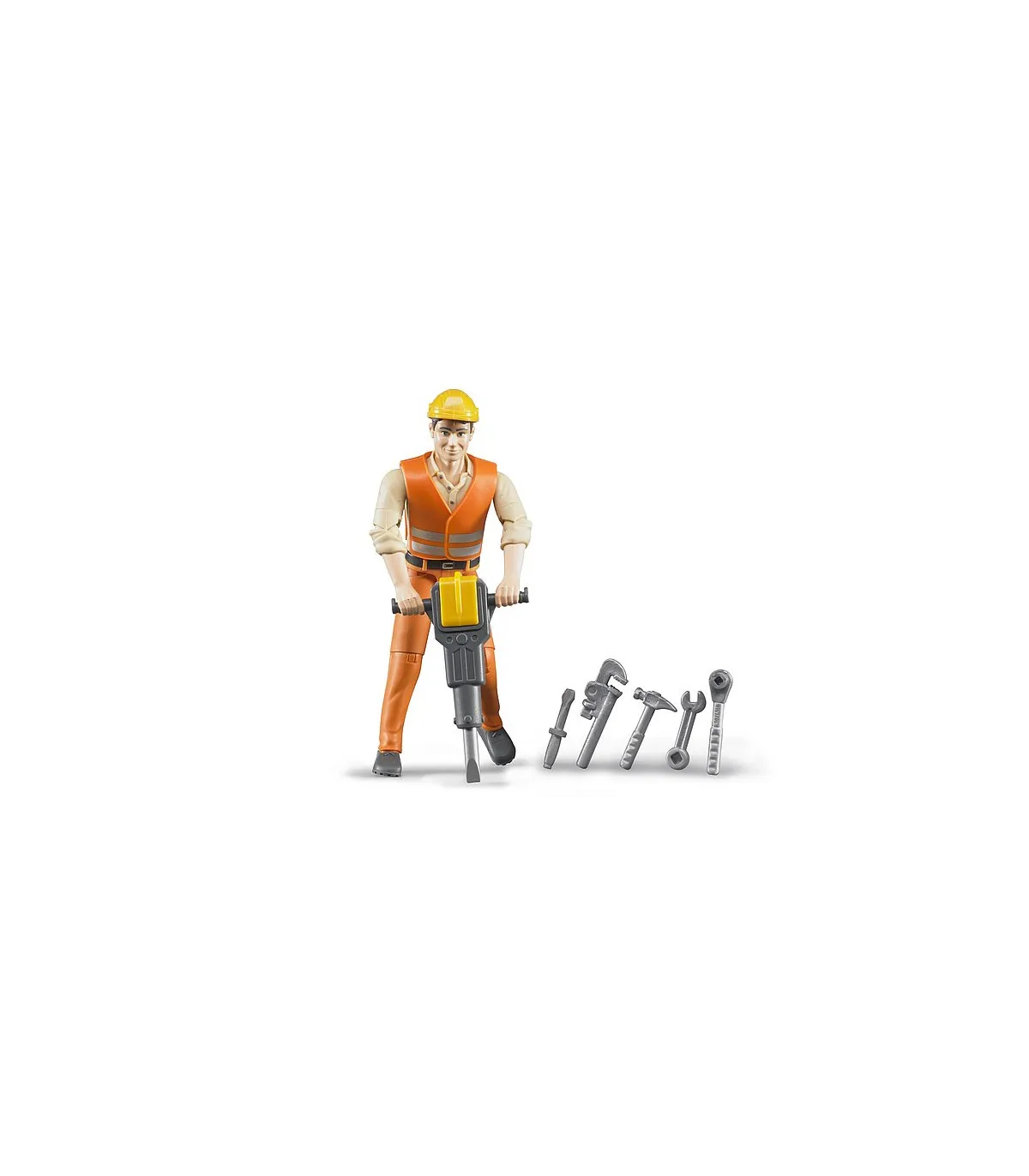 El gran catálogo de BRUDER comprende camiones, máquinas de obras,excavadoras, grúas y mucho más, fieles a sus originales hasta en losmás mínimos detalles. El complemento ideal son las figuras, queofrecen todavía más diversión y realismo a las escenas de juego, yestimulan el juego de rol y la creatividad de los niños. El obrerocon accesorios es el complemento ideal de todos los vehículos deobras del catálogo. Una vez seguros con el casco y el chaleco, soloqueda ponerse manos a la obra. El set consta además de un martilloneumático y otras cinco herramientas, que permiten crear numerososescenarios de juego. El chaleco y el casco son extraíbles.