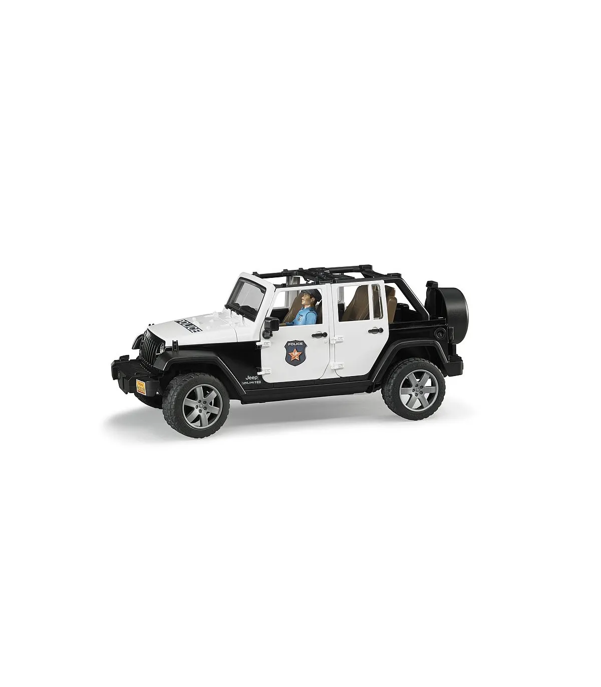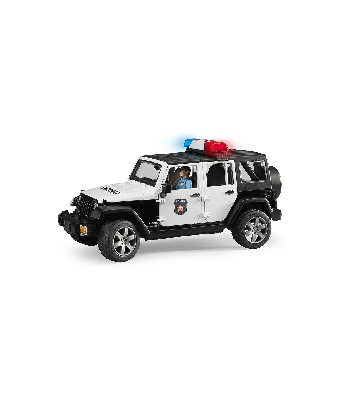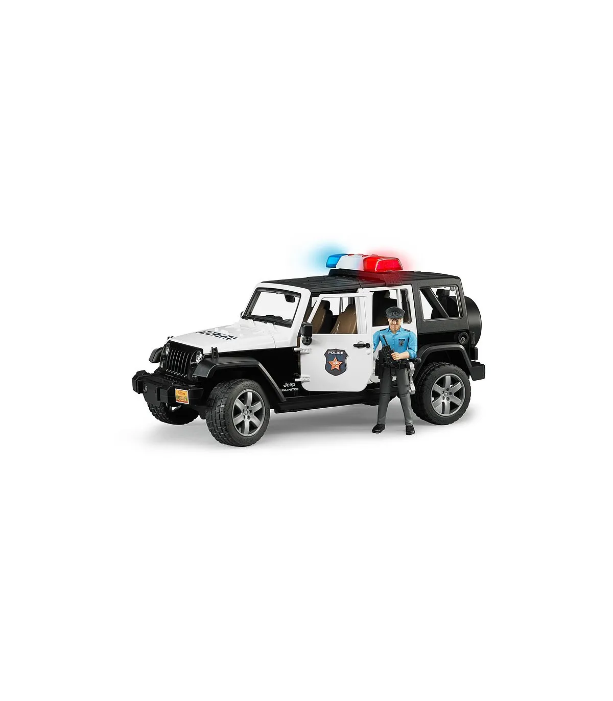 El Jeep Wrangler Unlimited Rubicon está diseñado para el servicio diario con un atrayente look policial e incorpora numerosas funciones que aseguran una diversión prácticamente ilimitada al jugar con él. Además del techo de segmentos extraíble de 2 piezas, es posible abrir el capó del motor, la puerta trasera y las otras cuatro puertas. Por supuesto, hay espacio disponible en el vehículo para que cuatro figuras bworld de BRUDER viajen juntas. Como alternativa a la ocupación total de los asientos se puede extraer el asiento trasero para poder alojar en el área de carga los accesorios de elementos de unión estándar de BRUDER. La barra de dirección adicional sirve para dirigir fácilmente el vehículo a través de la ventana de techo y se puede guardar en el suelo del vehículo si no está en uso. Los ejes tienen una suspensión todoterreno y los neumáticos perfilados tienen llantas con atractivo aspecto de vehículo deportivo. Gracias al punto de inserción frontal, en el que se puede sujetar por ejemplo el torno de cable, que se puede adquirir adicionalmente, y al acoplamiento de remolque extraíble, las posibilidades de ampliación en el mundo BRUDER no tienen límite. La versión policial del modelo Jeep dispone de un módulo de luces y sonido de nuevo diseño que está equipado con cuatro botones para activar funciones (1. Ruido de motor 2. Sirena de policía 3. Sirena de bomberos 4. Señal de emergencia). El policía bworld está totalmente equipado para resaltar su autoridad en todas sus acciones. El cinturón donde porta su pistola tiene también una linterna, un radio y una porra como equipamiento importante para el servicio.