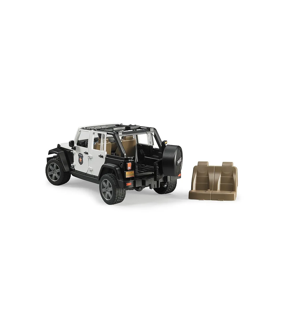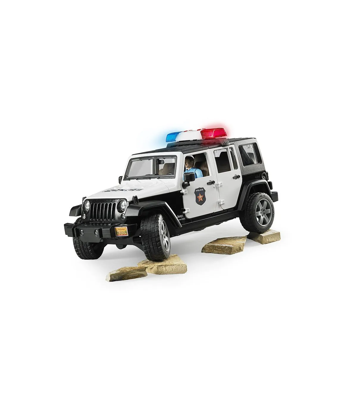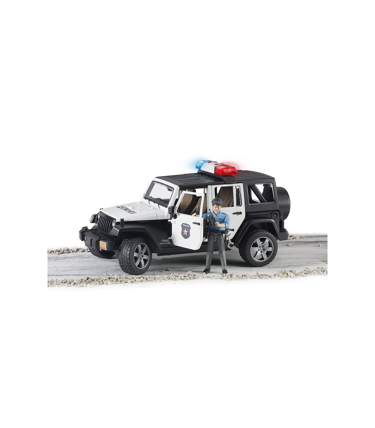El Jeep Wrangler Unlimited Rubicon está diseñado para el servicio diario con un atrayente look policial e incorpora numerosas funciones que aseguran una diversión prácticamente ilimitada al jugar con él. Además del techo de segmentos extraíble de 2 piezas, es posible abrir el capó del motor, la puerta trasera y las otras cuatro puertas. Por supuesto, hay espacio disponible en el vehículo para que cuatro figuras bworld de BRUDER viajen juntas. Como alternativa a la ocupación total de los asientos se puede extraer el asiento trasero para poder alojar en el área de carga los accesorios de elementos de unión estándar de BRUDER. La barra de dirección adicional sirve para dirigir fácilmente el vehículo a través de la ventana de techo y se puede guardar en el suelo del vehículo si no está en uso. Los ejes tienen una suspensión todoterreno y los neumáticos perfilados tienen llantas con atractivo aspecto de vehículo deportivo. Gracias al punto de inserción frontal, en el que se puede sujetar por ejemplo el torno de cable, que se puede adquirir adicionalmente, y al acoplamiento de remolque extraíble, las posibilidades de ampliación en el mundo BRUDER no tienen límite. La versión policial del modelo Jeep dispone de un módulo de luces y sonido de nuevo diseño que está equipado con cuatro botones para activar funciones (1. Ruido de motor 2. Sirena de policía 3. Sirena de bomberos 4. Señal de emergencia). El policía bworld está totalmente equipado para resaltar su autoridad en todas sus acciones. El cinturón donde porta su pistola tiene también una linterna, un radio y una porra como equipamiento importante para el servicio.