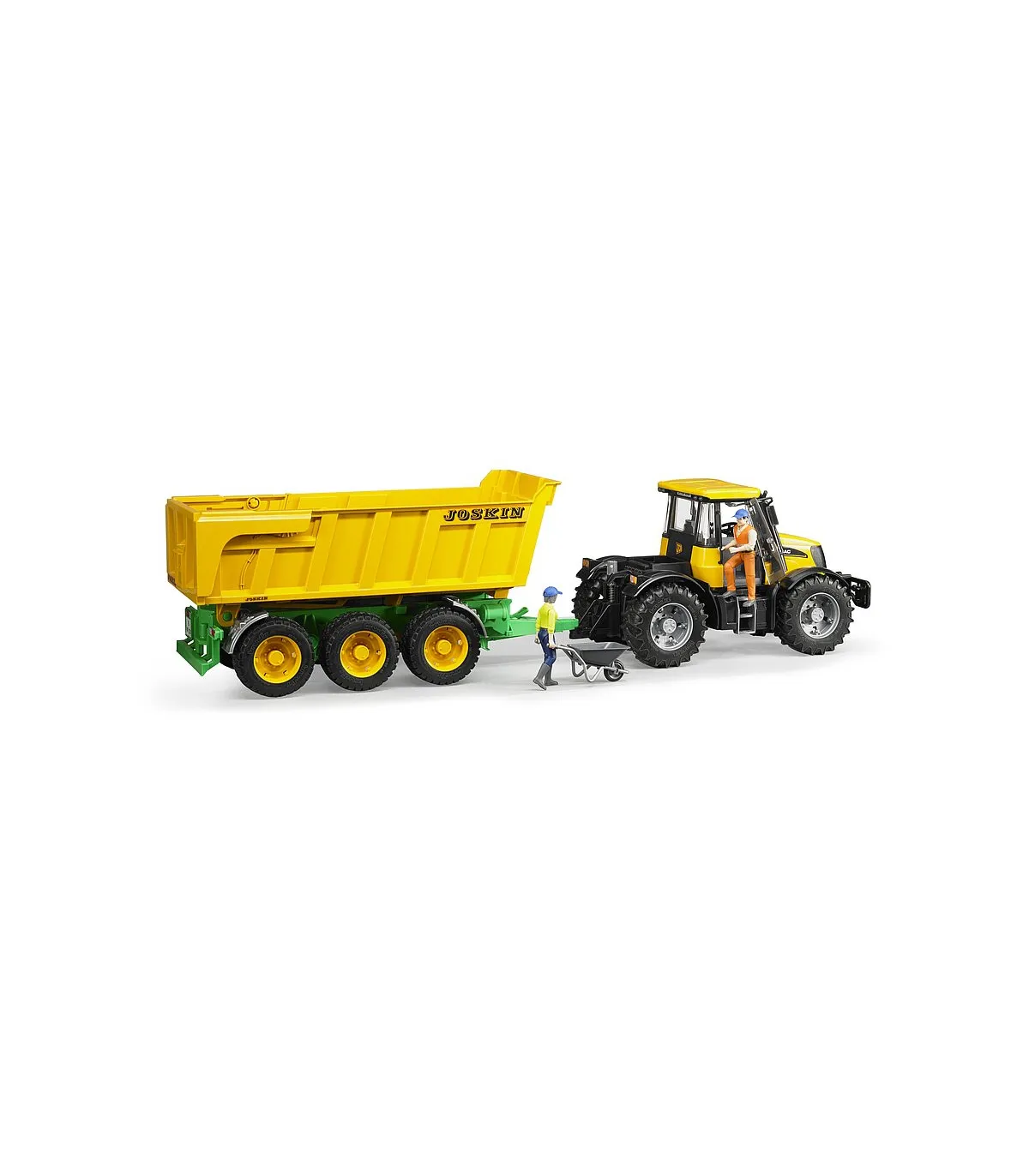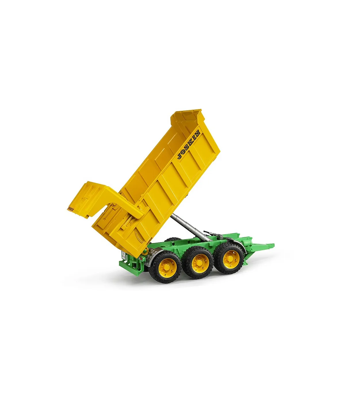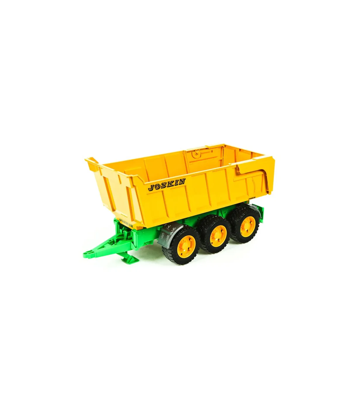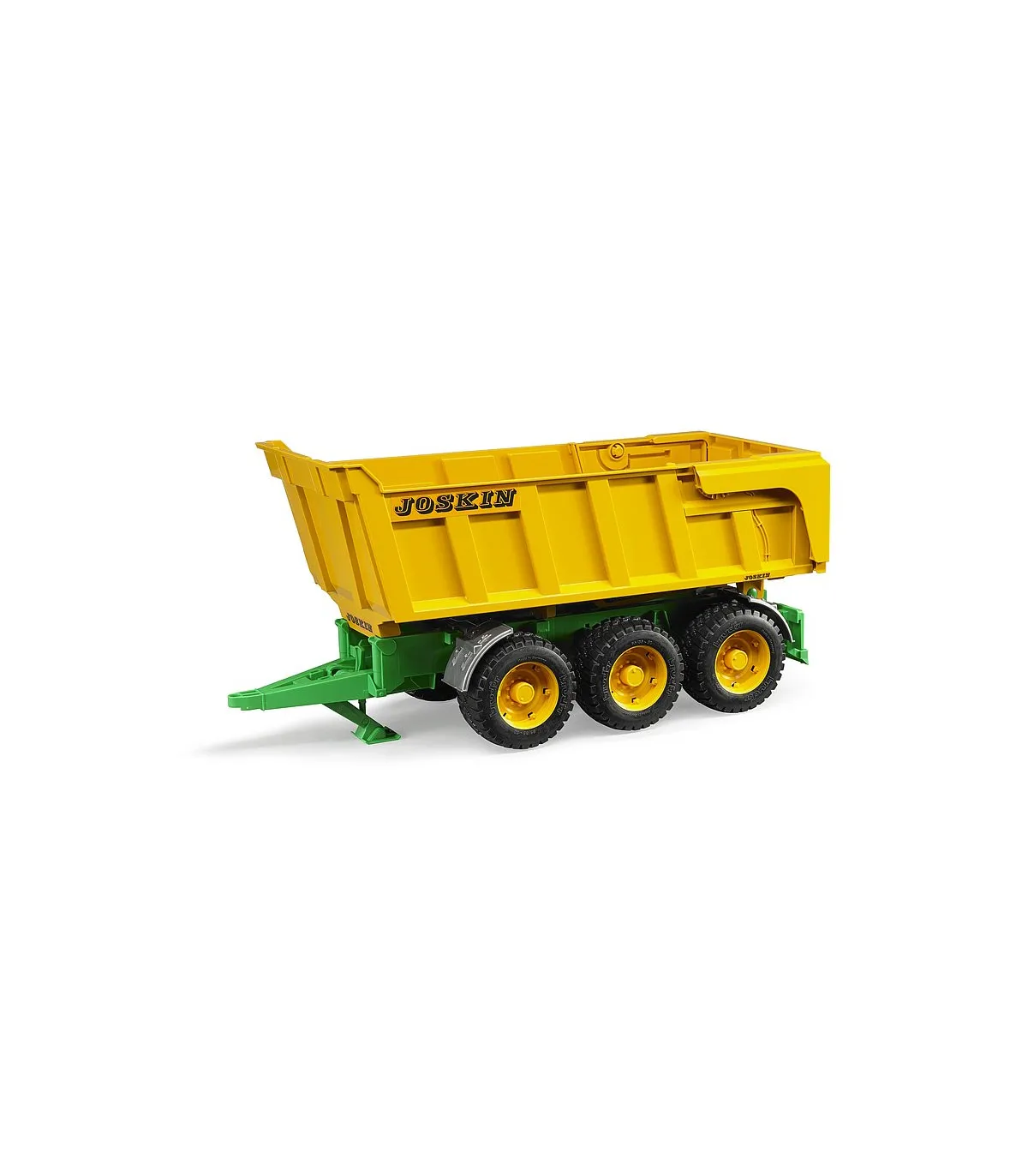 Uno de los remolques basculantes de bañera más grandes y pesados del mercado es el volquete de 3 ejes del fabricante belga Joskin. Diseñados para cargas pesadas y transportes en condiciones extremas, como obras de ingeniería civil o uso agrícola en terrenos difíciles, estos "monstruos" soportan hasta 24 toneladas de carga útil o hasta 29 metros cúbicos de volumen de carga en el original. El impresionante modelo BRUDER fue desarrollado en analogía con la serie original "Trans-SPACE" y, en línea con nuestro eslogan ... "como si fuera real" ... tiene un volquete basculante plegable y bloqueable con apertura automática del portón trasero. El chasis de 3 ejes compensa todos los terrenos irregulares. Este remolque basculante es ideal para los mejores tractores profesionales de la nueva generación, que han estado disponibles desde el otoño de 2004 y ya han encontrado muchos clientes entusiastas. Pero los tractores de la serie Profi y nuestros Unimog (que utilizan un adaptador de acoplamiento) también son adecuados como vehículos de remolque.