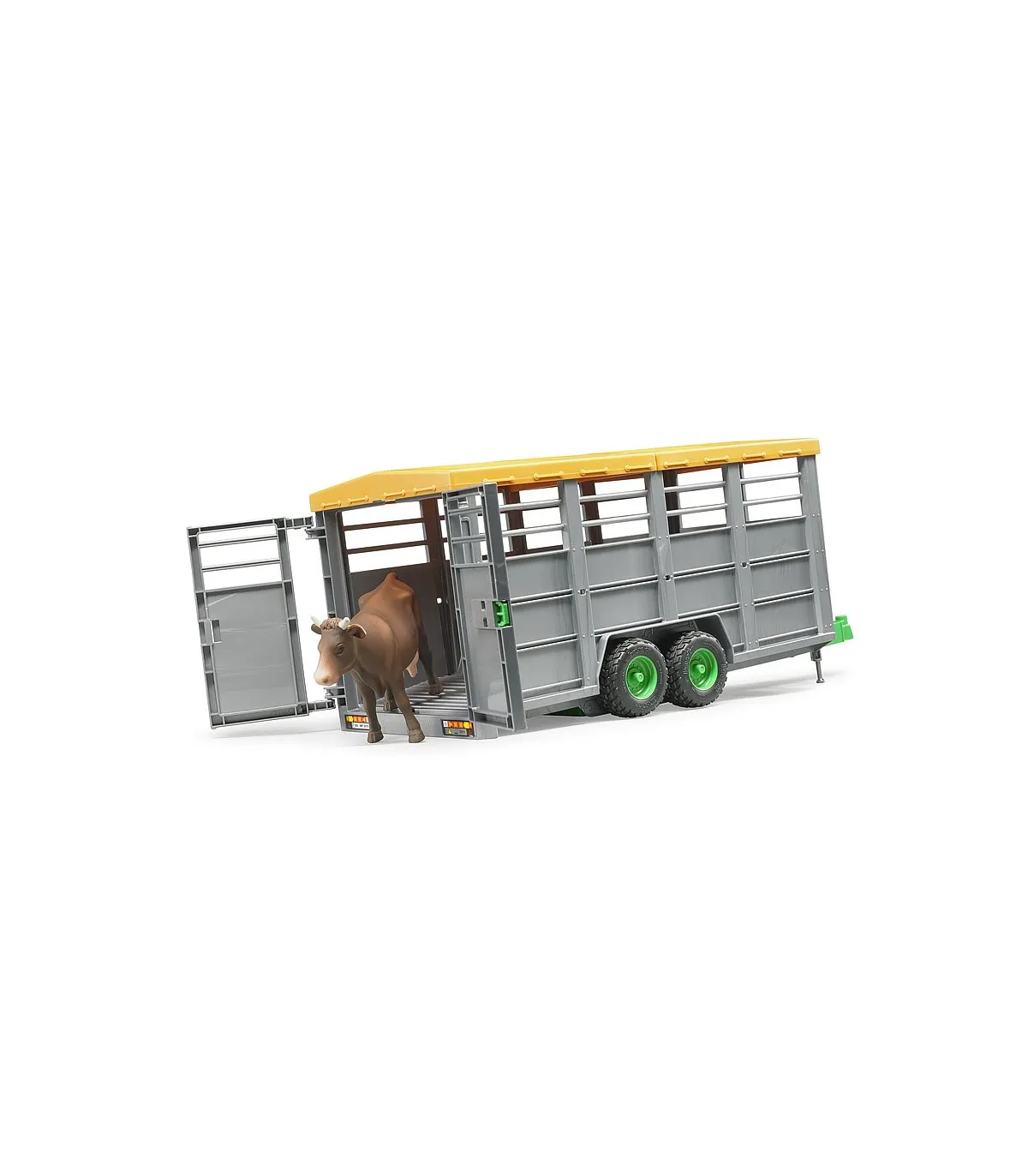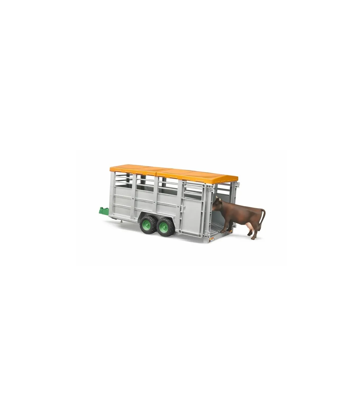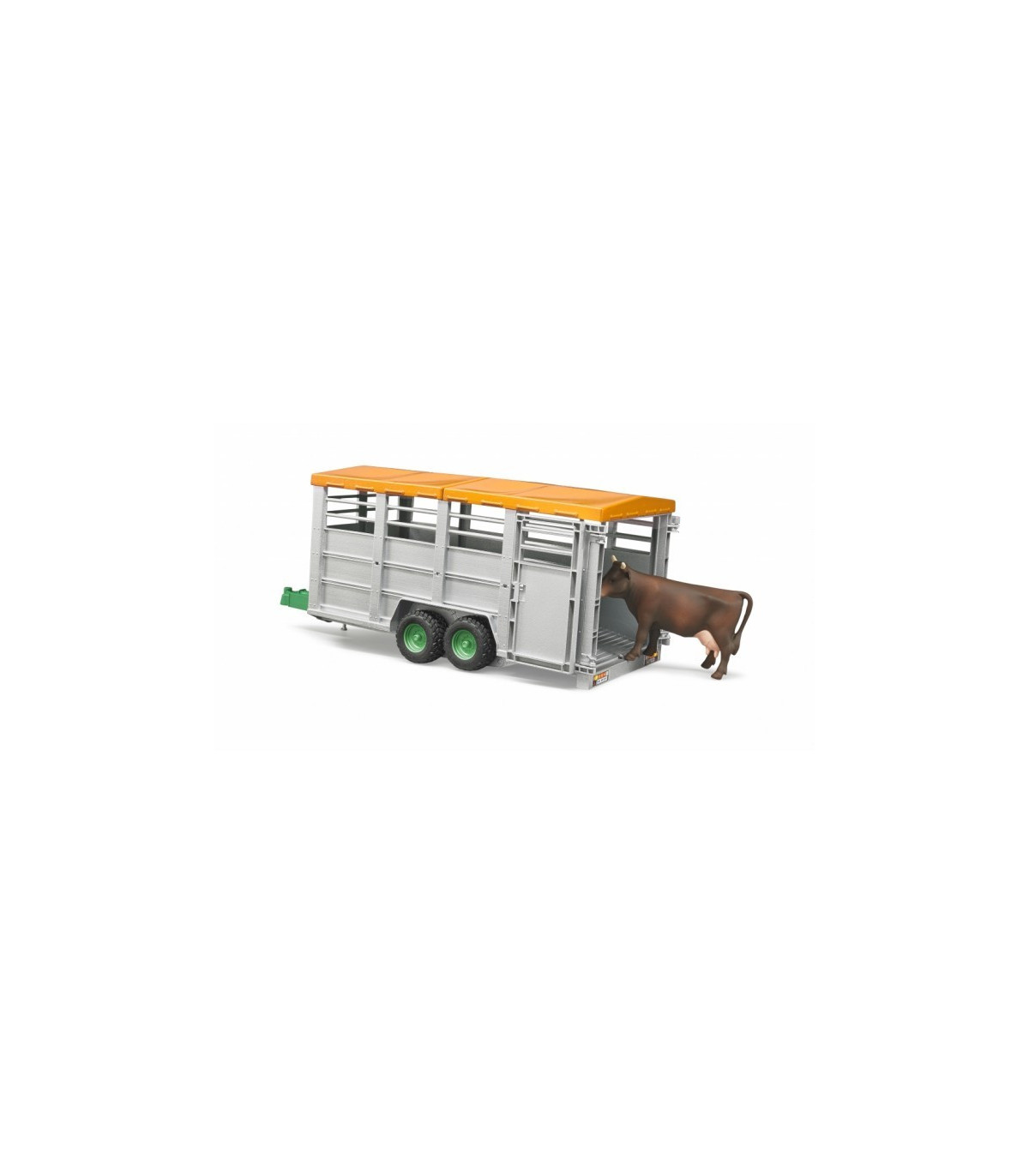 En primavera, muchos animales de granja son llevados a los pastos donde pasan el verano. Para ello, los ganaderos utilizan remolques especiales para ganado para el transporte cuidadoso de los animales. Un remolque de transporte de ganado tan versátil está ahora disponible en la gama BRUDER. Nuestro modelo a escala 1:16 puede, como el original, bajar su plataforma para permitir la fácil carga de los animales y está equipado con una puerta de separación. La lona y las puertas se pueden abrir fácilmente y el remolque se puede combinar con todos los tractores y vehículos con un acoplamiento de remolque estándar. Una vaca ya está incluida en el volumen de suministro, en total el remolque ofrece espacio para 6 animales de nuestros accesorios (n. ° de artículo 2308, 2309 y 2306).
