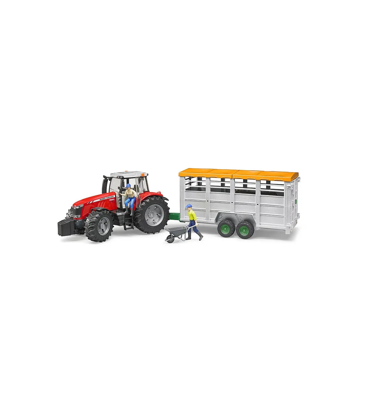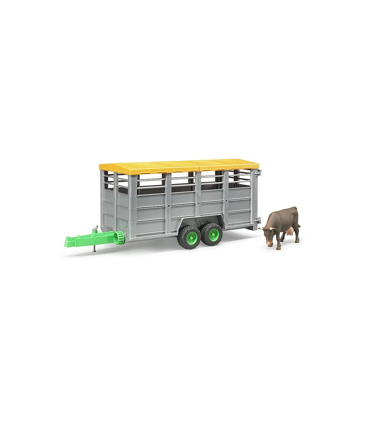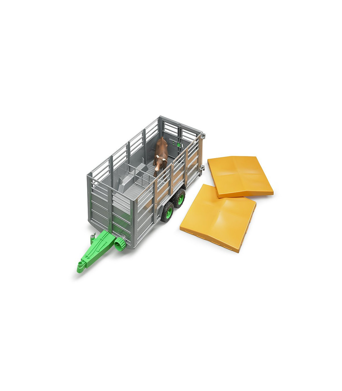 En primavera, muchos animales de granja son llevados a los pastos donde pasan el verano. Para ello, los ganaderos utilizan remolques especiales para ganado para el transporte cuidadoso de los animales. Un remolque de transporte de ganado tan versátil está ahora disponible en la gama BRUDER. Nuestro modelo a escala 1:16 puede, como el original, bajar su plataforma para permitir la fácil carga de los animales y está equipado con una puerta de separación. La lona y las puertas se pueden abrir fácilmente y el remolque se puede combinar con todos los tractores y vehículos con un acoplamiento de remolque estándar. Una vaca ya está incluida en el volumen de suministro, en total el remolque ofrece espacio para 6 animales de nuestros accesorios (n. ° de artículo 2308, 2309 y 2306).