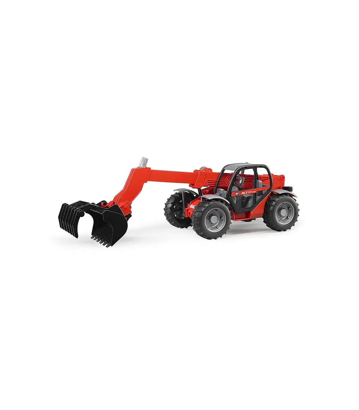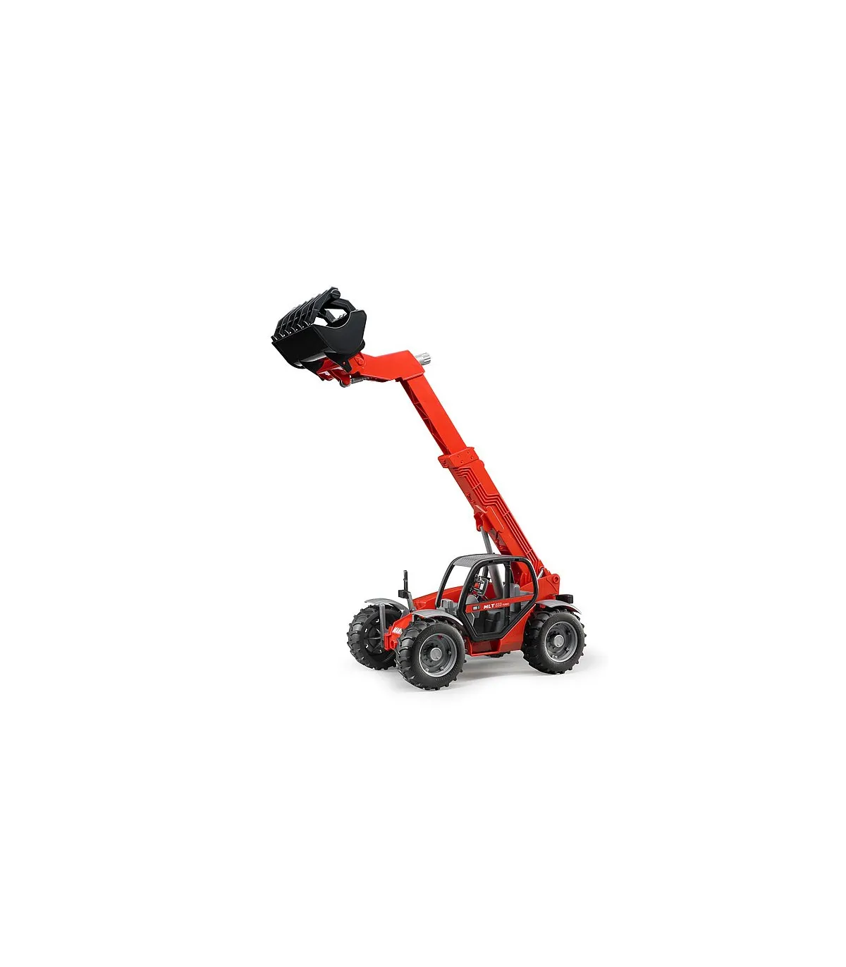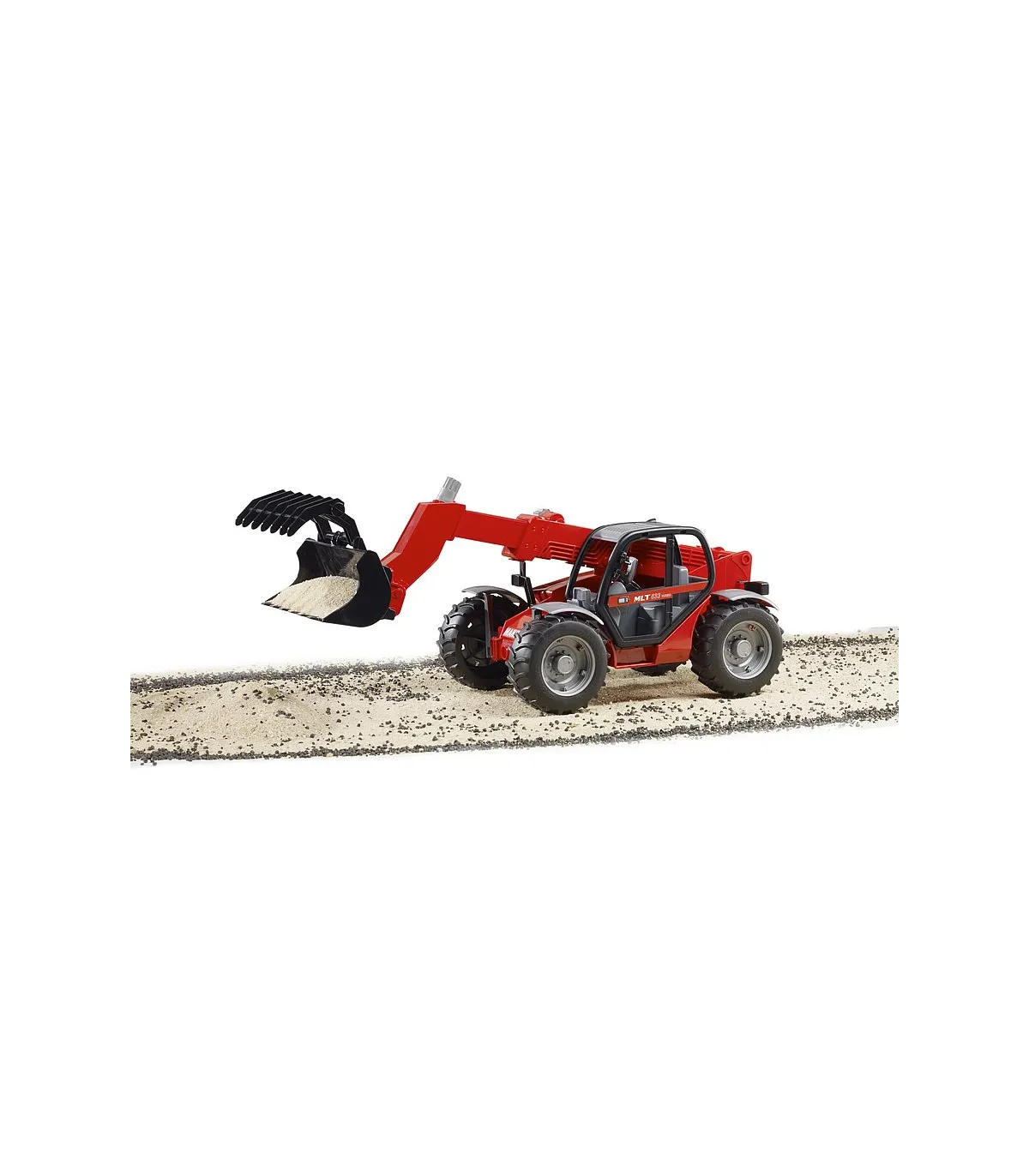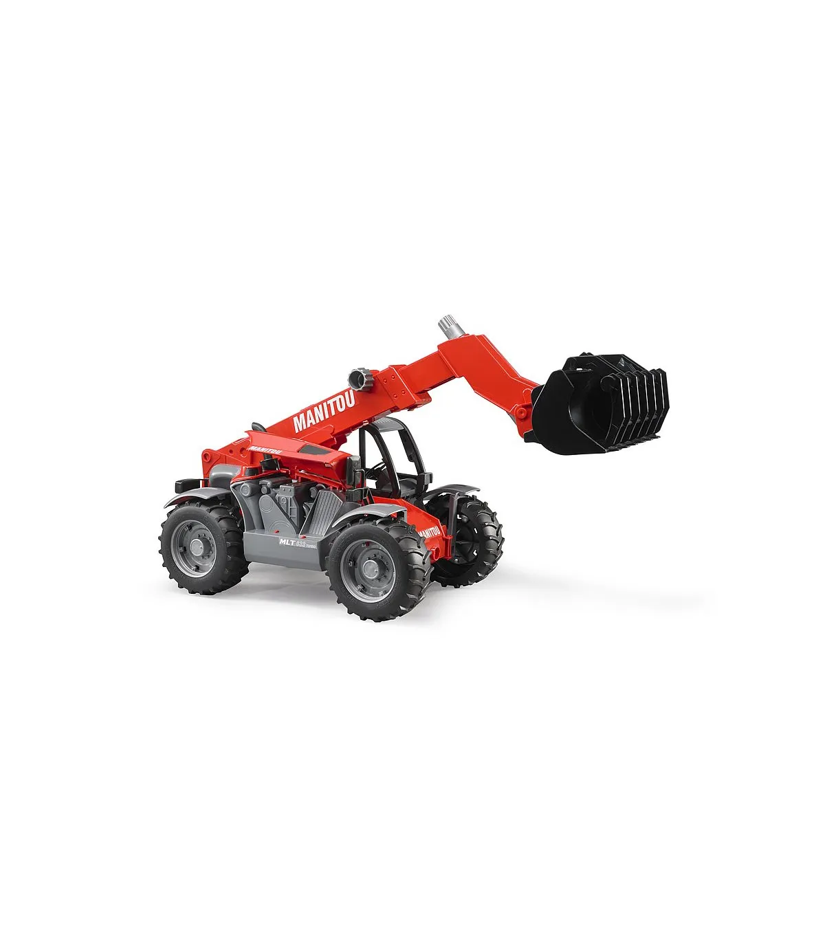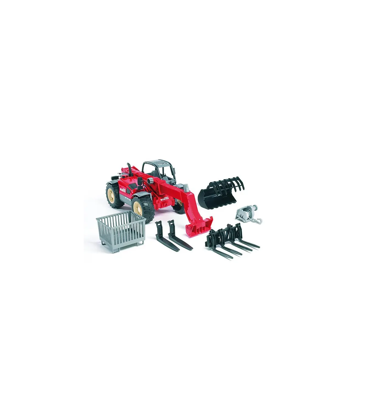 El brazo telescópico se puede extender y ajustar en altura accionando el mando giratorio de arriba. La inclinación de la pinza de la pala también se puede ajustar accionando el mango giratorio lateral y también se puede quitar. El capó se puede abrir y los neumáticos de la banda de rodadura completan el cuadro. Para aumentar la diversión, el manipulador telescópico se puede equipar con el juego de accesorios, número de artículo: 02008 (no incluido).