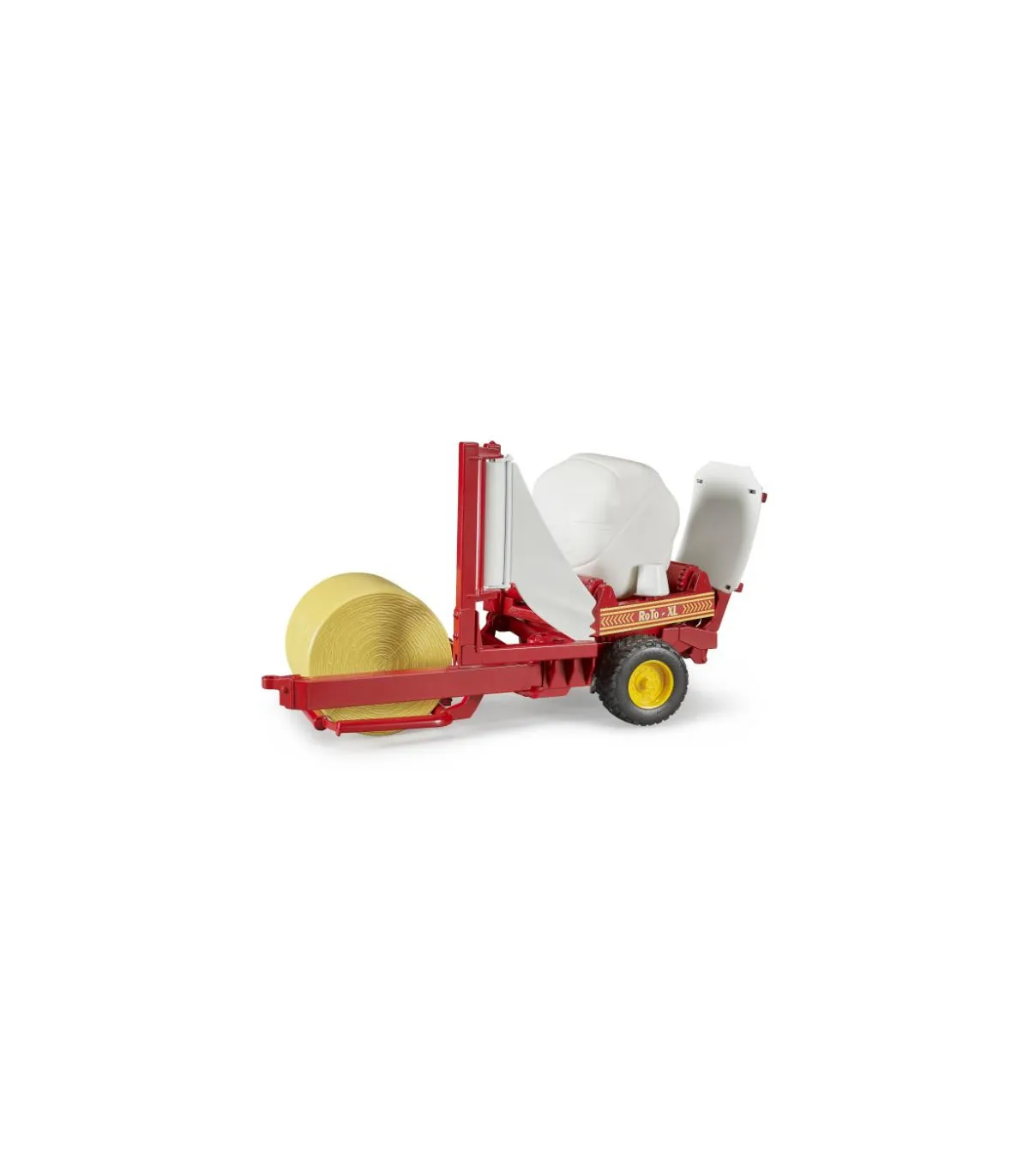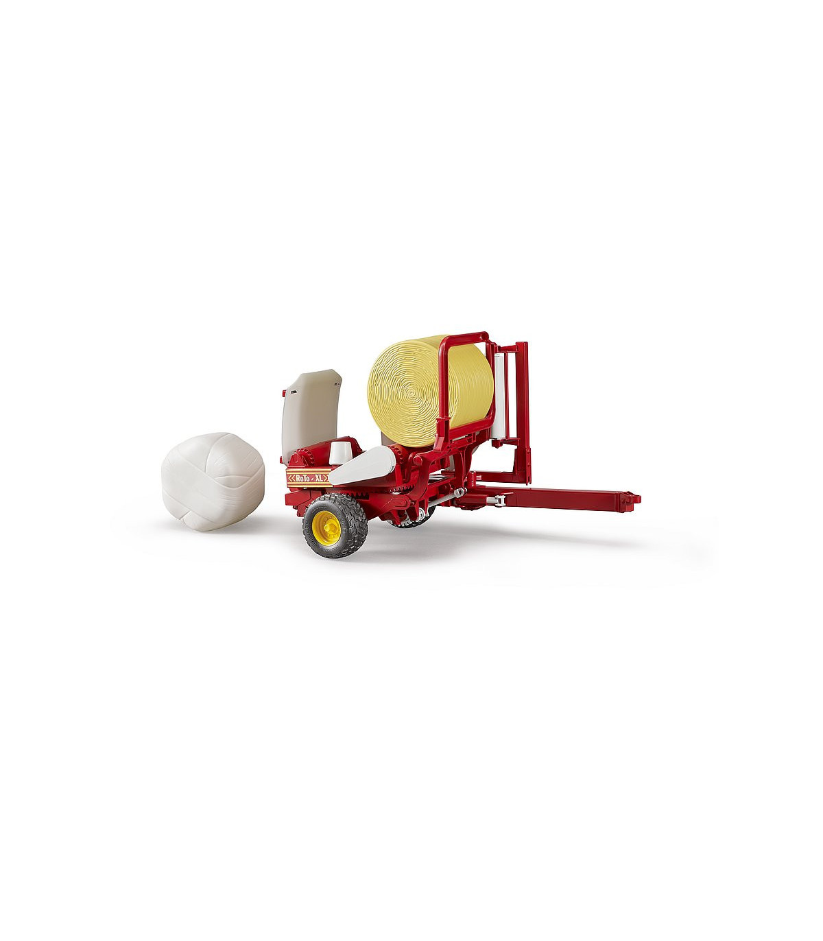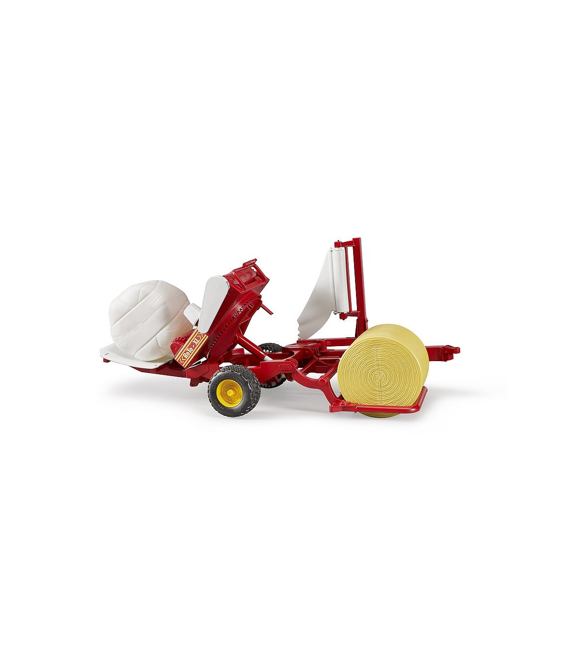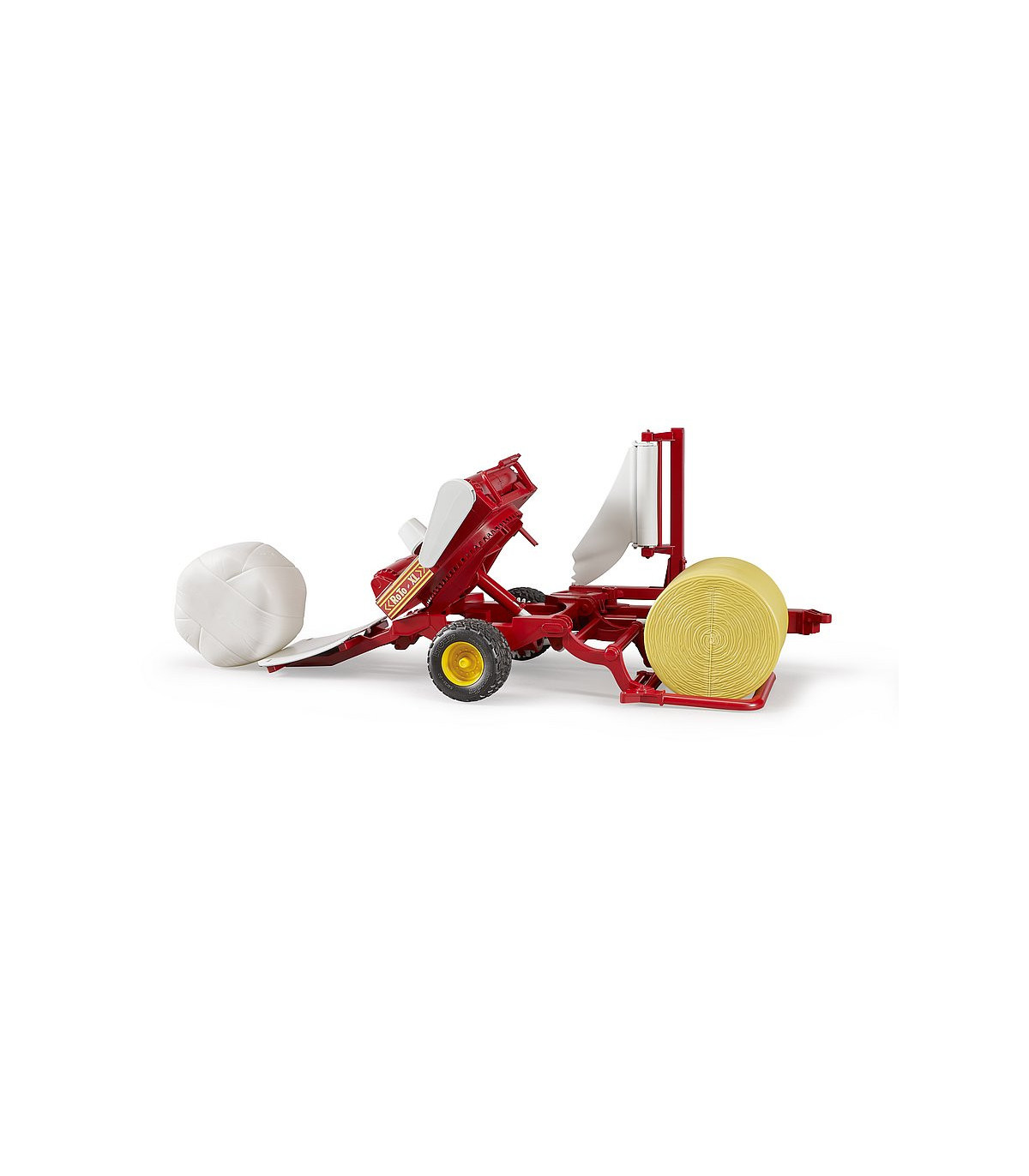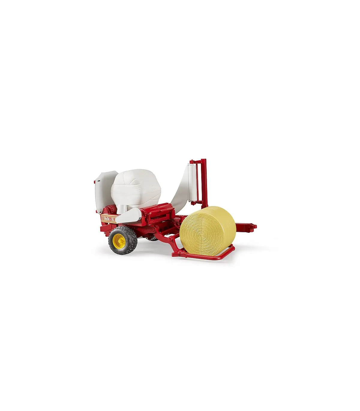 La paca se eleva sobre el plato giratorio con el balancín de carga. Después de bajar el balancín de carga, la plataforma giratoria, que gira automáticamente durante la conducción, se activa y se simula el proceso de encintado. Durante el proceso de encintado, la paca redonda cargada gira alrededor de su eje vertical con la ayuda de la estructura giratoria y al mismo tiempo alrededor del eje axial por medio de los rodillos giratorios accionados. Luego, la paca se inclina sobre el balancín de almacenamiento móvil utilizando el dispositivo de inclinación. En el volumen de suministro se incluyen una bola redonda marrón ocre y una negra. La posición de la barra de tiro se puede ajustar después del uso y los neumáticos de la banda de rodadura completan la imagen. Para complementar el juego, la encintadora se puede combinar con la rotoempacadora Claas Rollant 250, ref.