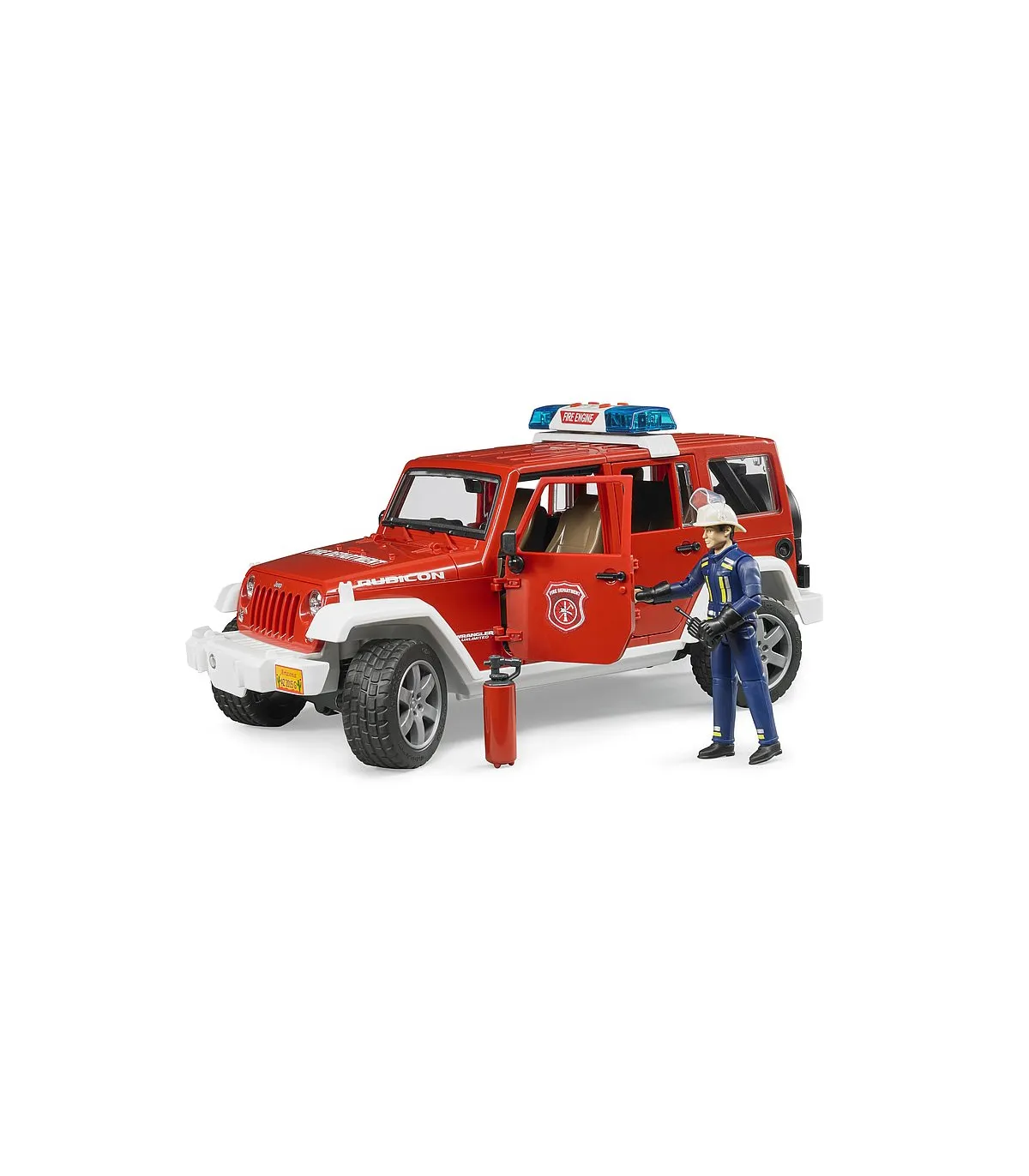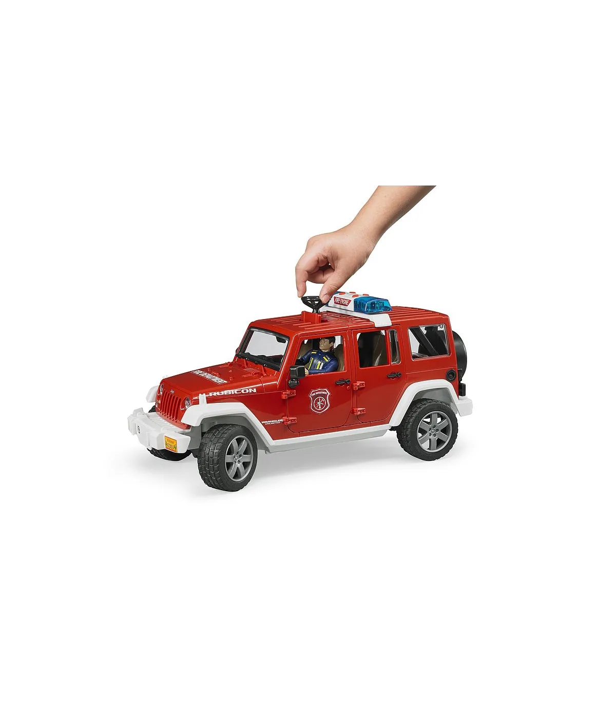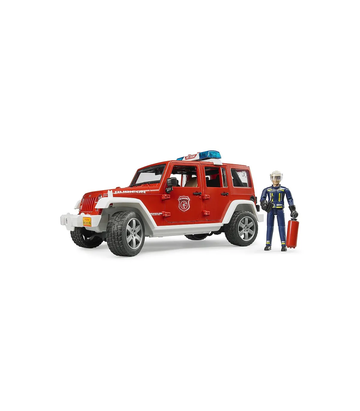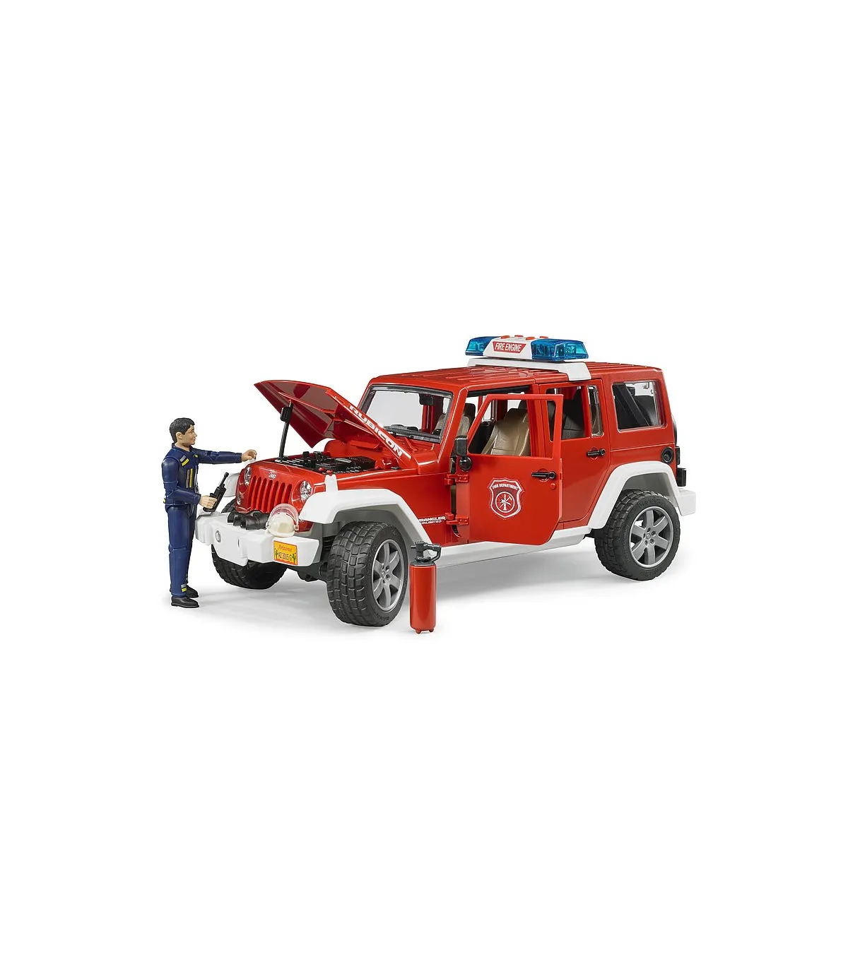 Para coordinar los servicios de los bomberos, así como para prestar auxilio en pequeños casos de emergencia, es indispensable el vehículo de servicio de bomberos. Gracias a su robustez y su capacidad todoterreno, el Jeep Wrangler Unlimited Rubicon es la base ideal para cumplir estas misiones. El jefe de servicio en su vehículo guía coordina los trabajos de rescate de personas y el combate contra el incendio, pero también interviene directamente en las acciones. Como el original, el modelo de BRUDER está equipado con ejes suspendidos para avanzar por todo tipo de terrenos. La dirección por las manguetas del eje con prolongación de la varilla de conducción a través del techo del vehículo permite recrear la intervención de los bomberos. Las puertas, el capó del motor y el espacio de carga se pueden abrir y cargar rápidamente. La figura del bombero puede equiparse con los accesorios que vienen con el juguete, entre ellos el extintor y el aparato de radio. La luz de emergencia con sirena en el techo despeja el camino hasta el lugar del incendio. Además de tres diferentes sonidos de sirena, también se puede generar el ruido del motor del vehículo. Ese es el grado de realismo