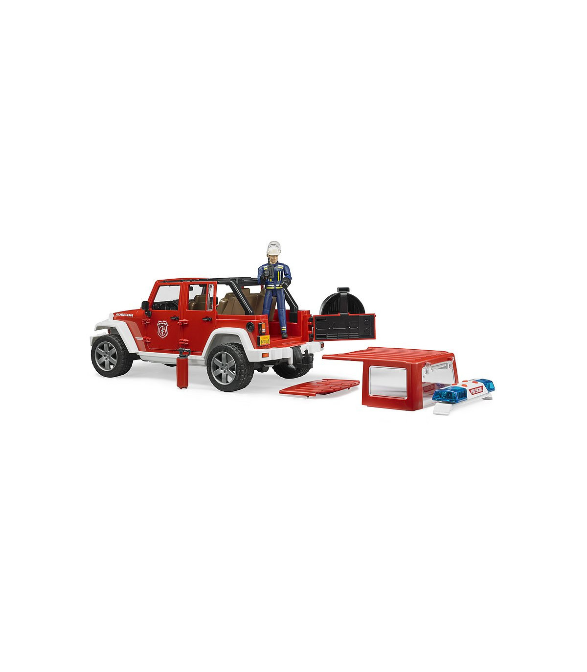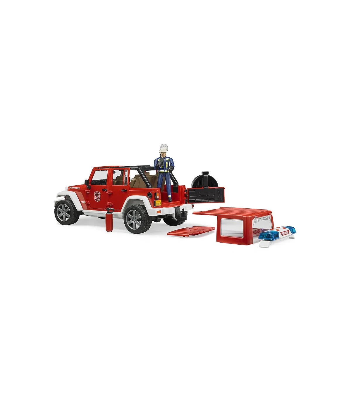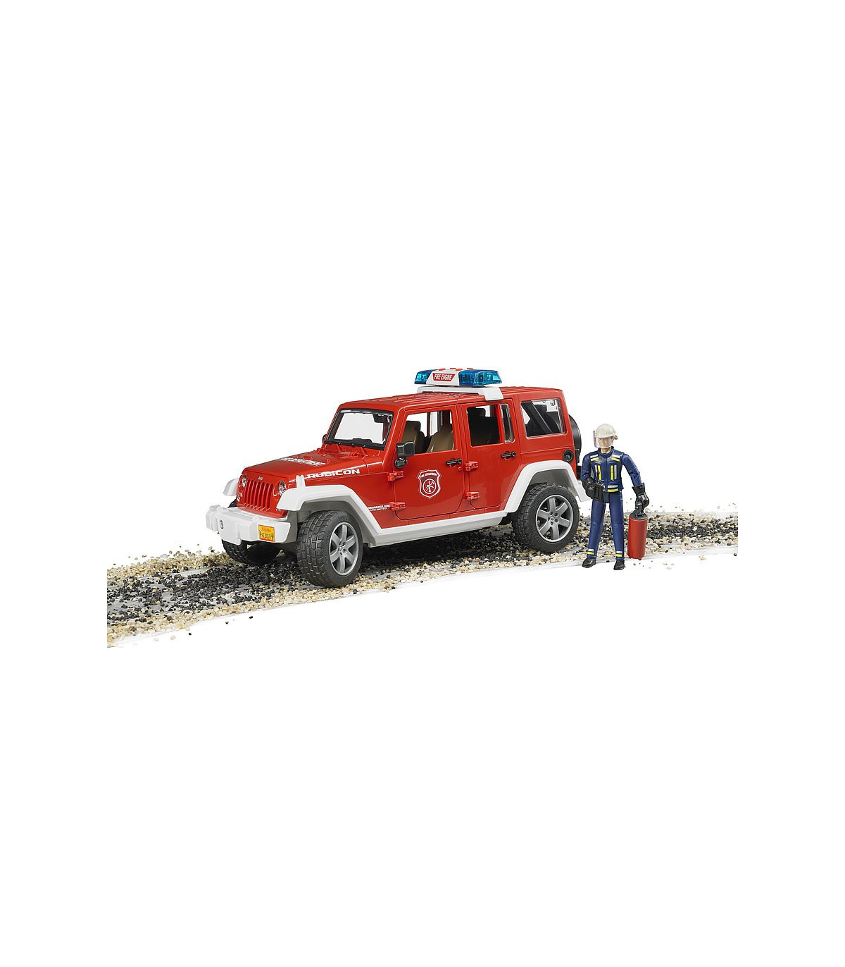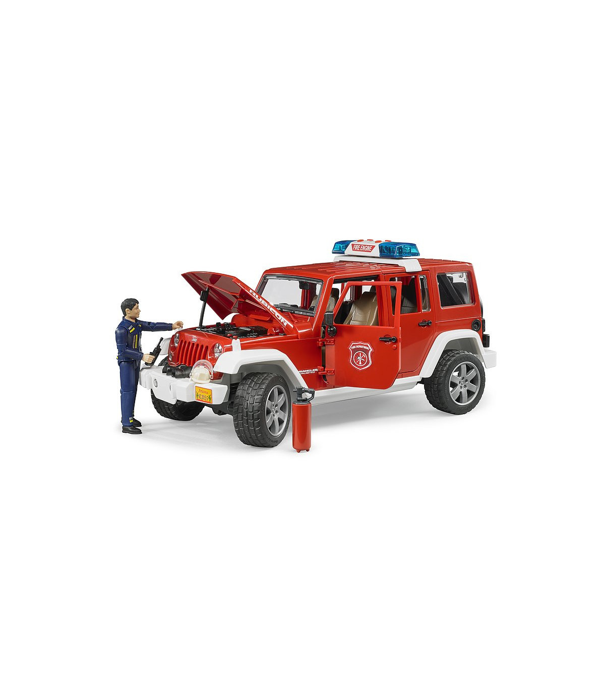 Para coordinar los servicios de los bomberos, así como para prestar auxilio en pequeños casos de emergencia, es indispensable el vehículo de servicio de bomberos. Gracias a su robustez y su capacidad todoterreno, el Jeep Wrangler Unlimited Rubicon es la base ideal para cumplir estas misiones. El jefe de servicio en su vehículo guía coordina los trabajos de rescate de personas y el combate contra el incendio, pero también interviene directamente en las acciones. Como el original, el modelo de BRUDER está equipado con ejes suspendidos para avanzar por todo tipo de terrenos. La dirección por las manguetas del eje con prolongación de la varilla de conducción a través del techo del vehículo permite recrear la intervención de los bomberos. Las puertas, el capó del motor y el espacio de carga se pueden abrir y cargar rápidamente. La figura del bombero puede equiparse con los accesorios que vienen con el juguete, entre ellos el extintor y el aparato de radio. La luz de emergencia con sirena en el techo despeja el camino hasta el lugar del incendio. Además de tres diferentes sonidos de sirena, también se puede generar el ruido del motor del vehículo. Ese es el grado de realismo