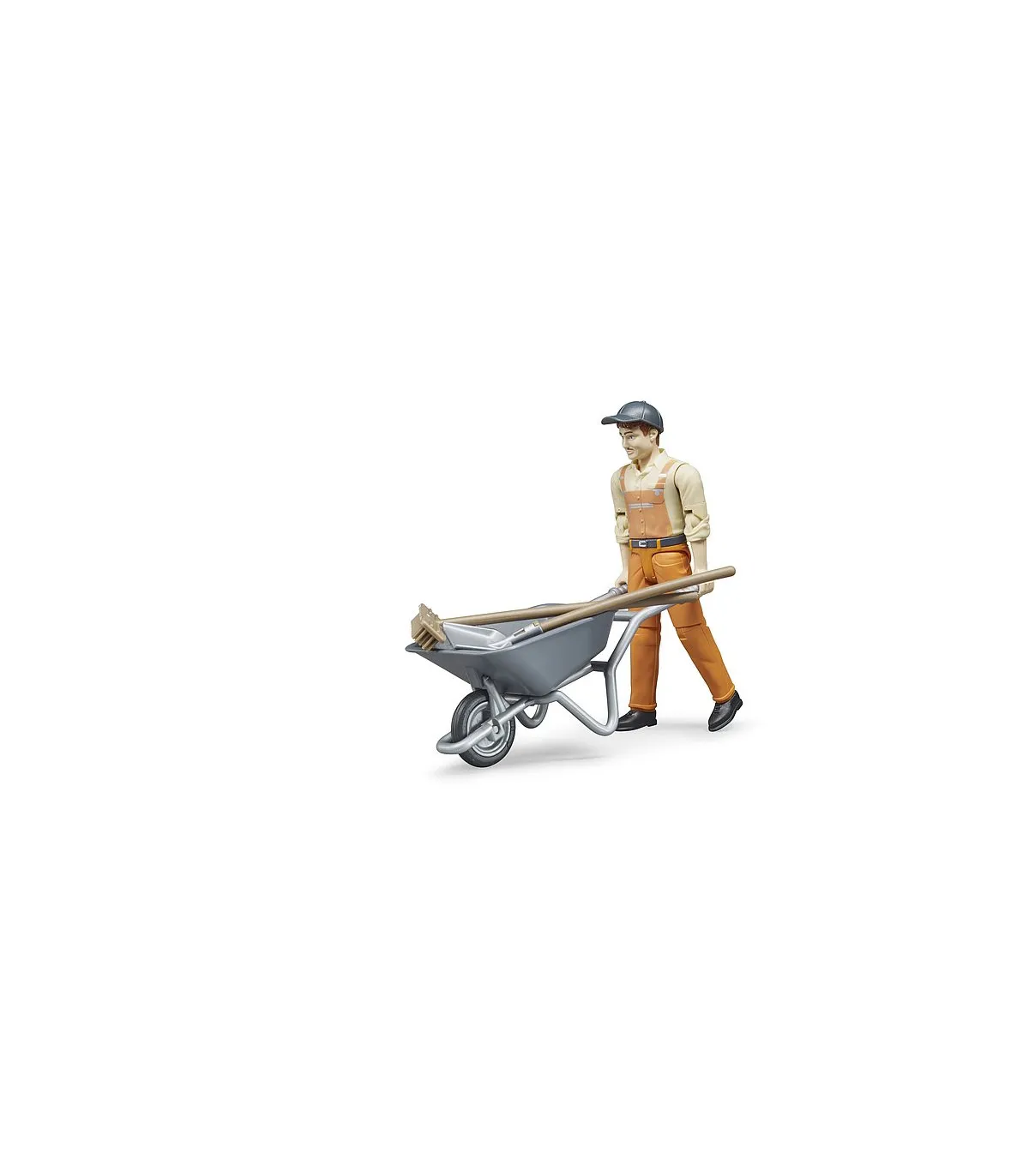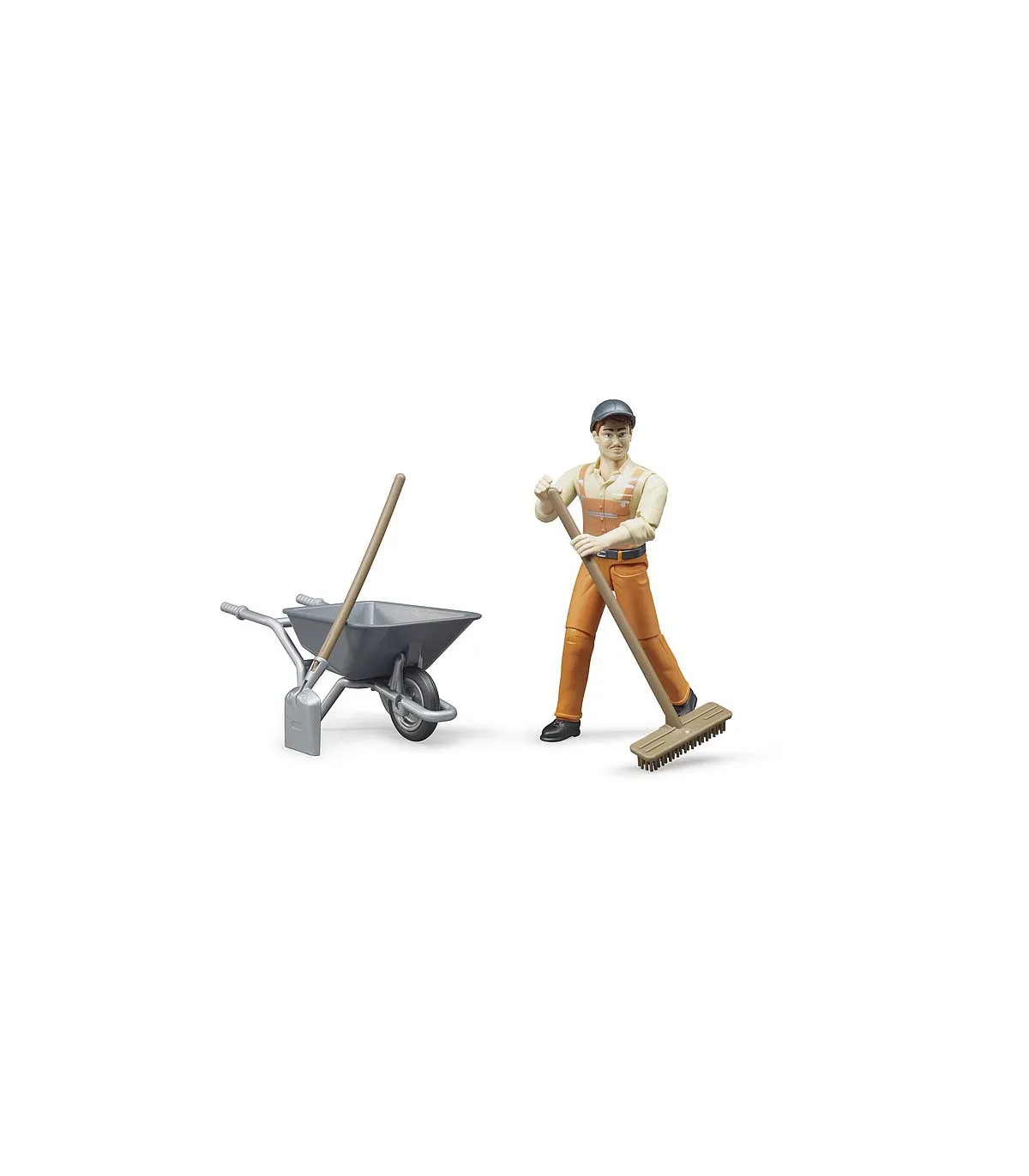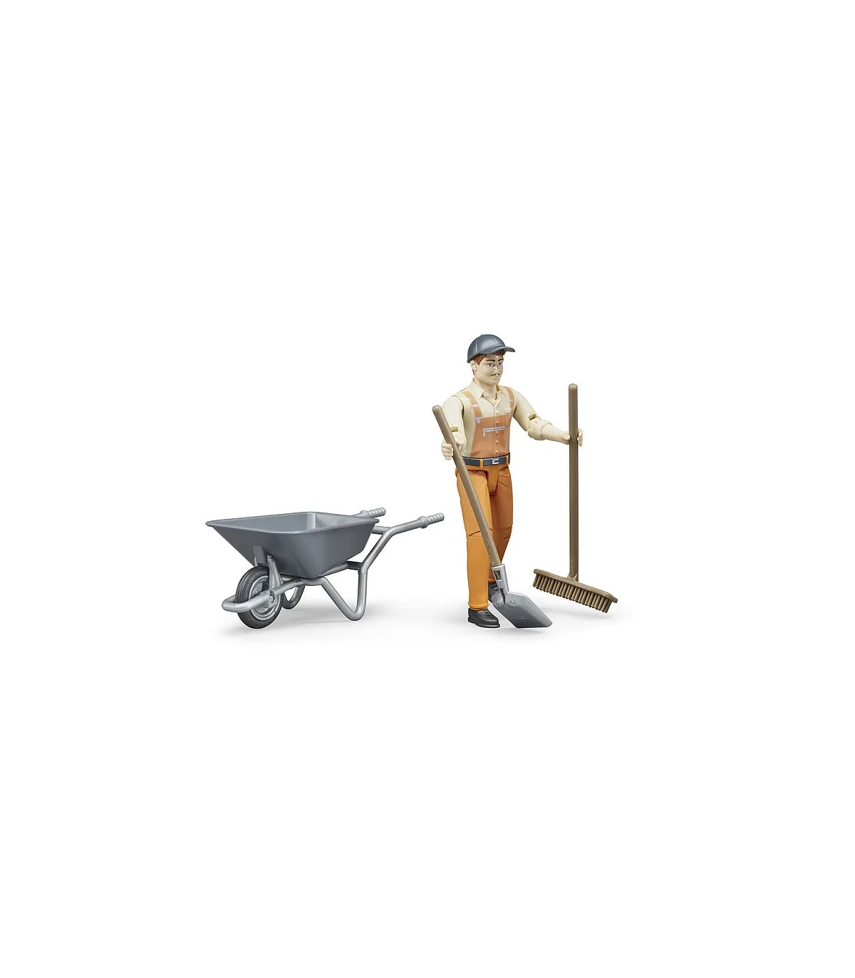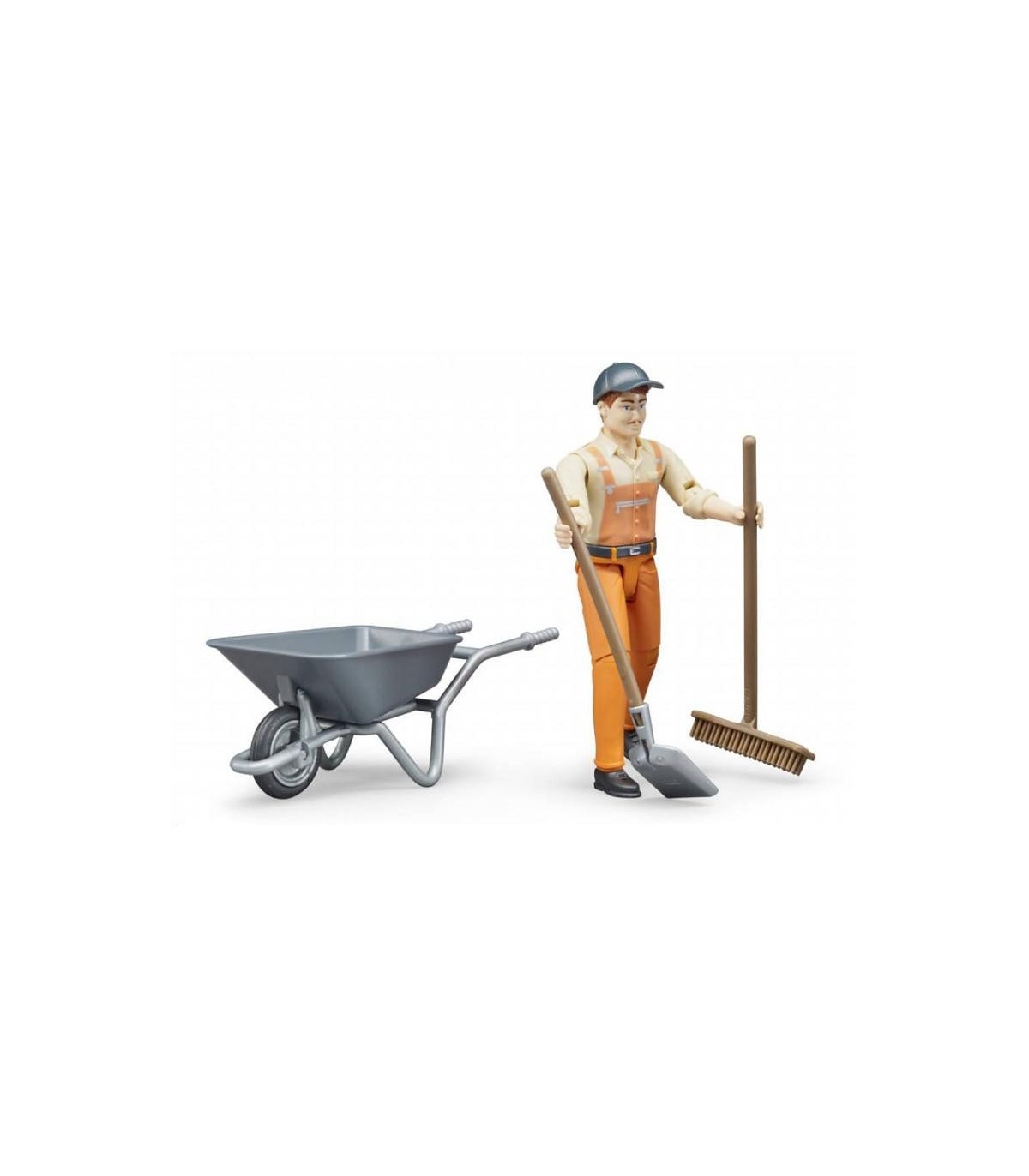 Las tareas del trabajador municipal son muy diversas. Se encarga de dar seguridad a las obras y los lugares donde pueden ocurrir accidentes, revisa las vías de circulación para detectar daños y ejecuta obras pequeñas. Quita suciedades, cuida las zonas verdes, realiza trabajos de retirada de nieve y esparce sales de deshielo. Para recrear con realismo estas tareas tan variadas, el nuevo set de figura de trabajador municipal es el complemento ideal para los numerosos vehículos de construcción y vehículos de servicio de BRUDER. La figura móvil con carretilla, pala y escoba ofrece muchas posibilidades para escenas de juego creativas en la habitación de los niños.
