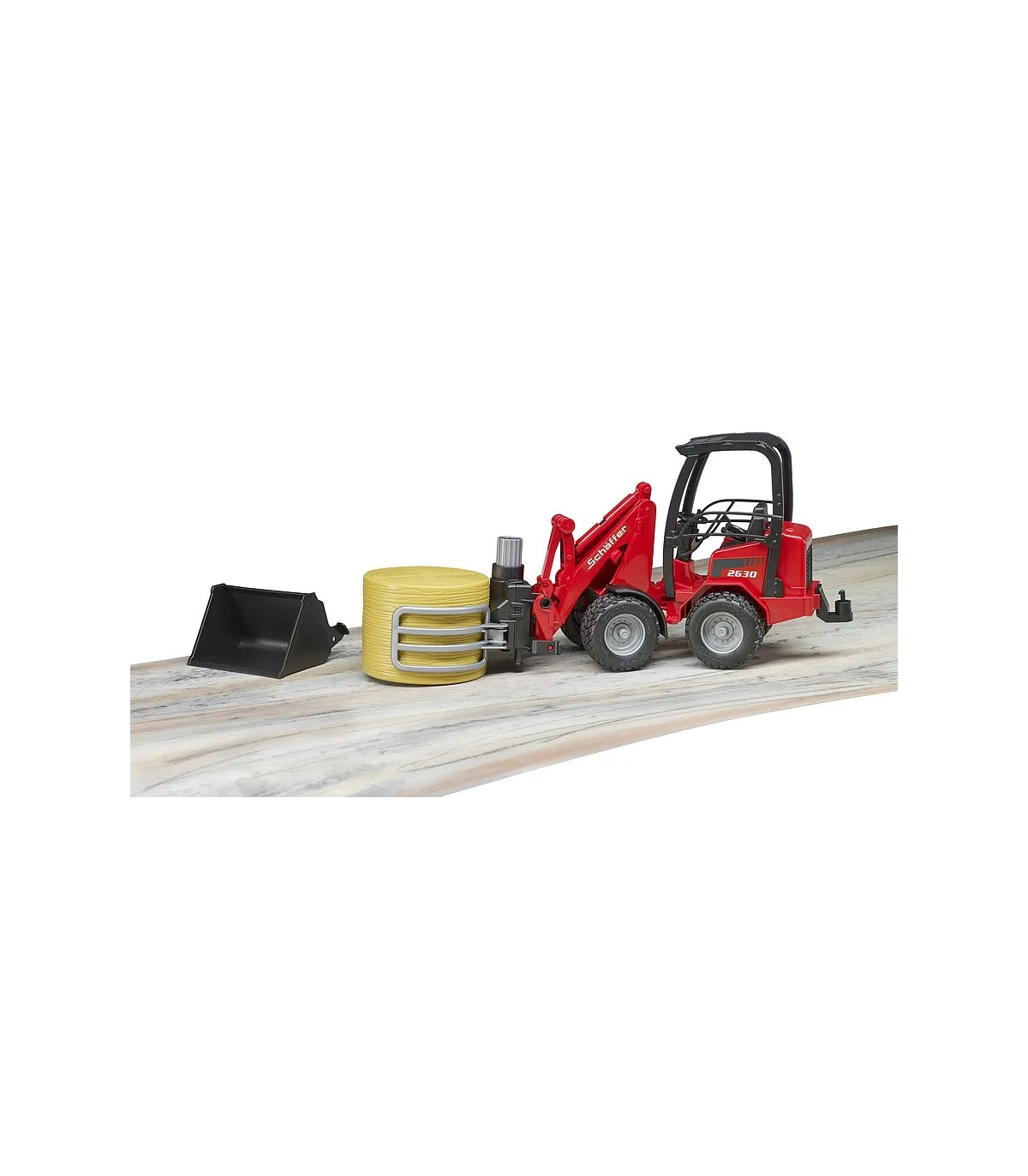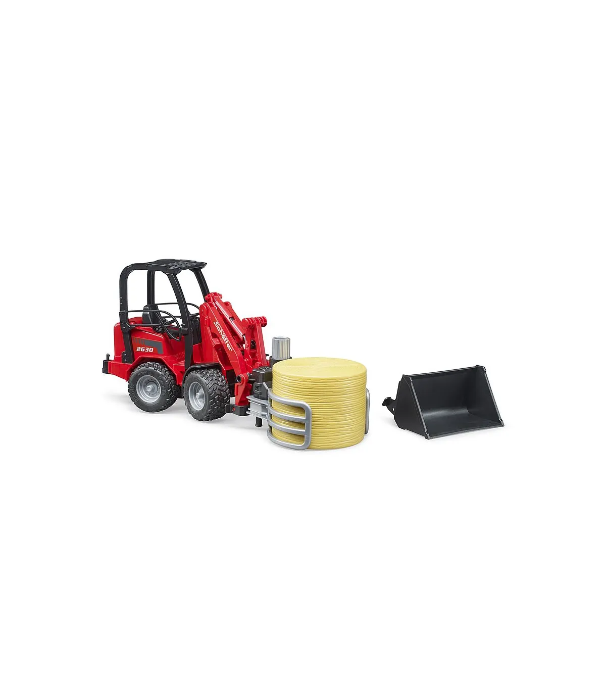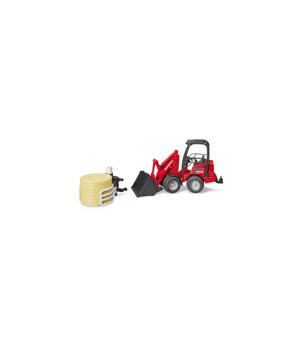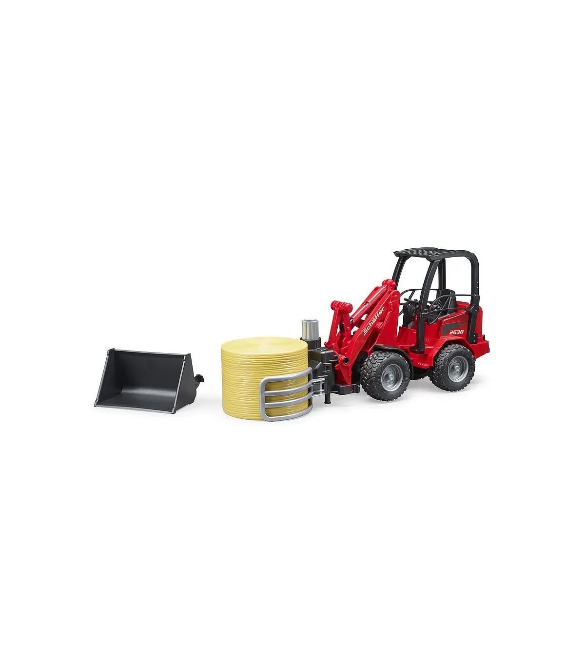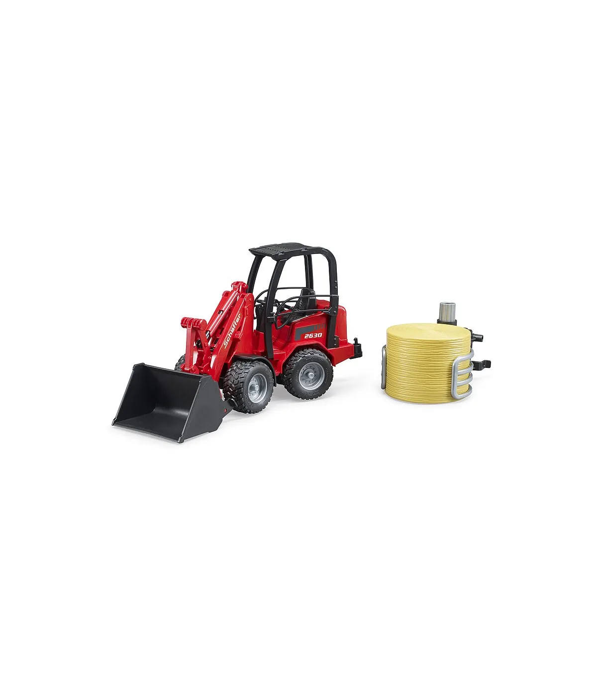 Schäffer lleva más de 50 años desarrollando cargadoras de ruedas para agricultura, jardinería y paisajismo. La clase compacta 2000 es una de las series más exitosas de Schäffer. Ofrecer el máximo rendimiento en los espacios más pequeños, esa es la premisa de esta cargadora. Este vehículo importante y convincentemente versátil para todas las explotaciones agrícolas exitosas está ahora disponible de BRUDER en una escala de 1:16 en combinación con una pinza para balas. Para una máxima maniobrabilidad, el vehículo, como el original, tiene una dirección articulada que funciona y el brazo de carga y la pala también funcionan como el modelo más grande. Para la seguridad de la figura de bworld, que cabe cómodamente en el asiento del conductor, hay una barra antivuelco masiva. La nueva pinza de bolas es una ayuda muy útil para el transporte y distribución de paja y heno. lo que ayuda a todos los pequeños agricultores a transportar la paca redonda suministrada al establo y descargarla. La pinza se abre y se cierra simplemente girando la rueda de ajuste superior.