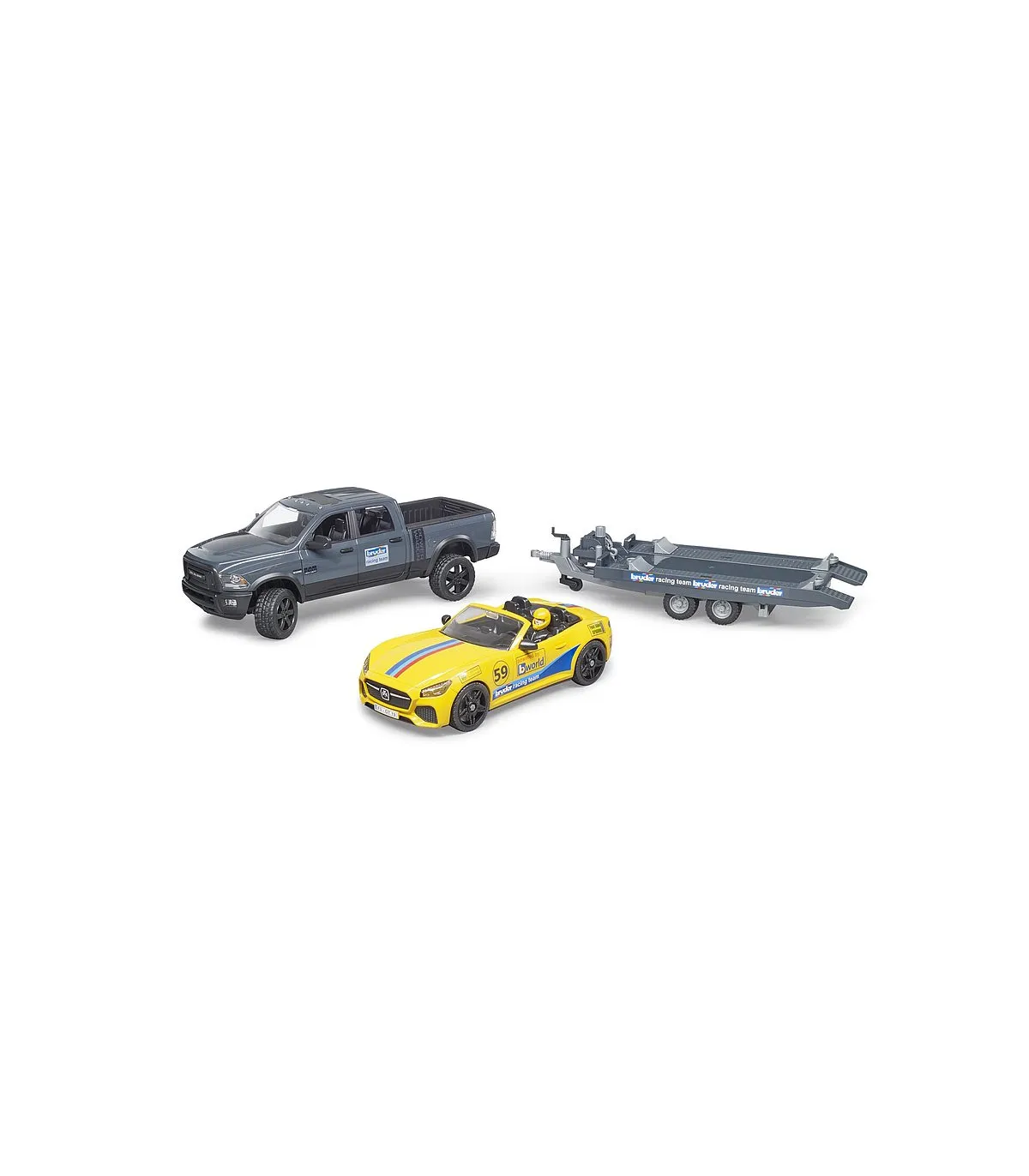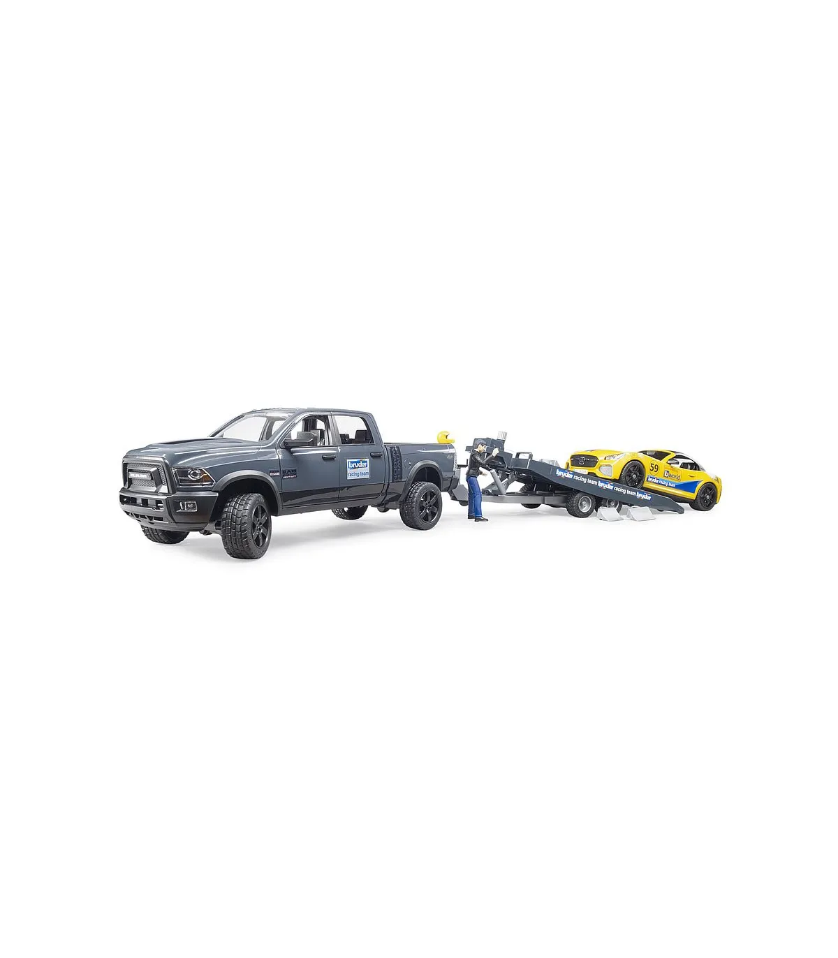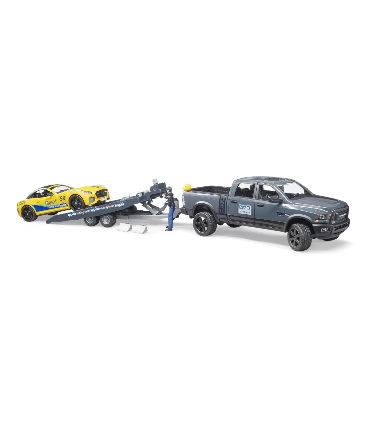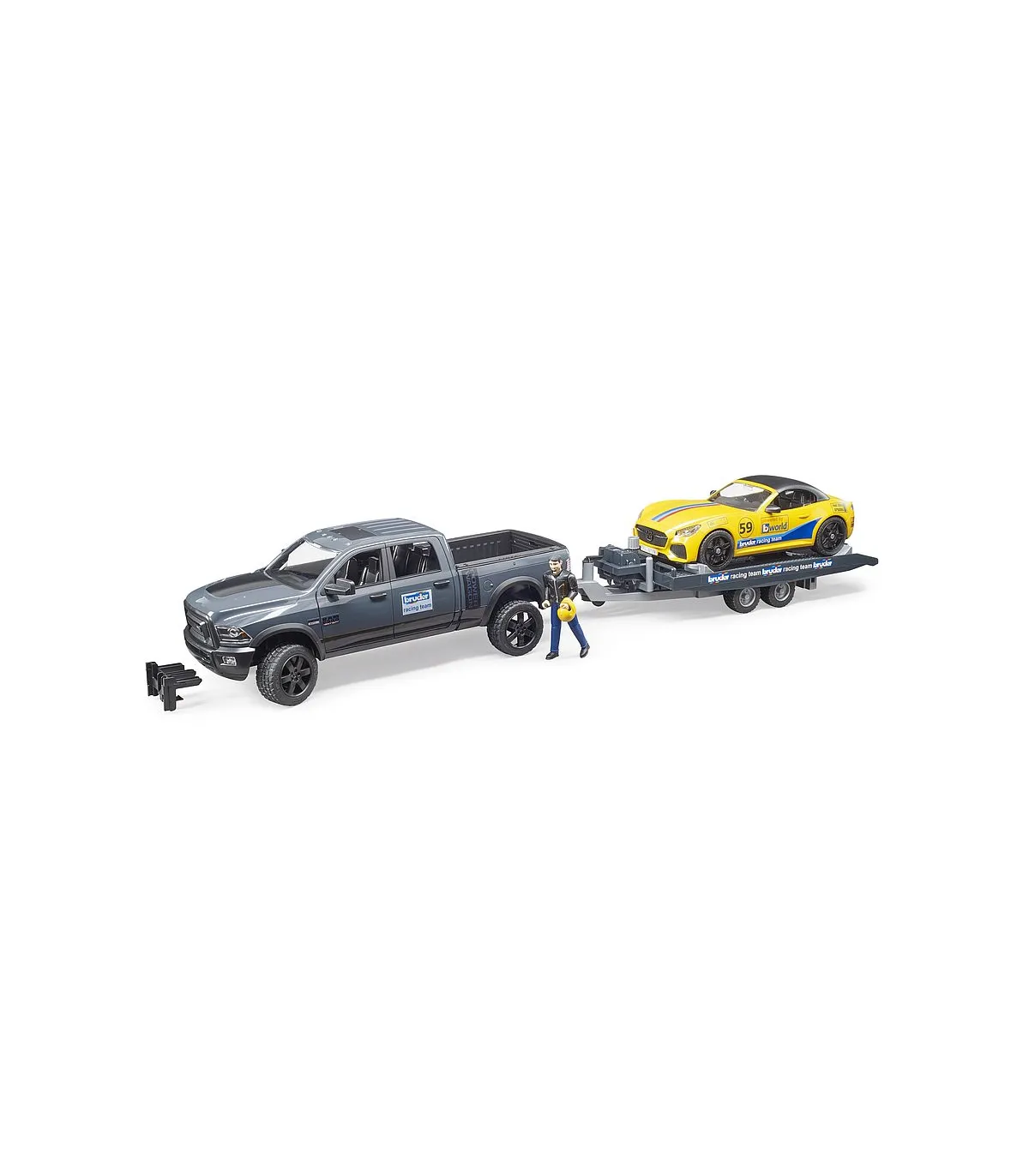 Los deportes de motor generan un gran entusiasmo en pequeños y grandes. Esto no debería sorprendernos si pensamos en la emoción, las sensaciones fuertes y la gran velocidad de los coches deportivos. Tampoco BRUDER puede sustraerse a esta fascinación. Con el RAM Power Wagon, junto con los coches deportivos tuneados del equipo de carreras de BRUDER, se ofrece ahora un nuevo e interesante camión de remolque en el mundo recreativo bworld. El RAM Power Wagon es un vehículo potente con hasta 410 caballos y tracción en todas las ruedas que transporta magníficamente los coches deportivos hasta la pista. Este camión, con sus cuatro puertas que pueden abrirse, se puede maniobrar fácilmente mediante la popular prolongación del volante.