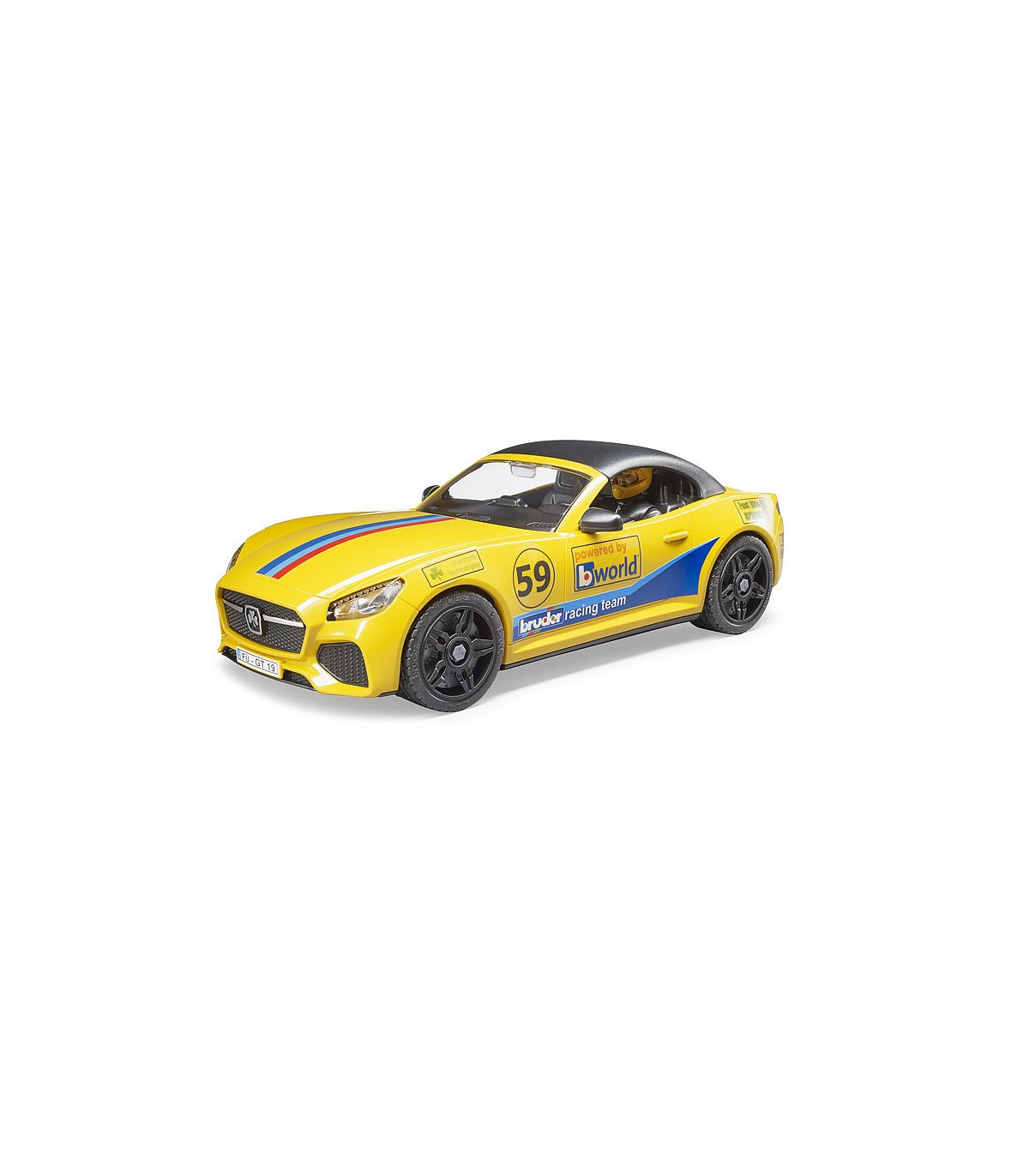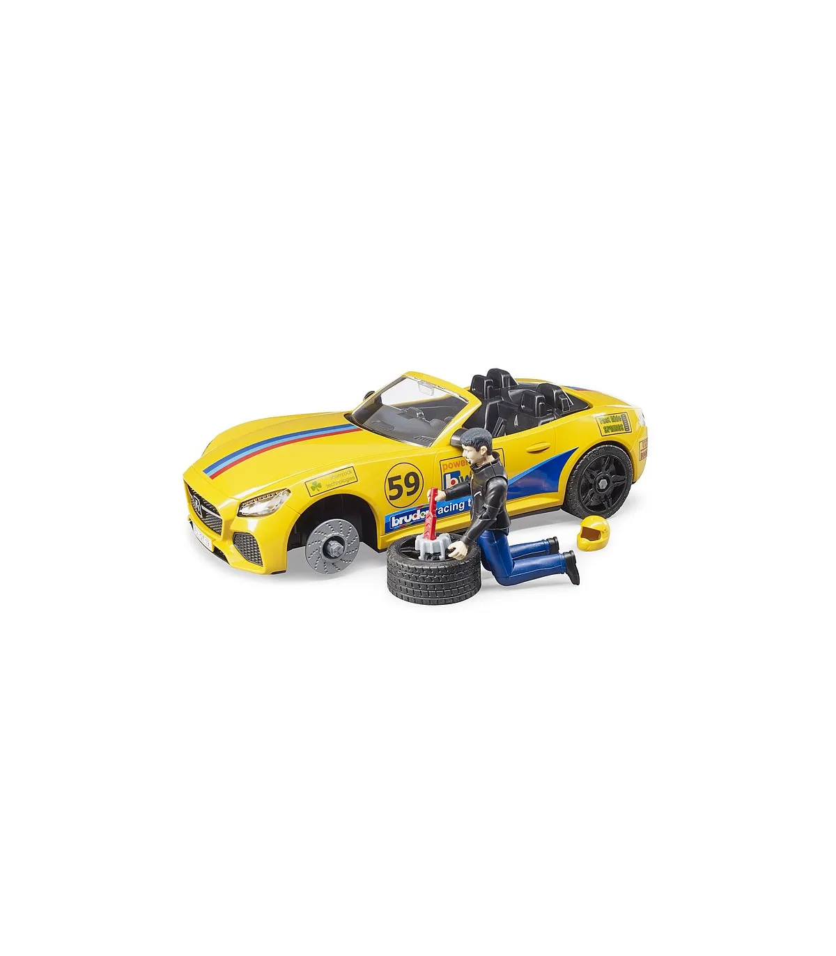 Para el transporte seguro y la carga, este remolque está equipado con una plataforma basculante, calces y un torno de cable. El descapotable posee una capota desmontable a través de la cual el piloto, incluido en el set, puede colocarse en el automóvil. Además, este coche deportivo está equipado con el nuevo sistema de cambio de ruedas de BRUDER. Para que todos los pequeños pilotos puedan personalizar sus coches se incluye una hoja grande con muchas pegatinas.