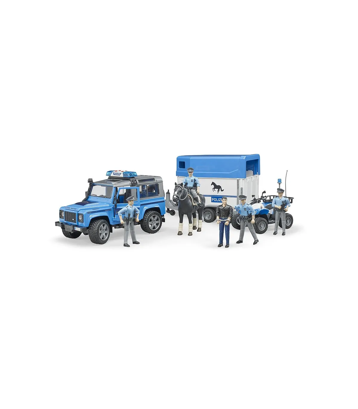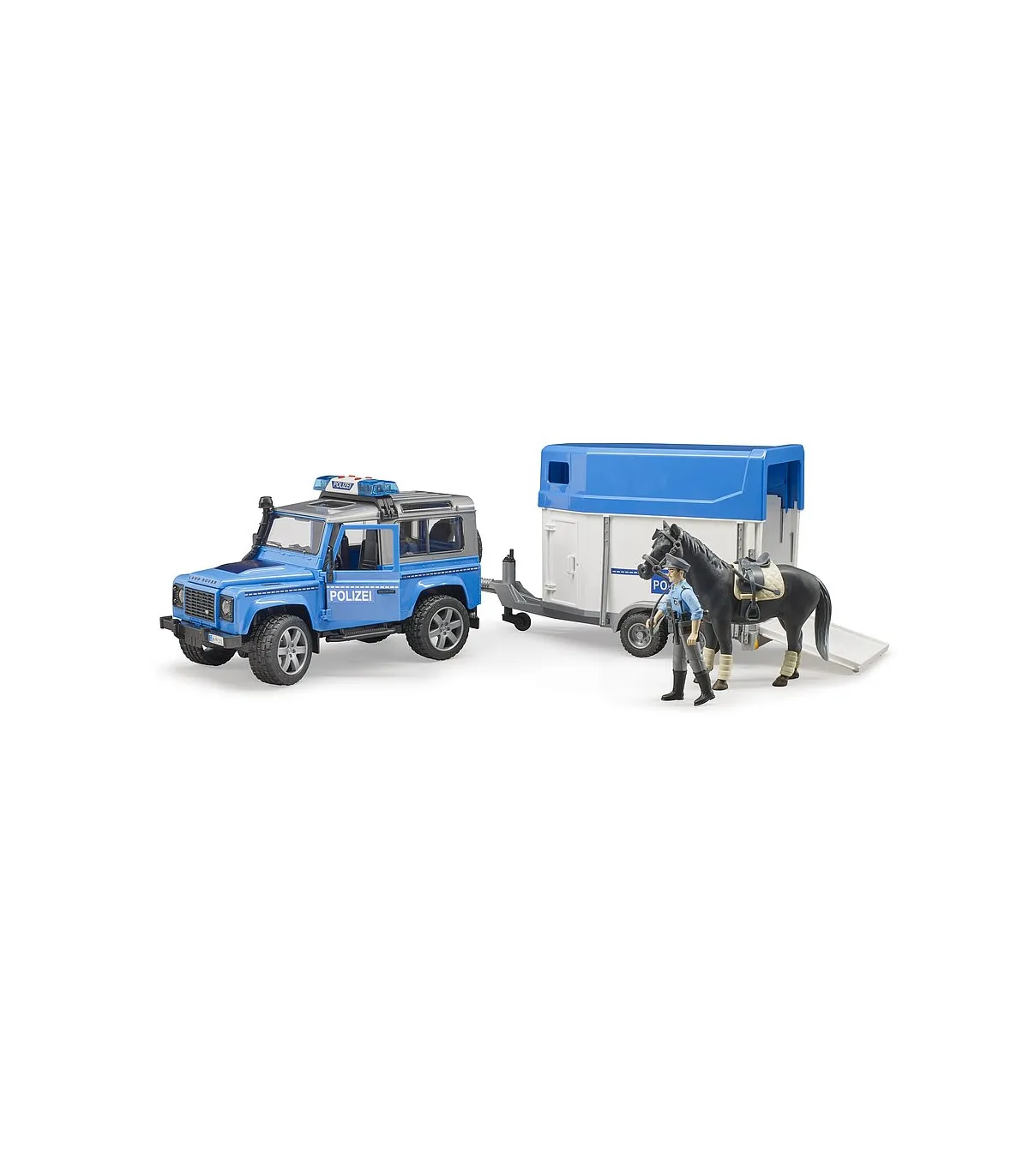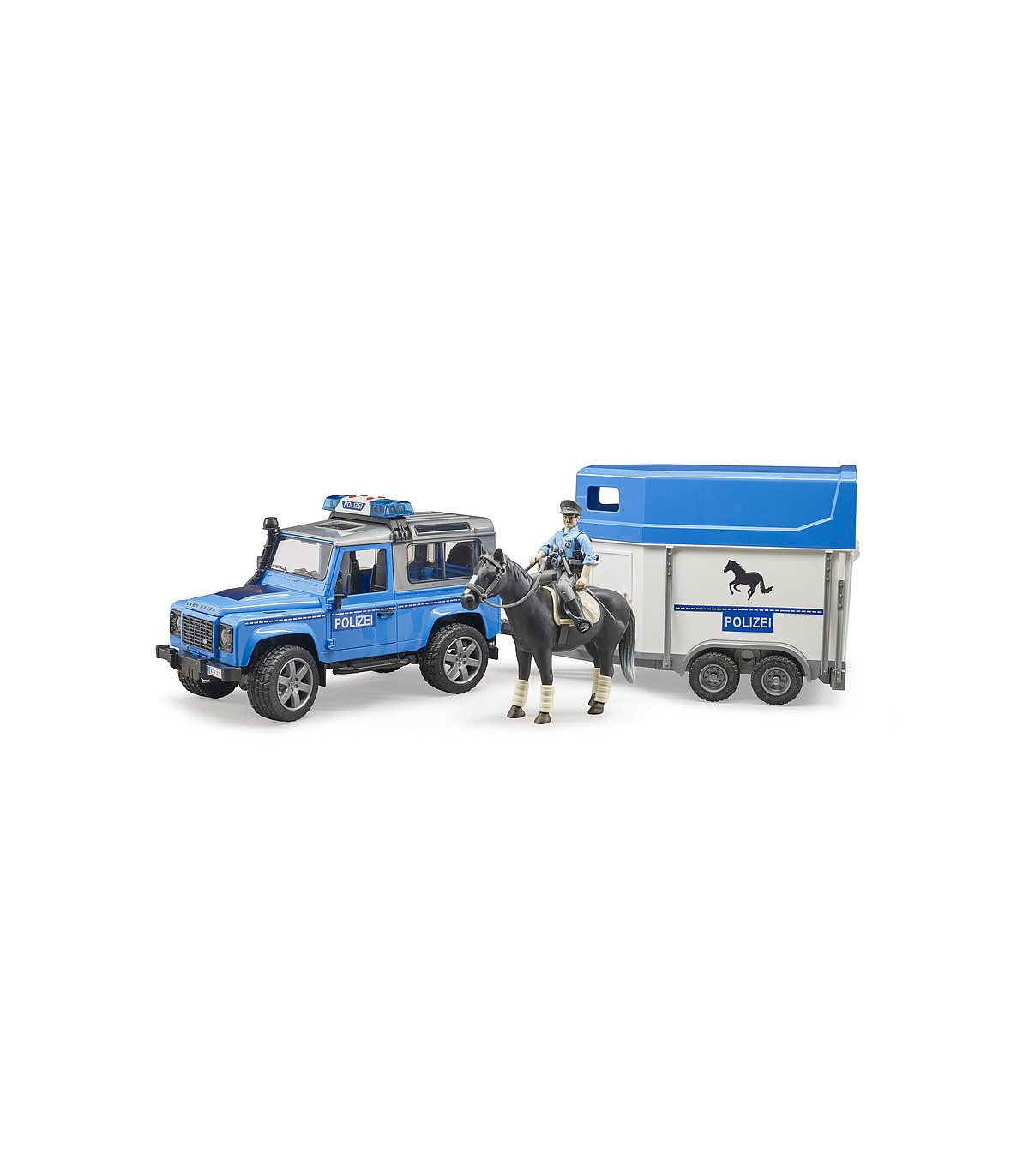 La brigada de acción policial BRUDER fue creada para hacer respetar la ley y el orden. Como novedad, ahora se suma a la brigada el vehículo policial Land Rover Defender y el remolque de caballos junto con el policía a caballo. Sus fascinantes cualidades todoterreno combinadas con un Land Rover de diseño intemporal hacen de la versión policial del Defender Station Wagon de BRUDER un elegante vehículo de servicio totalmente funcional. Además del capó de motor que permite ver el bloque de motor rico en detalles, se puede abrir la puerta trasera y las laterales, extraer el asiento trasero y desmontar el acoplamiento de remolque. Además, el eje delantero es dirigible y ofrece así un control extraordinariamente fácil sobre el vehículo. La versión policial del modelo Land Rover dispone de un módulo de luces y sonido que está equipado con cuatro botones para activar funciones. Este vehículo de emergencia transporta a la policía montada sin esfuerzo a todos los lugares donde deba intervenir. Ya sea para patrullar en el parque o para la protección de grandes eventos, el policía bworld a lomos de su fiel compañero cuenta con el equipamiento ideal para cada misión. El caballo puede transportarse en el remolque funcional con su rampa plegable. La puerta lateral es otra vía de acceso al remolque. Aprovechando la amplia gama BRUDER, este estupendo set se puede ampliar de forma impresionante con la comisaría de policía bworld (n.º de artículo 62730).