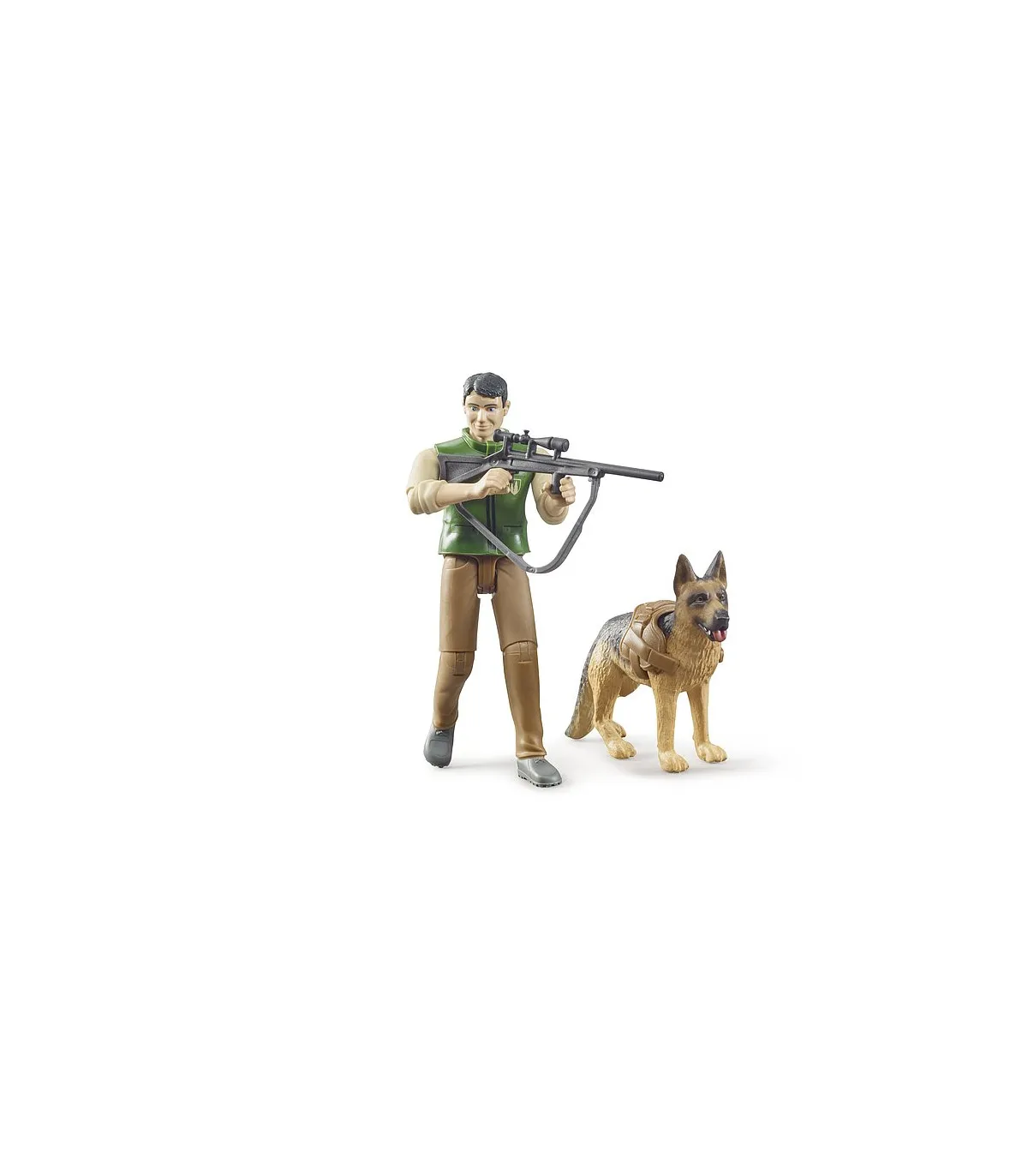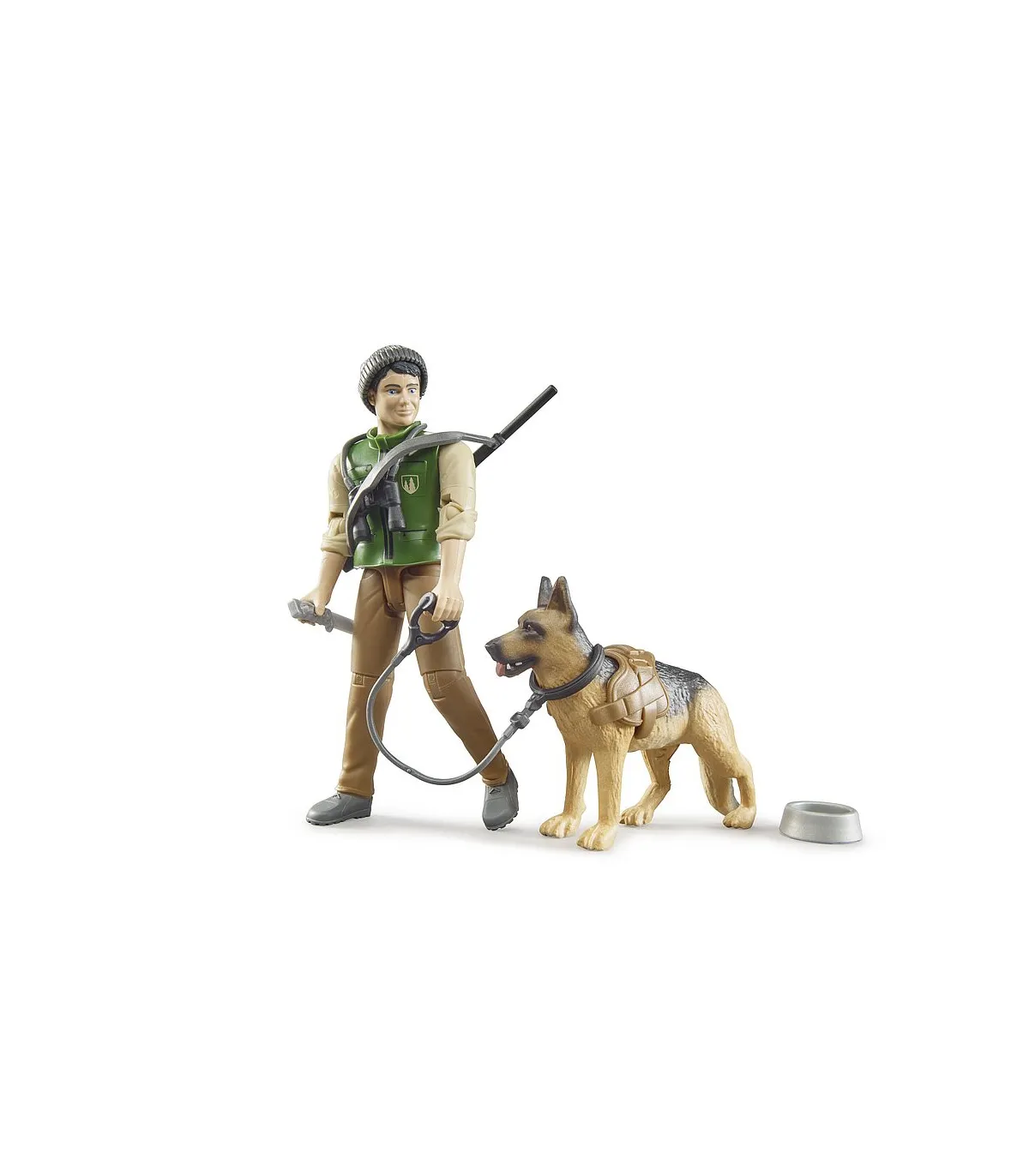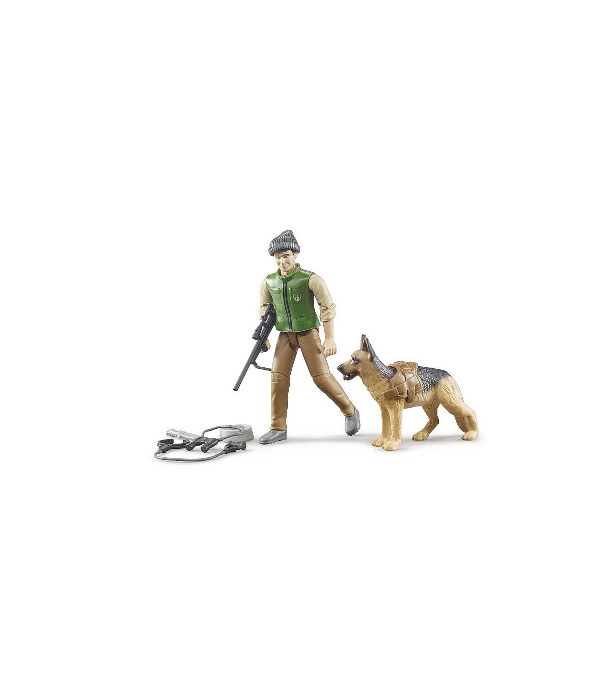 El forestal BRUDER está equipado con un rifle, binoculares y cuchillo de caza. Siempre está acompañado en su trabajo diario por su fiel Pastor Alemán. Lo lleva de forma segura con una correa y un arnés para perros. El bworld Förster es el complemento ideal para la amplia gama de máquinas forestales de la gama BRUDER.