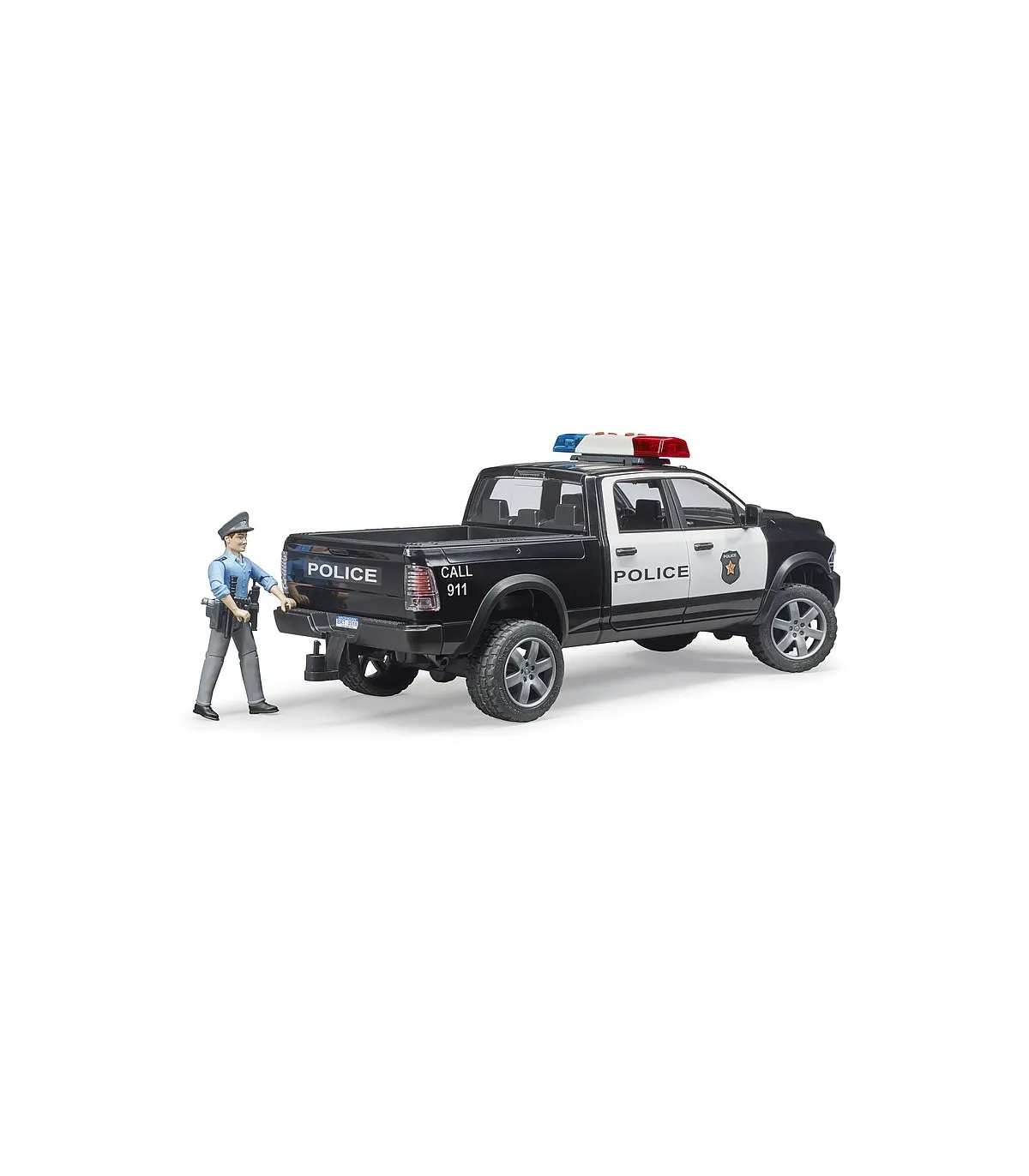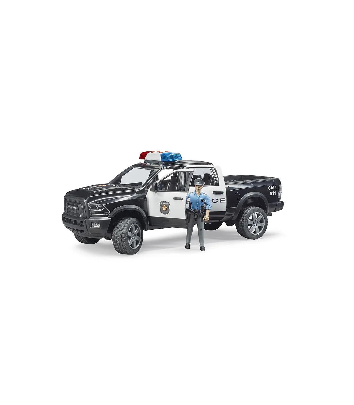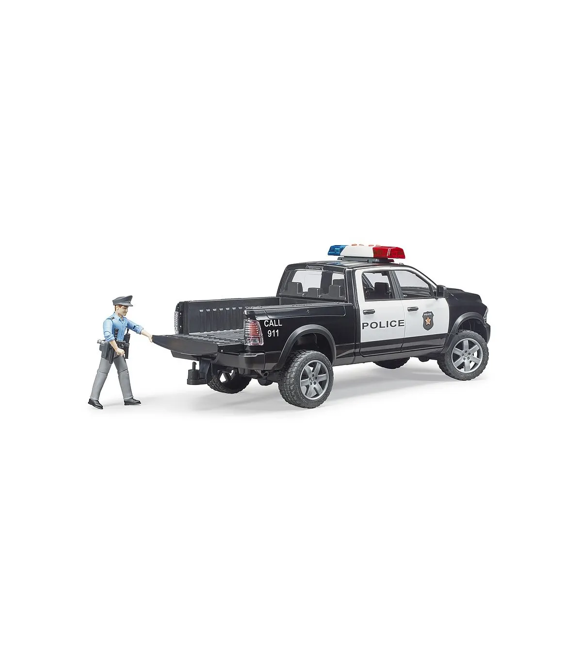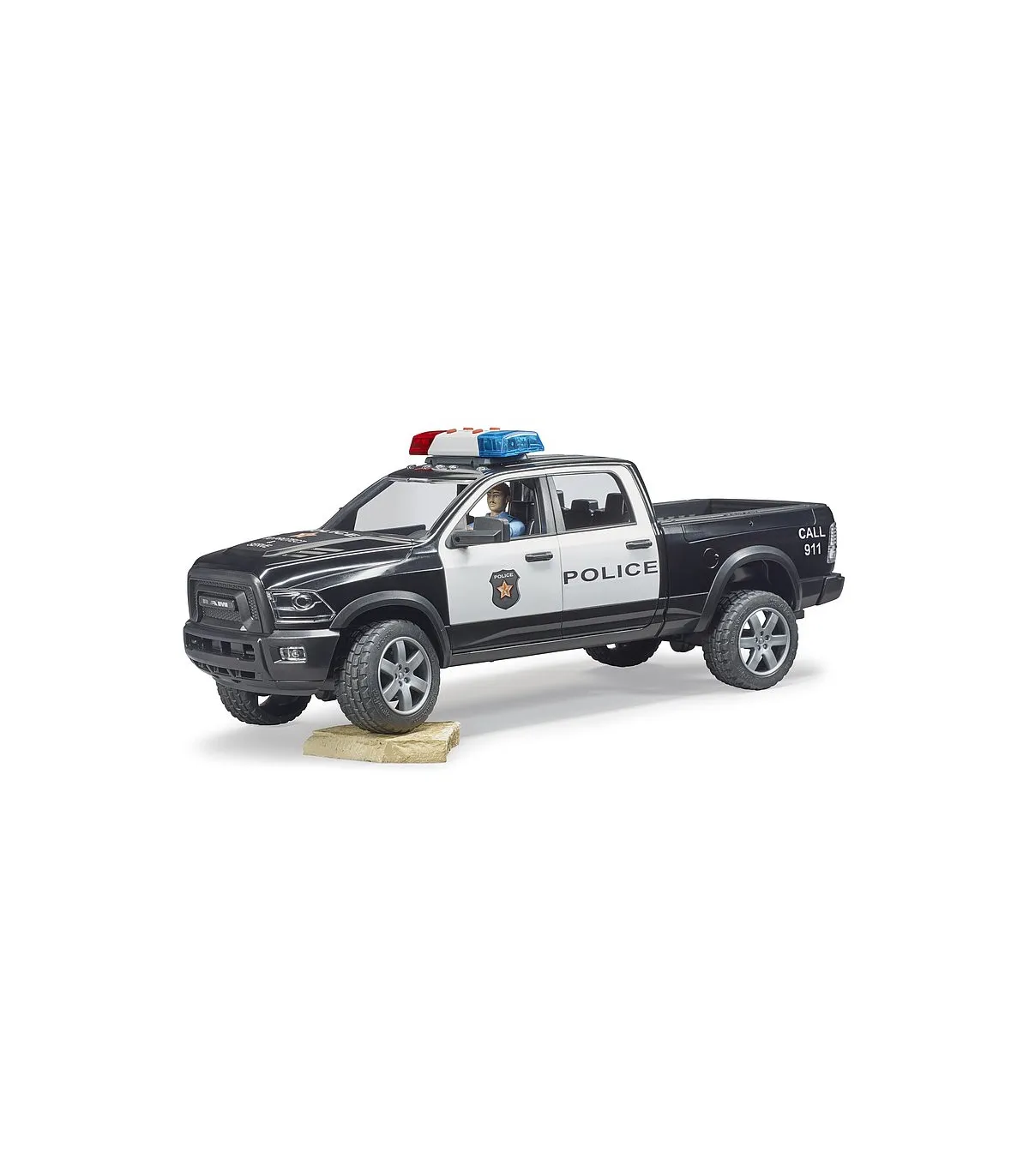 El vehículo de emergencia se basa en el conocido RAM 2500 y, como es común en los EE. UU. En particular, tiene un esquema de color atractivo y llamativo y un módulo de luz y sonido montado en el techo. El juguete, como su modelo grande, está equipado con la cabina de 4 puertas, la cabina CREW. Todas las puertas se pueden abrir y ofrecen espacio para 4 figuras de bworld. Para comodidad de conducción y movilidad todoterreno, este modelo a escala 1:16 está equipado con ejes de suspensión, siendo el eje delantero orientable con la extensión del volante incluida. El portón trasero se puede abrir para transportarlo durante el juego. El oficial de policía incluido está bien equipado y preparado para una variedad de posibles misiones. De la amplia gama de vehículos y figuras de emergencia, la comisaría de bworld (artículo no.