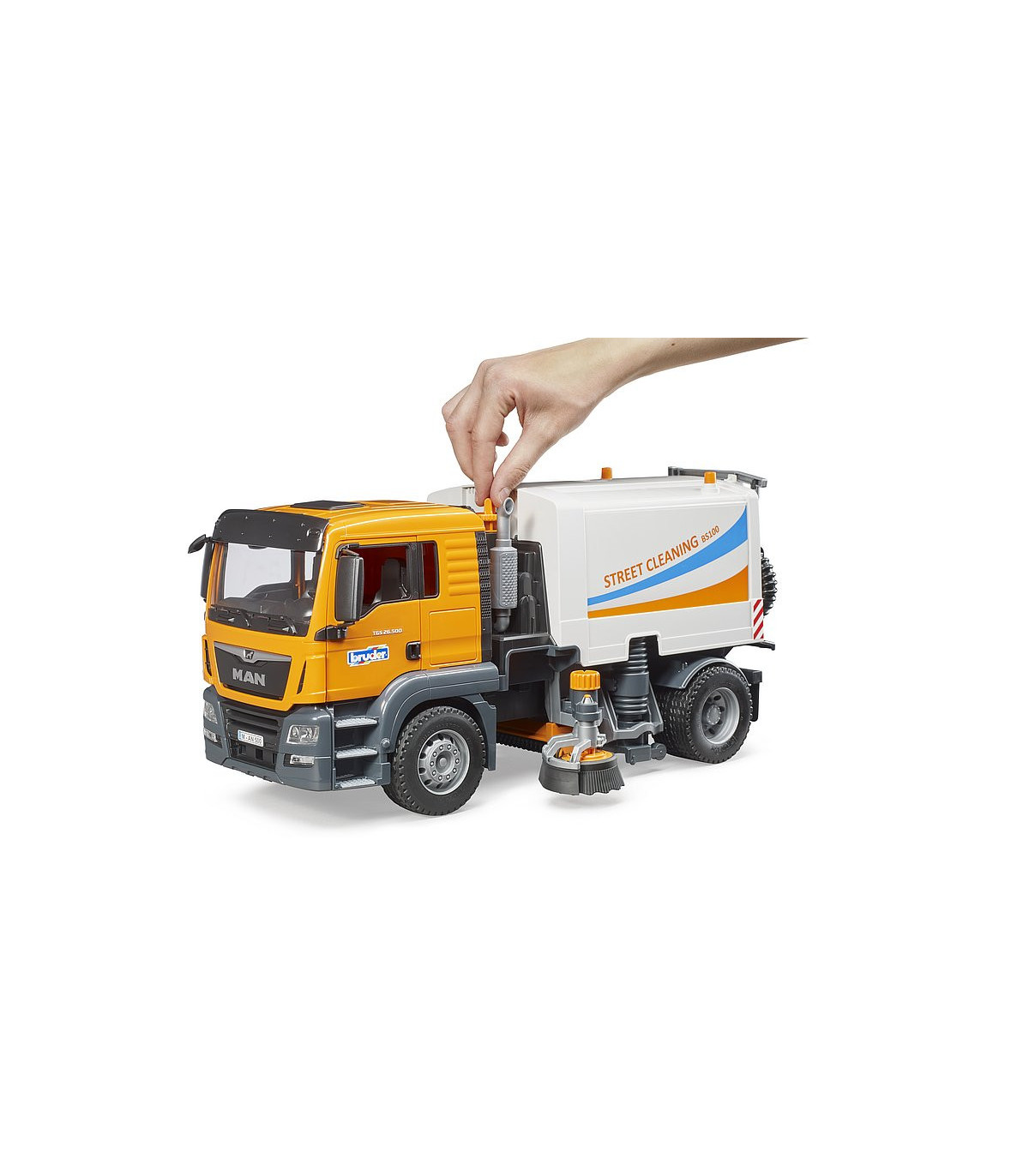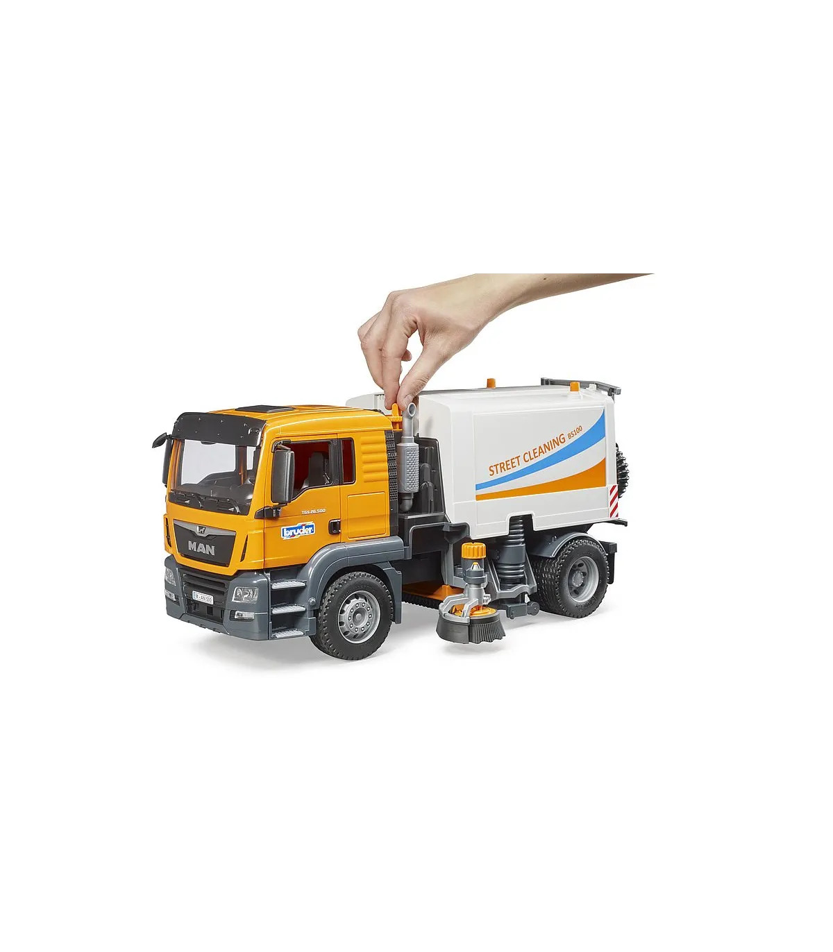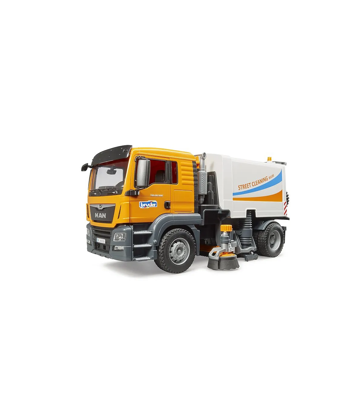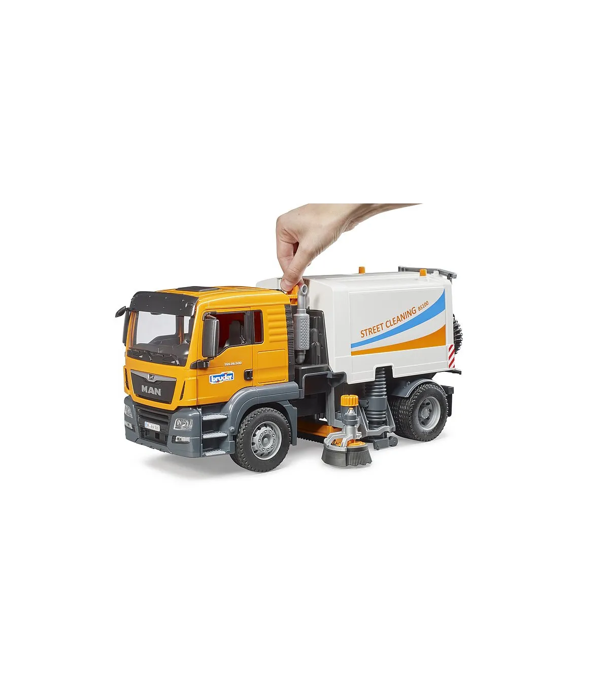 La limpieza de las calles es una ayuda indispensable para todas las administraciones de la ciudad y forma parte del paisaje urbano cotidiano. Ningún otro vehículo es tan eficiente para mantener limpias las carreteras y aceras. La nueva limpieza de calles de BRUDER muestra la funcionalidad de este emocionante camión con el mayor detalle posible. El MAN TGS es el socio perfecto. De construcción robusta, equipada con potentes motores de hasta 500 CV y con una carga útil superior a la media, este camión es el prototipo del todoterreno tan descrito.