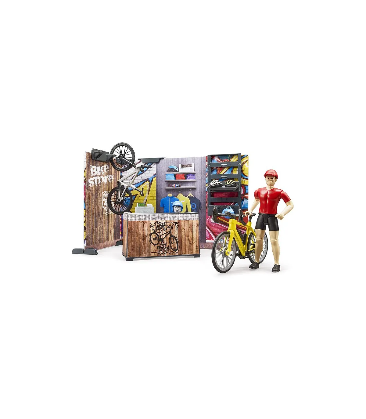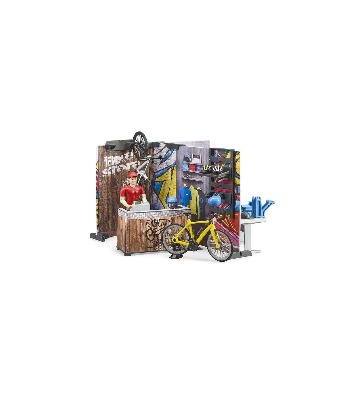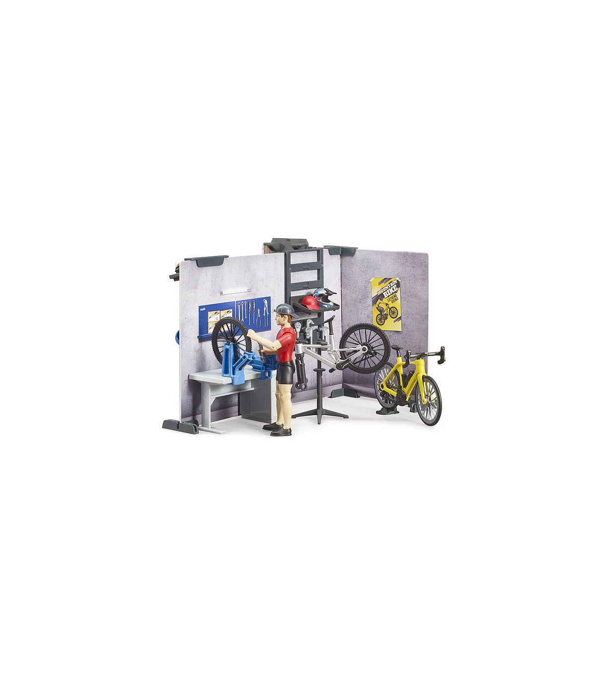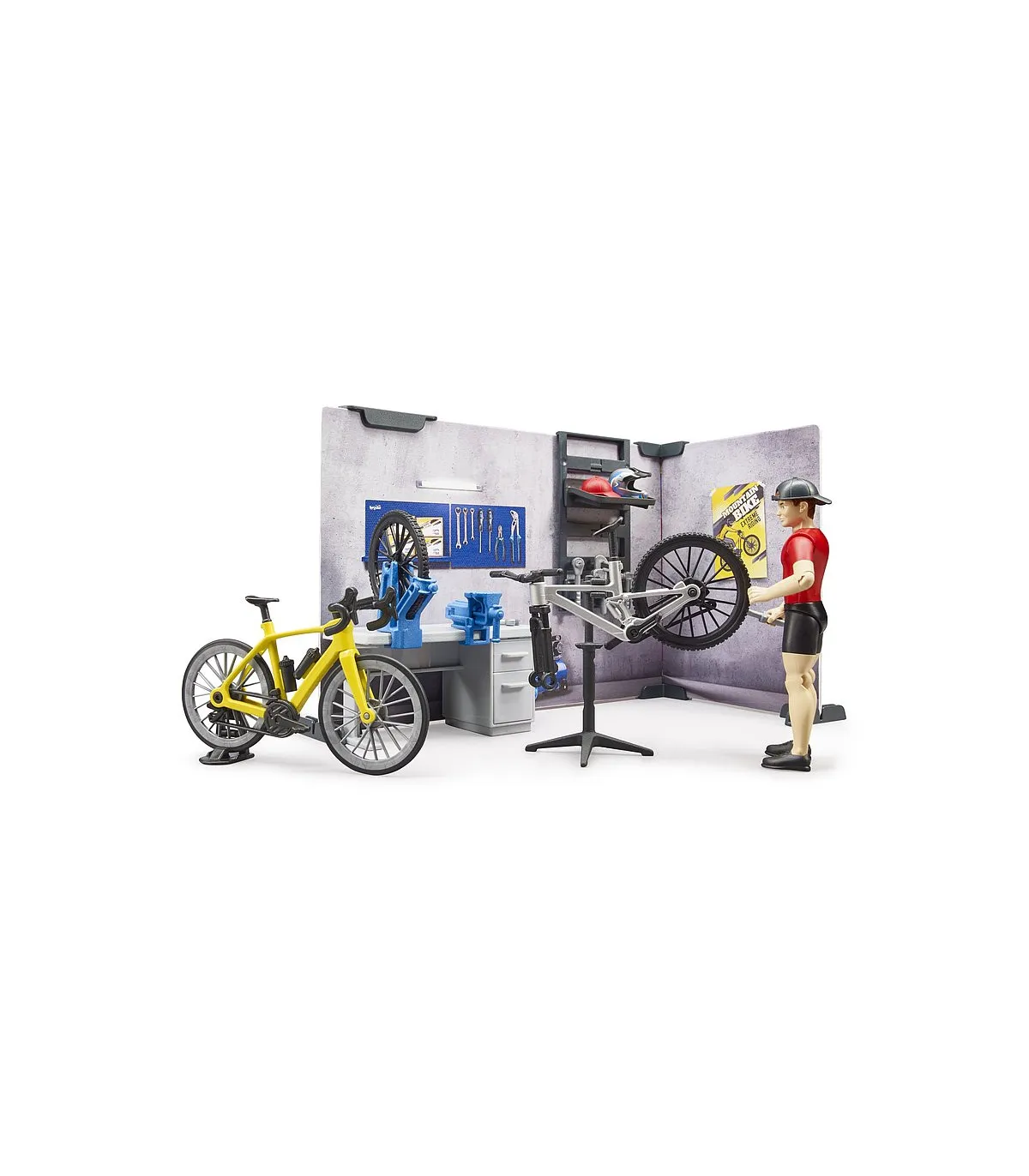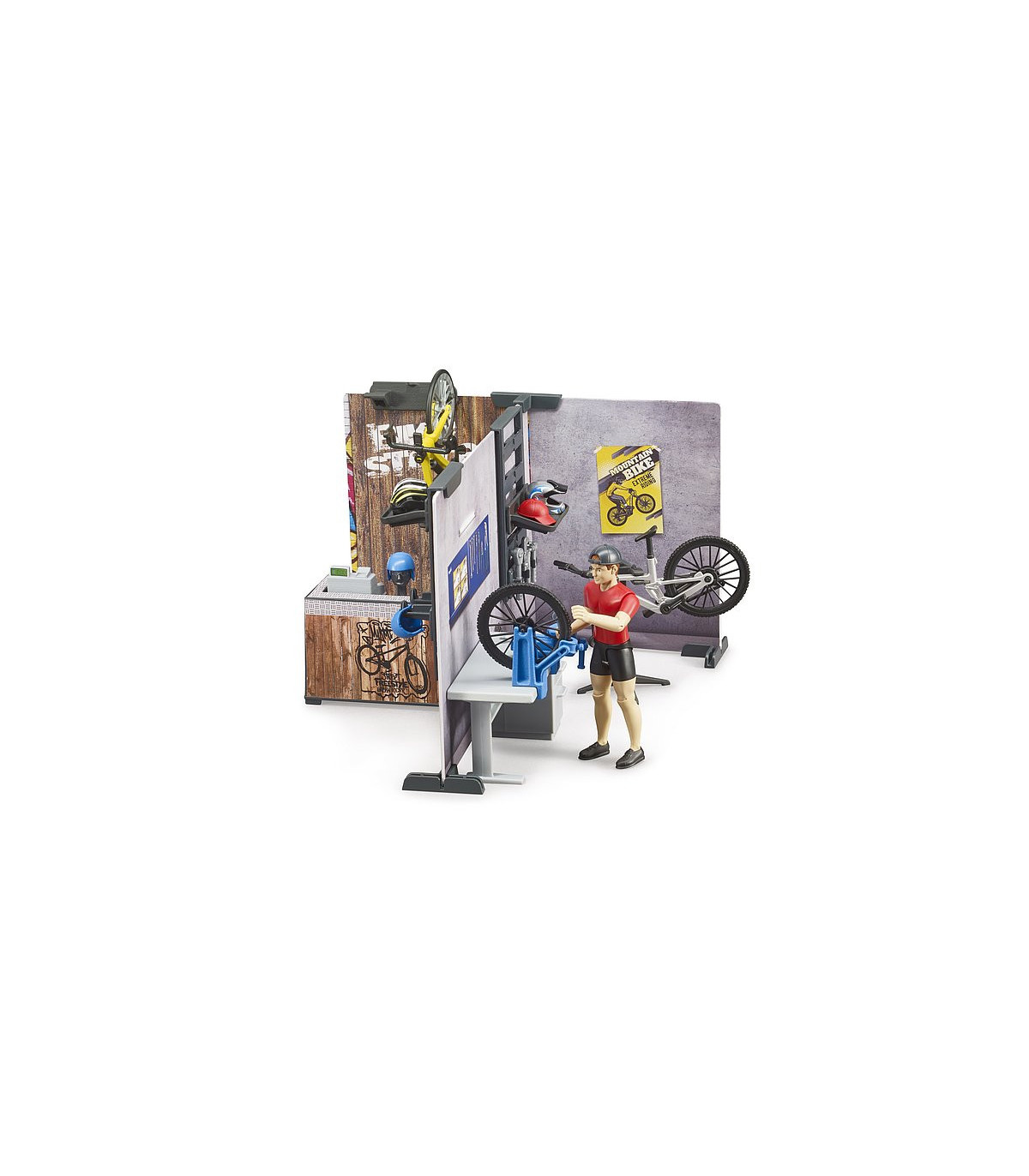 Para las numerosas figuras bworld entusiastas del deporte hay un nuevo punto de encuentro. La nueva tienda de bicicletas bworld de BRUDER incluye todo lo que se espera de una tienda de bicicletas moderna. En el taller dotado de un amplio equipo se pueden realizar todos los trabajos de mantenimiento y reparación de bicicletas. Para ello están disponibles el caballete de montaje y el banco de trabajo junto con las herramientas. En la tienda se pueden curiosear las estanterías en busca de nuevos accesorios o incluso bicicletas completas. El asesoramiento especializado corre a cargo de la figura bworld, que también está incluida.