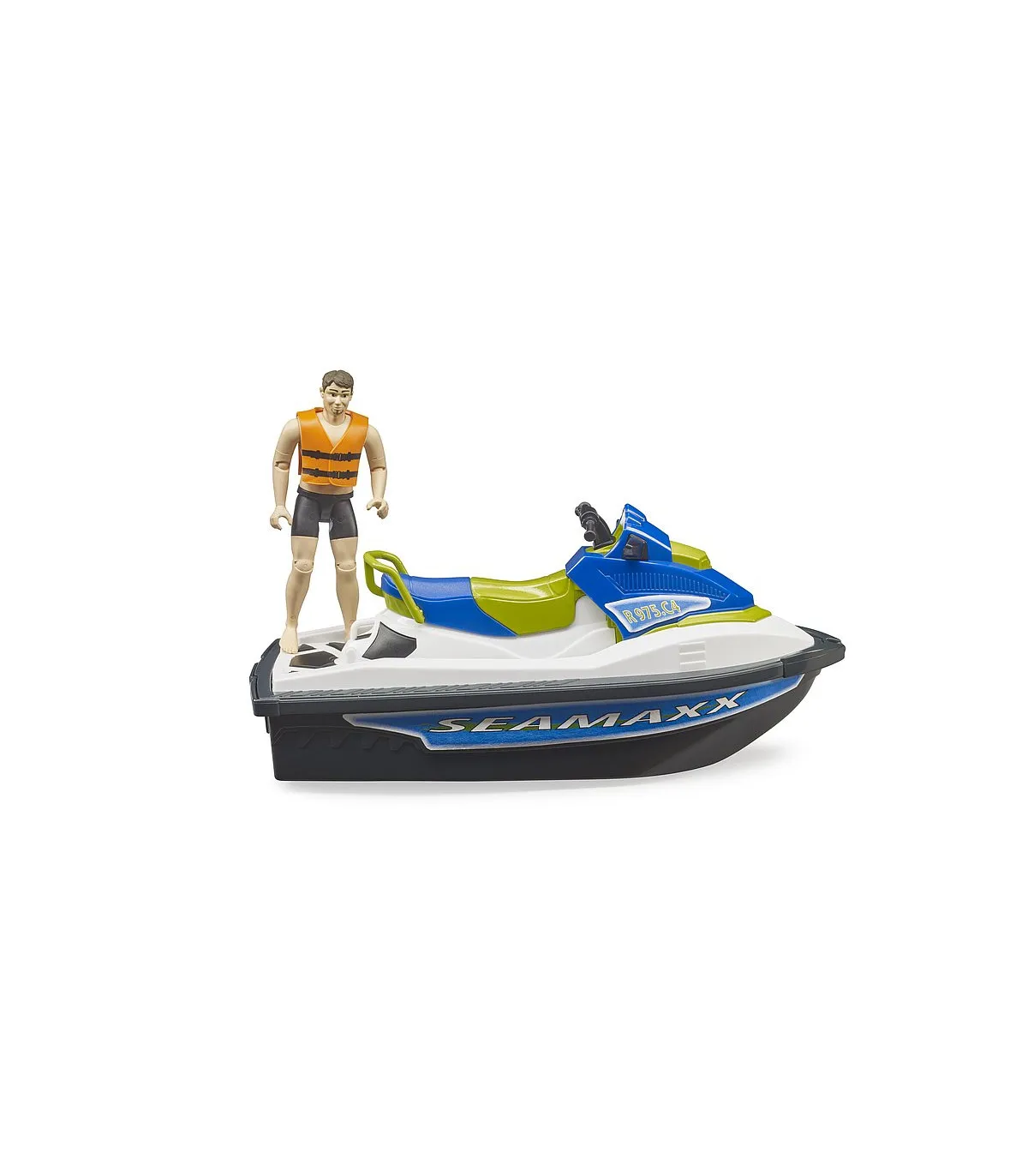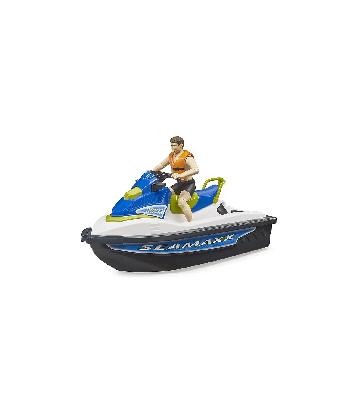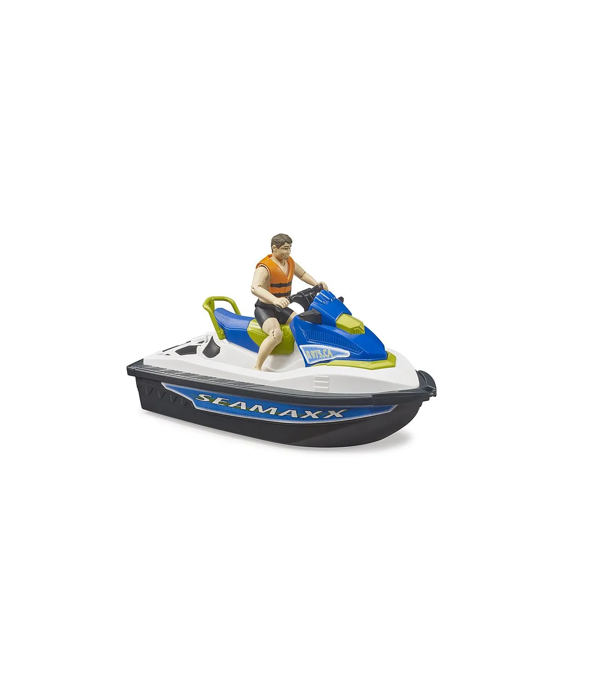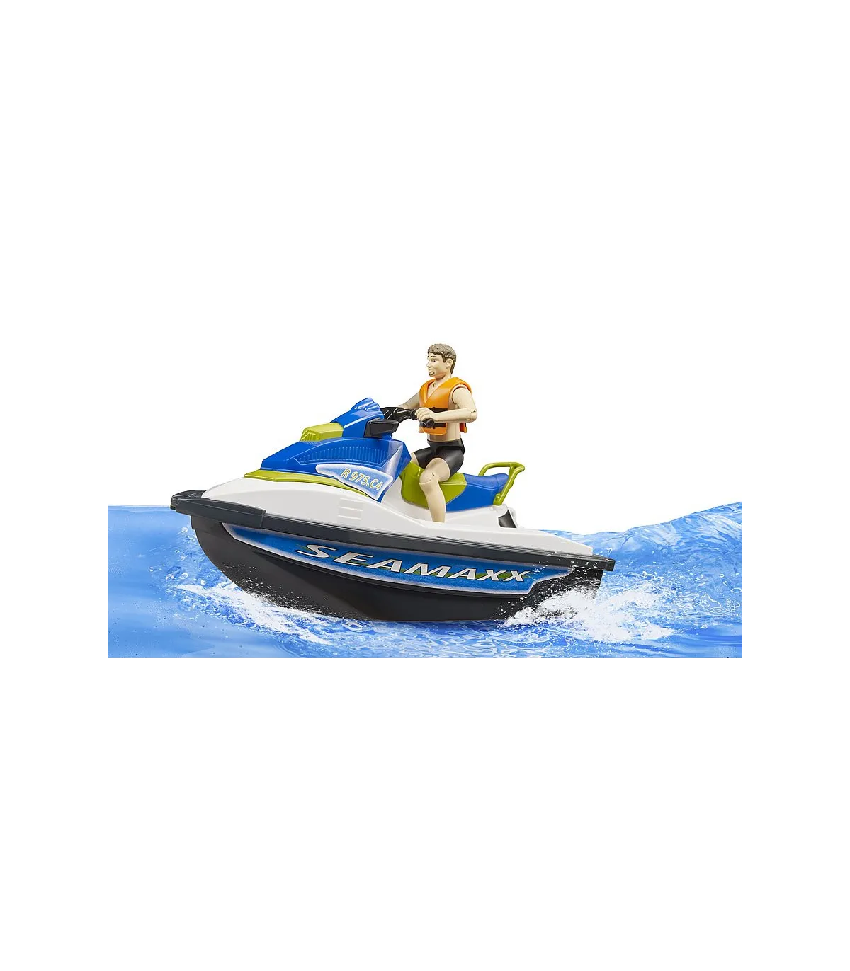 Las vacaciones en el mar son todavía la quintaesencia del descanso para muchas personas. Sol, mar y playa de arena son los ingredientes que aseguran unas bellas vacaciones. Se observan motos acuáticas en muchas playas. Estas motos se alquilan a los turistas, pero también se utilizan como vehículos para acciones de rescate en la costa. La nueva moto acuática de BRUDER tiene una estructura insumergible que vuelve a poner a flote la moto sin problemas en caso de vuelco y tiene espacio para dos figuras bworld. El conductor ya tiene todo el equipo necesario para comenzar de inmediato sus aventuras acuáticas.