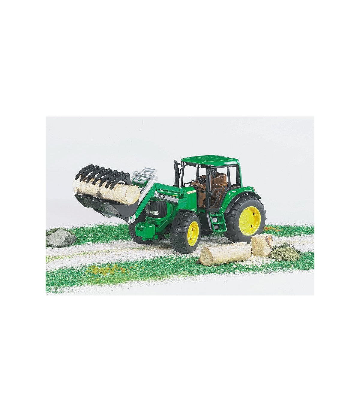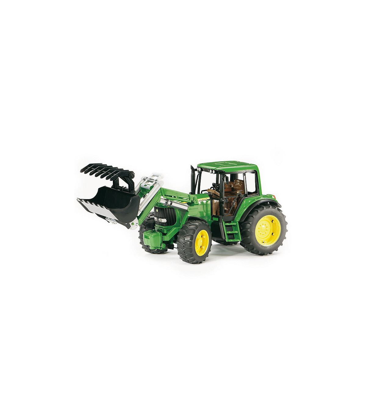 Como todos los tractores de la serie Profi, este tractor fiel al original puede equiparse con neumáticos gemelos (no incluidos). El eje delantero pendular todoterreno se puede dirigir directamente a través del volante en la cabina del conductor y utilizando una extensión de manillar incluida, que los niños pueden colocar en el volante a través del techo corredizo en la cabina del conductor. El cargador frontal completamente funcional se puede colocar y quitar de nuevo simplemente quitando el peso frontal. El capó se puede abrir para revelar el bloque del motor. Los neumáticos de perfil completan el cuadro. Todos los numerosos remolques y accesorios de la serie Profi se pueden combinar con el tractor John Deere 6920 para dar al pequeño "granjero"