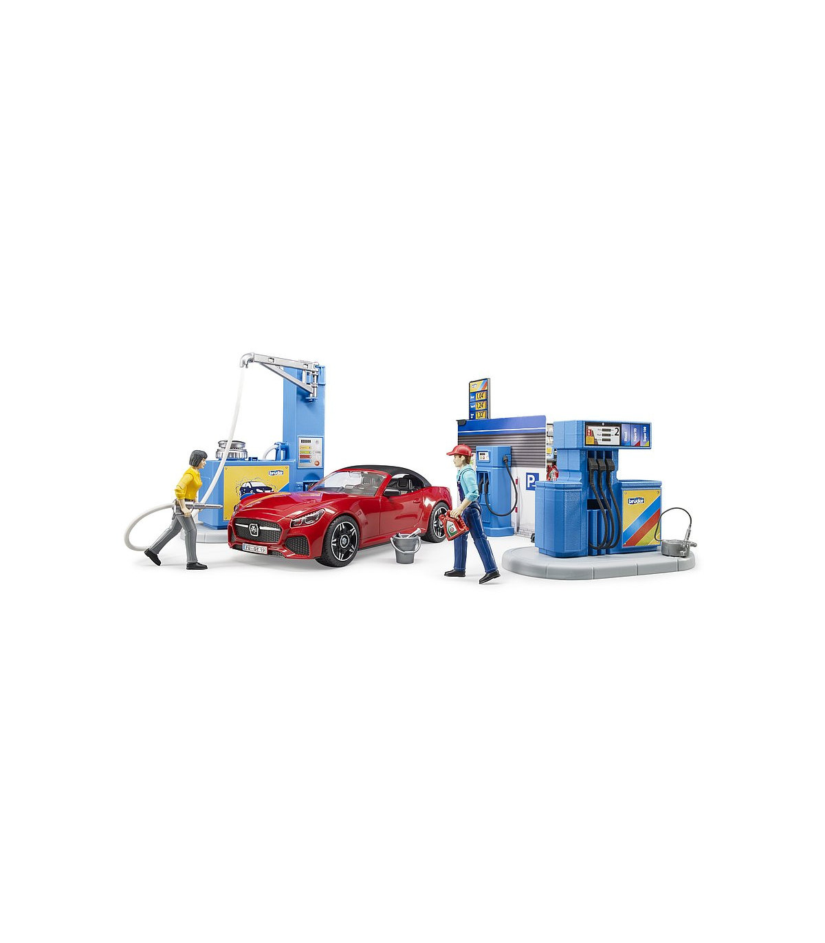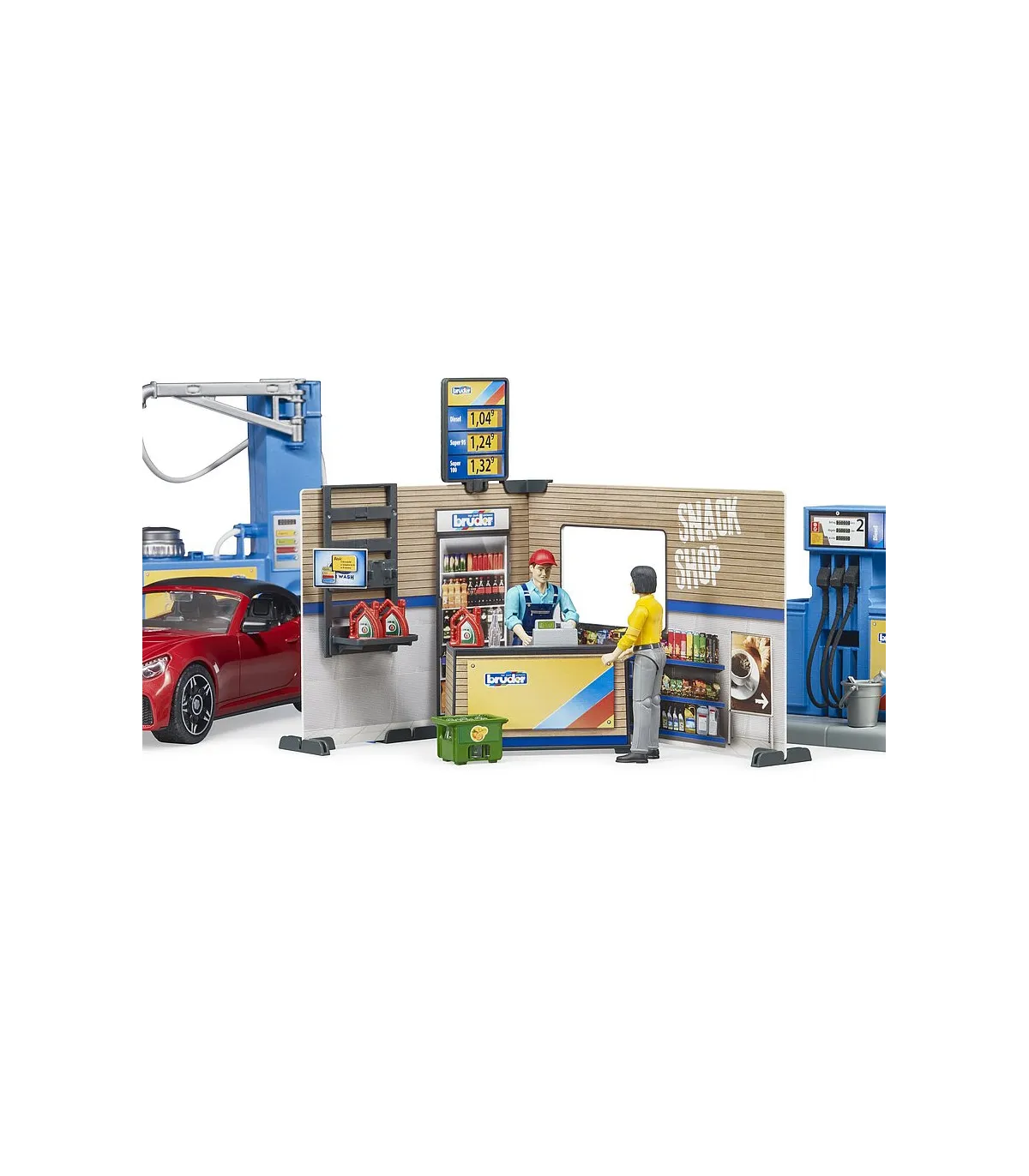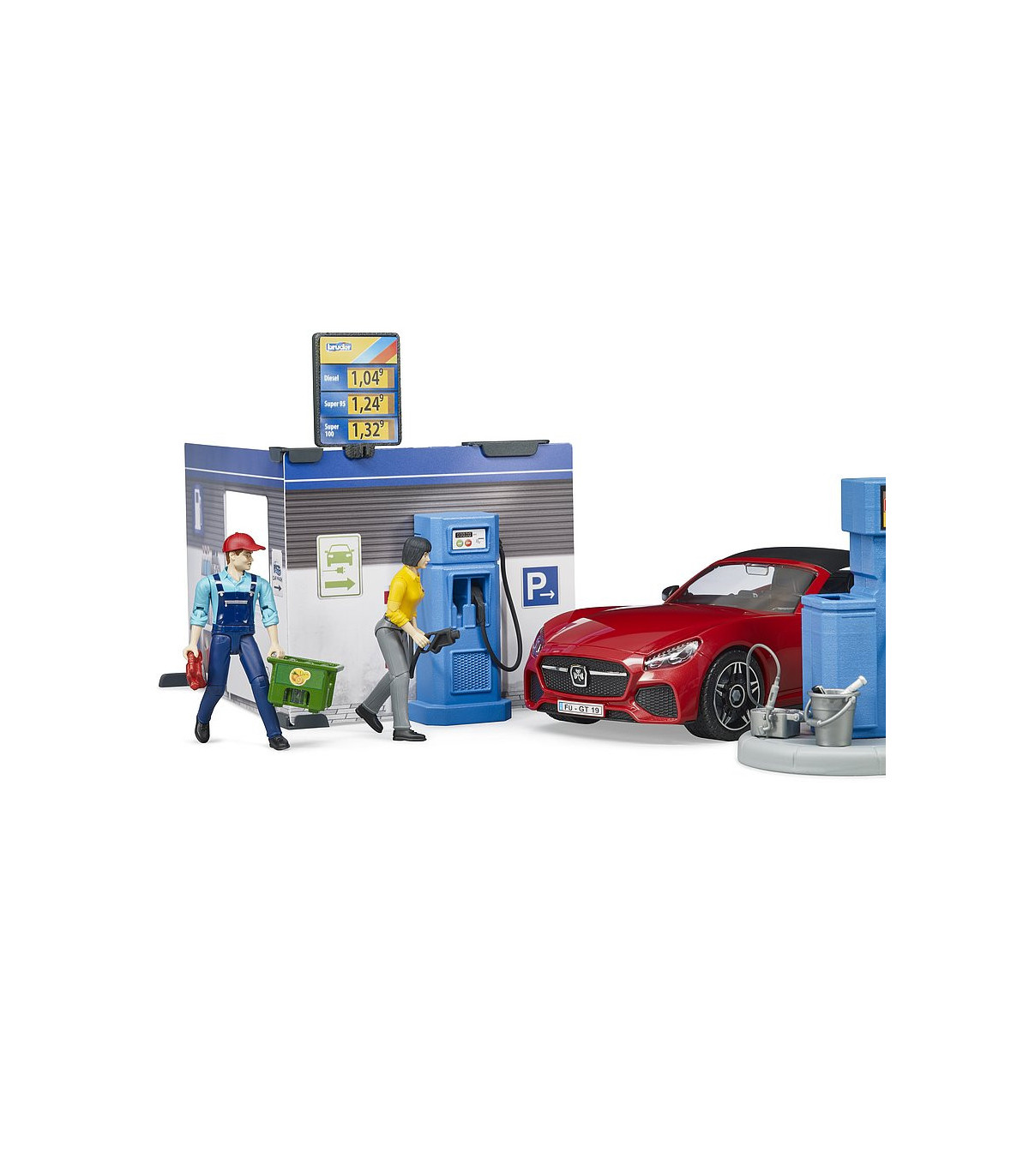 Casi todos los vehículos de BRUDER comparten una característica común: se deben repostar y limpiar de vez en cuando. La nueva estación de servicio bworld con un equipamiento superior está preparada para este fin. El surtidor cuenta con todos los tipos de combustible habituales y también dispone de un punto de carga para los vehículos eléctricos. El empleado de la gasolinera trabaja en una moderna sala de venta con panel de precios, monitor y moderno sistema de caja.
