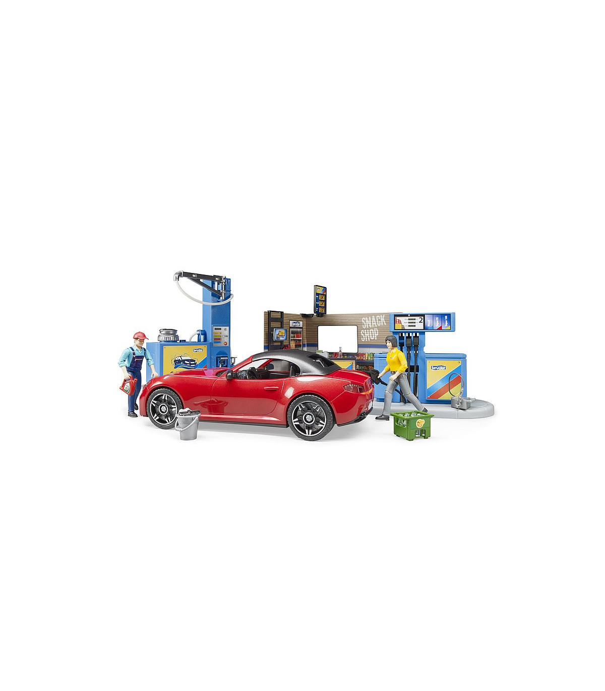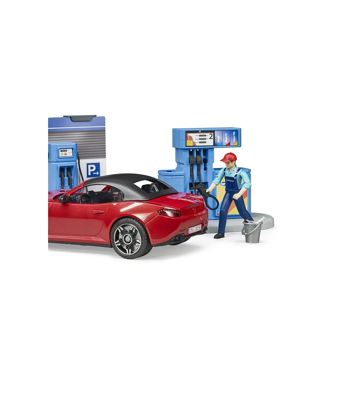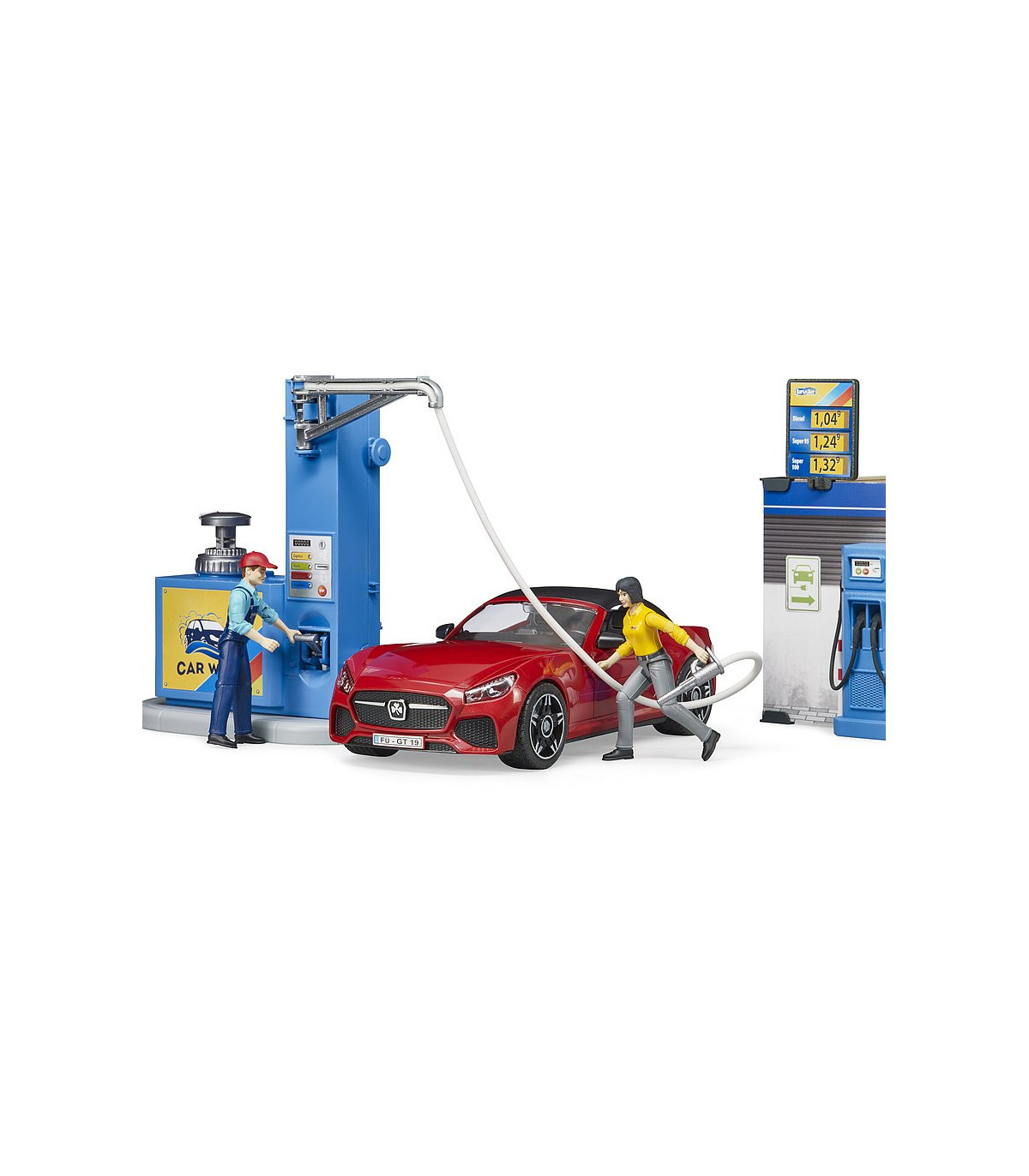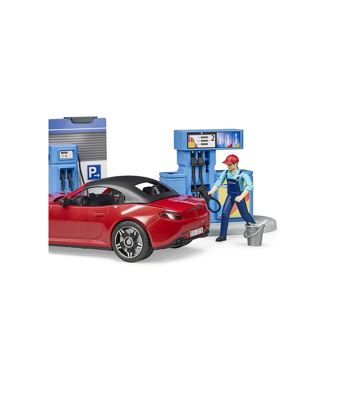 Casi todos los vehículos de BRUDER comparten una característica común: se deben repostar y limpiar de vez en cuando. La nueva estación de servicio bworld con un equipamiento superior está preparada para este fin. El surtidor cuenta con todos los tipos de combustible habituales y también dispone de un punto de carga para los vehículos eléctricos. El empleado de la gasolinera trabaja en una moderna sala de venta con panel de precios, monitor y moderno sistema de caja.
