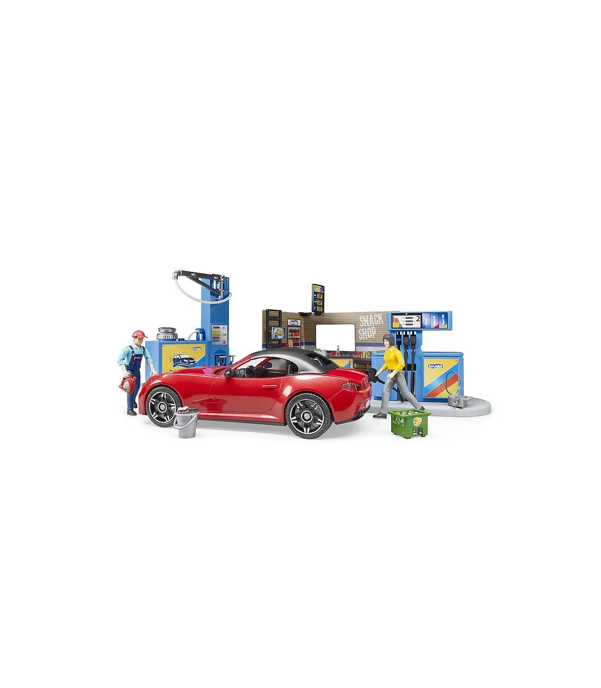 Completan este set el descapotable de BRUDER y su conductora y cliente de la gasolinera. Del gran surtido de BRUDER, encajan especialmente bien el taller de coches bworld (n.º de art. 62110), el taller de motocicletas bworld con la Scrambler Ducati Full Throttle (n.º de art. 62102) y el camión-grúa MAN TGS (n.º de art. 03750)