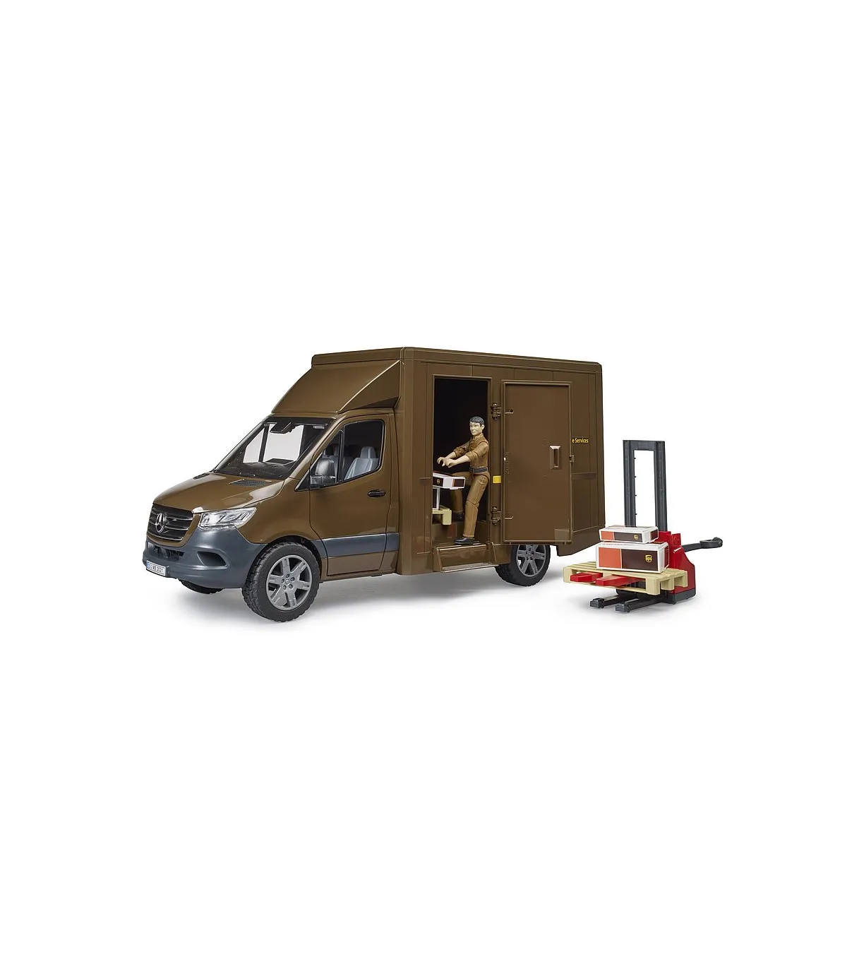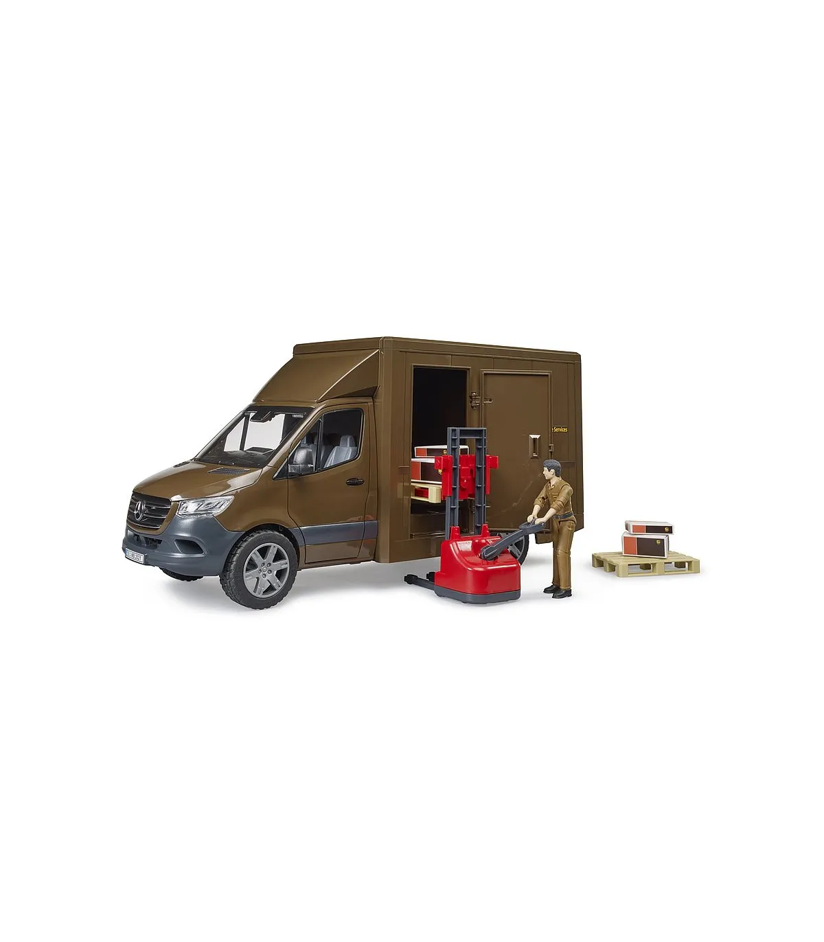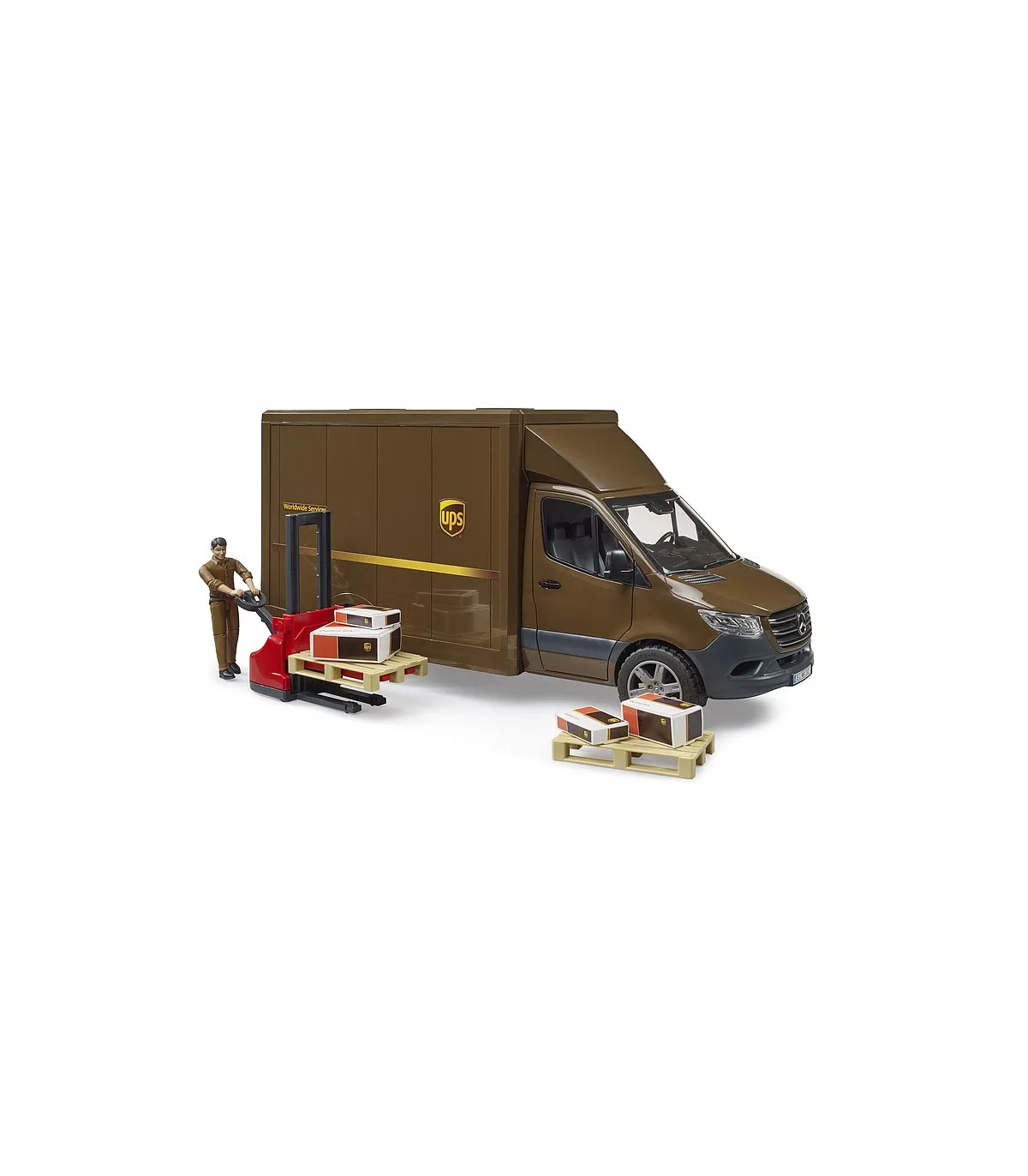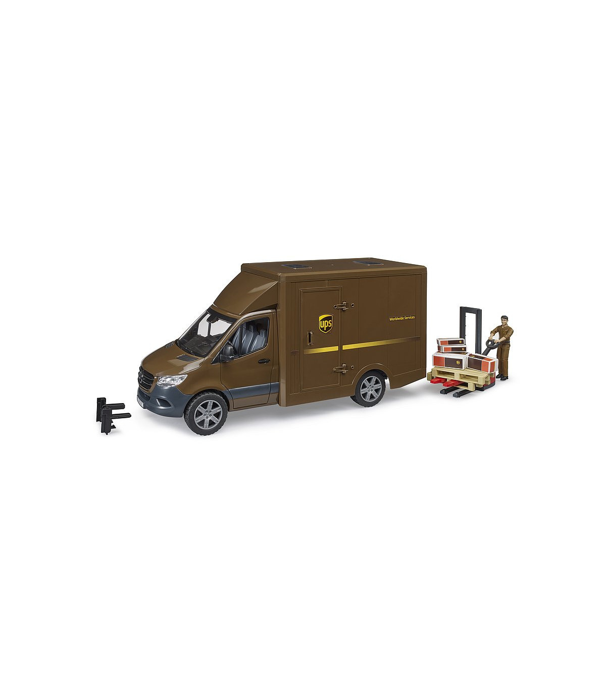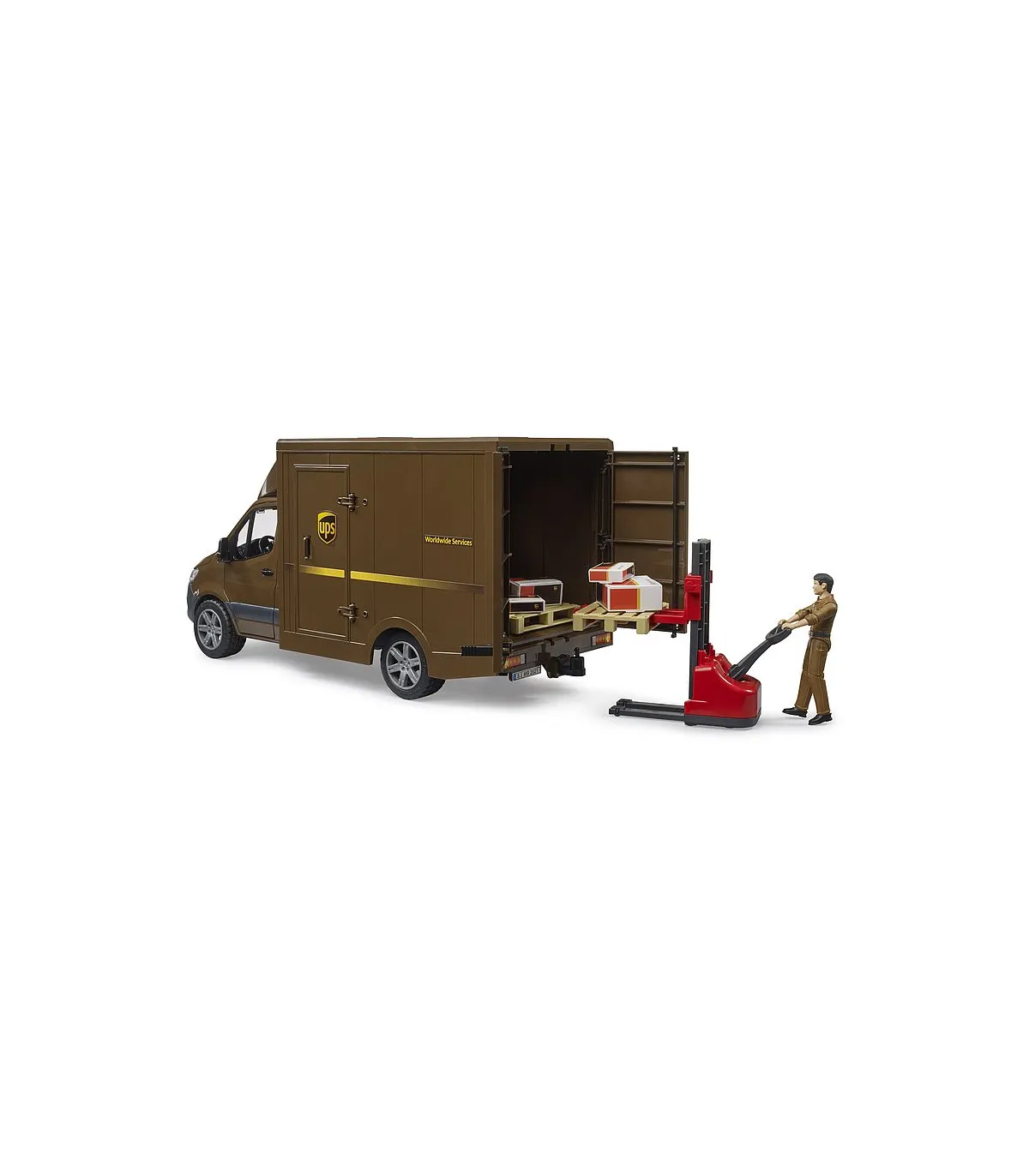 UPS, uno de los principales proveedores de servicios de envío del mundo, también confía en la Sprinter como vehículo de entrega. Este vehículo, que caracteriza el paisaje urbano actual, ahora se ha agregado a la gama Bruder. El vehículo tiene una puerta trasera de 2 piezas cuyas hojas se pueden abrir hasta el tope en la caja. Los artículos de transporte pequeños se pueden retirar a través de una puerta lateral para ahorrar tiempo. Con el transportador se incluye como accesorio una transpaleta manual con dos europalets, con la que se pueden cargar y descargar mercancías pesadas y/o voluminosas. Para redondear este gran conjunto, el conductor de UPS se incluye con su típico uniforme. También se incluyen las típicas cajas de envío de UPS en diferentes tamaños.