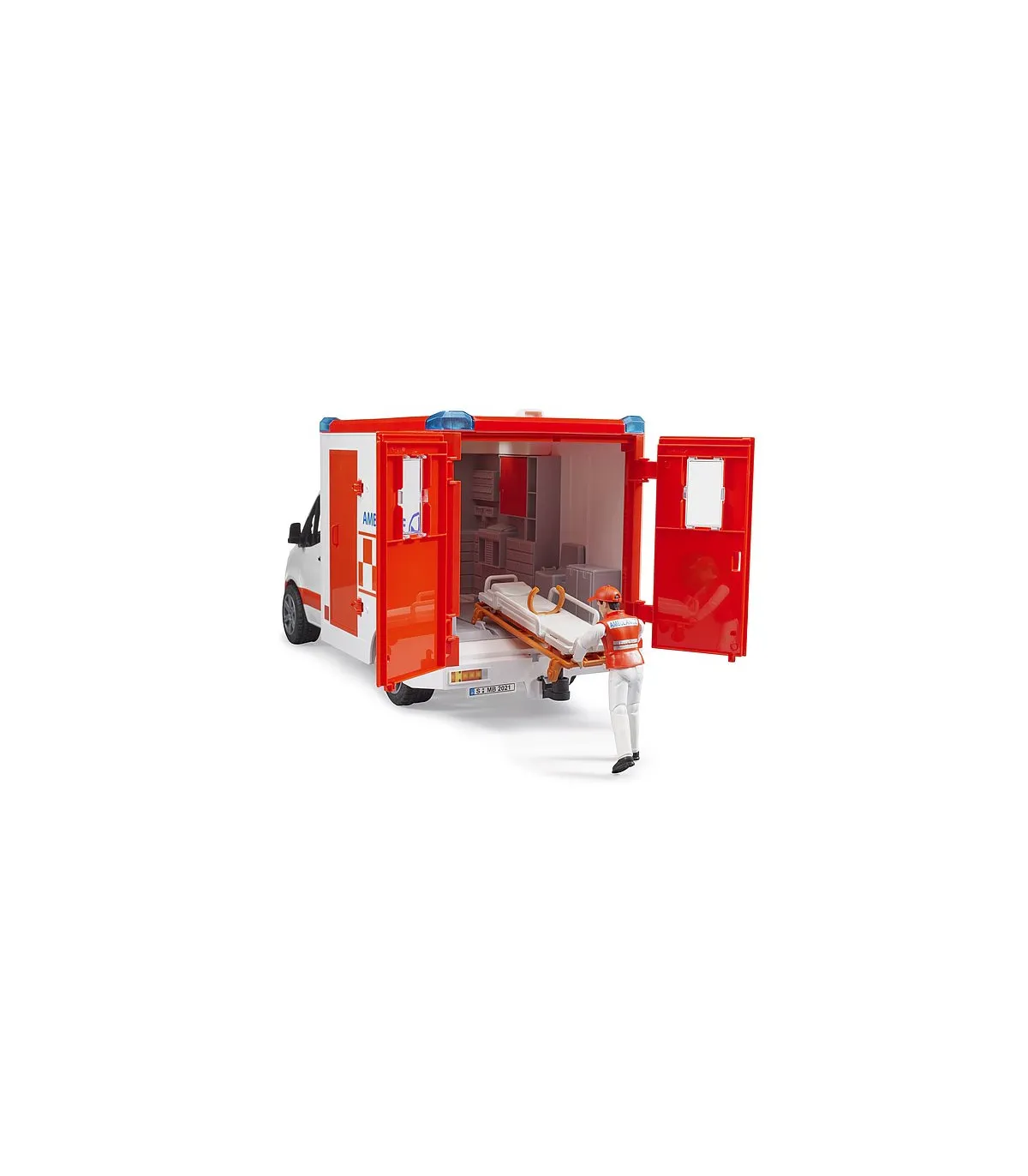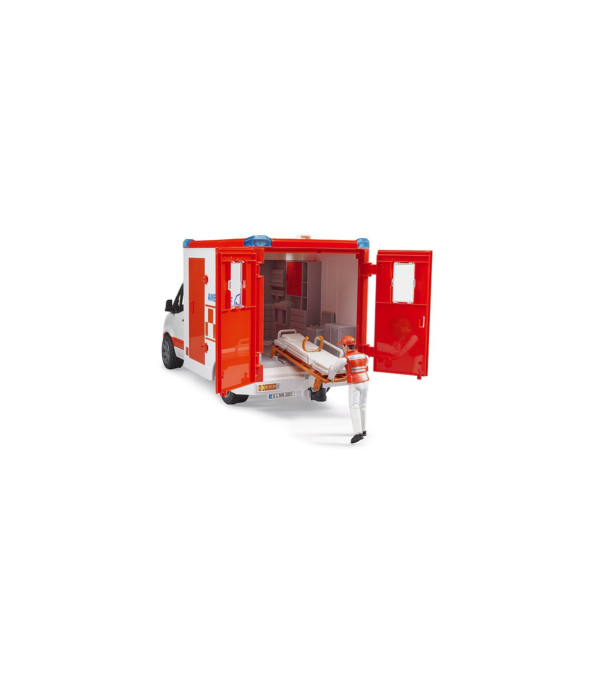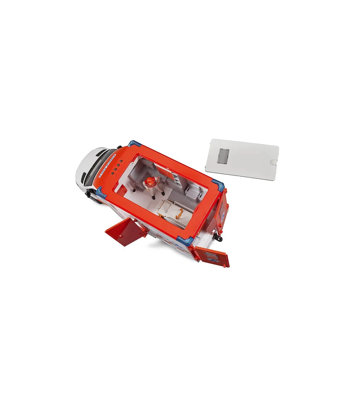 El tema de los vehículos de emergencia juega un papel importante en la empresa Bruder. La nueva ambulancia MB Sprinter se suma ahora para completar esta gama. Si se recrea una misión, no debe faltar este vehículo, que está equipado con multitud de funciones. El paramédico incluido en el volumen de suministro sube a la cabina del conductor a través de las puertas que se pueden abrir. Con el nuevo módulo de luz y sonido integrado con varias señales de sirena y funciones de luz, la ambulancia puede llegar al lugar de forma rápida y segura. El pequeño paramédico tiene acceso a la zona de tratamiento ultramoderna a través de las puertas traseras y laterales que se abren, así como del módulo de techo desmontable. En la camilla regulable en altura, que se puede sacar y volver a meter, hay espacio para cada figura de bworld para un tratamiento y se puede transportar de forma segura, según el lema de brother, como si fuera real. El valor lúdico de este gran vehículo se puede ampliar con el juego de accesorios 62710, compuesto por paramédico y paciente, así como con la enfermería bworld (n.º de artículo 62711).