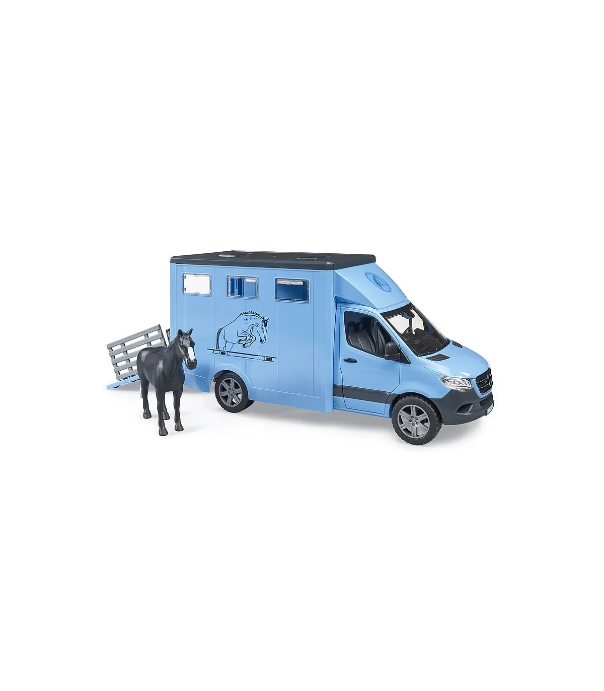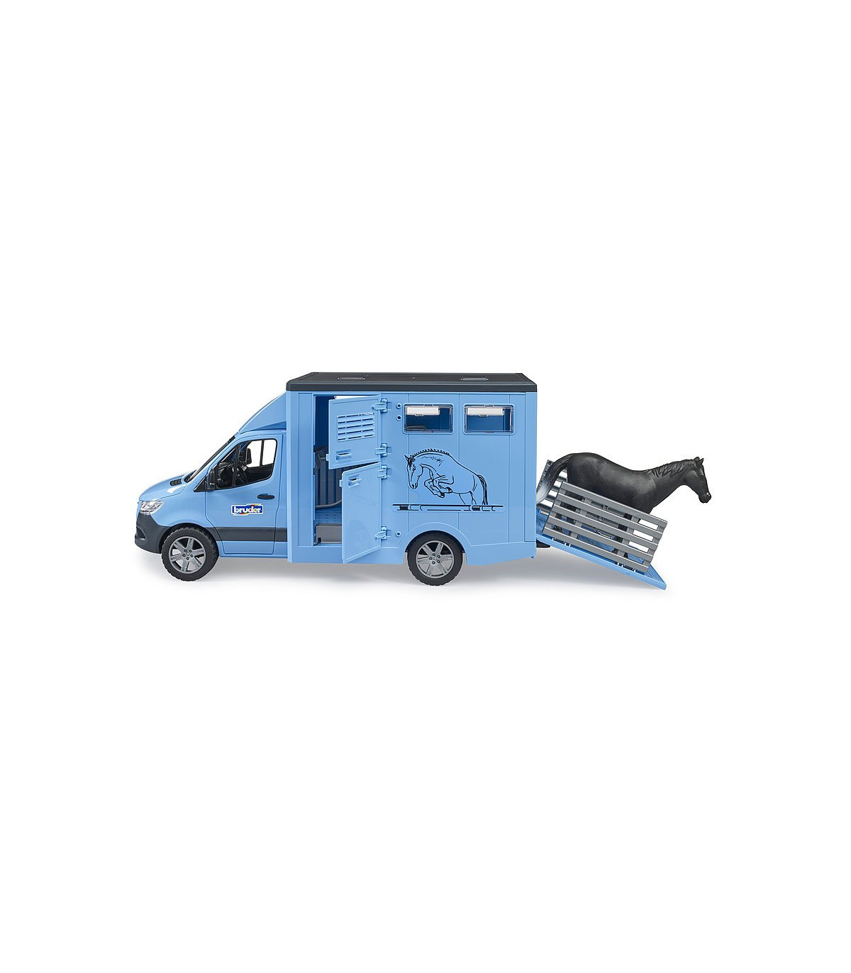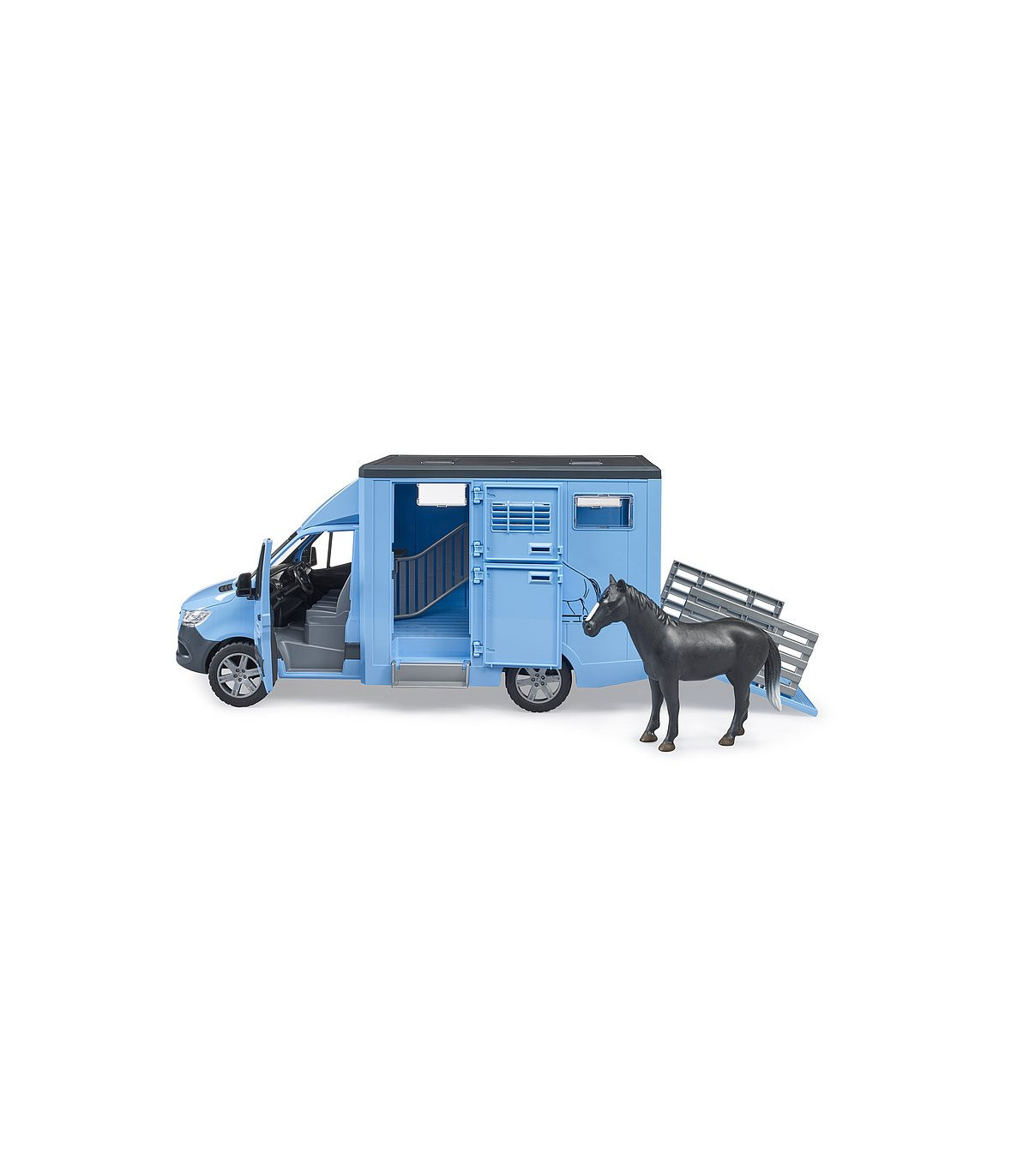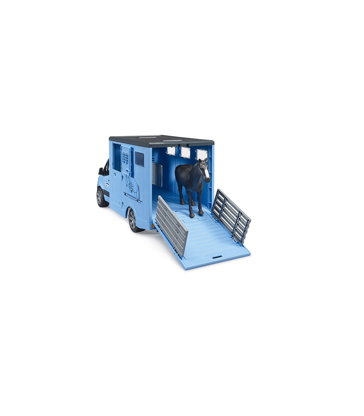 El transportador de animales dispone de una estructura de maletero moderna y adaptada al tipo con pared interior de separación variable y dos bebederos. Para subir y bajar los caballos se puede abatir la rampa. La rejilla de la rampa sirve para que los animales sean dirigidos hacia el vehículo o fuera del mismo con cuidado. Se incluye un caballo a escala; hay caballos adicionales disponibles con el número de artículo 02306. En este vehículo se pueden transportar un máximo de dos caballos. El establo bworld (nº de art. 62506) es ideal para este camión.