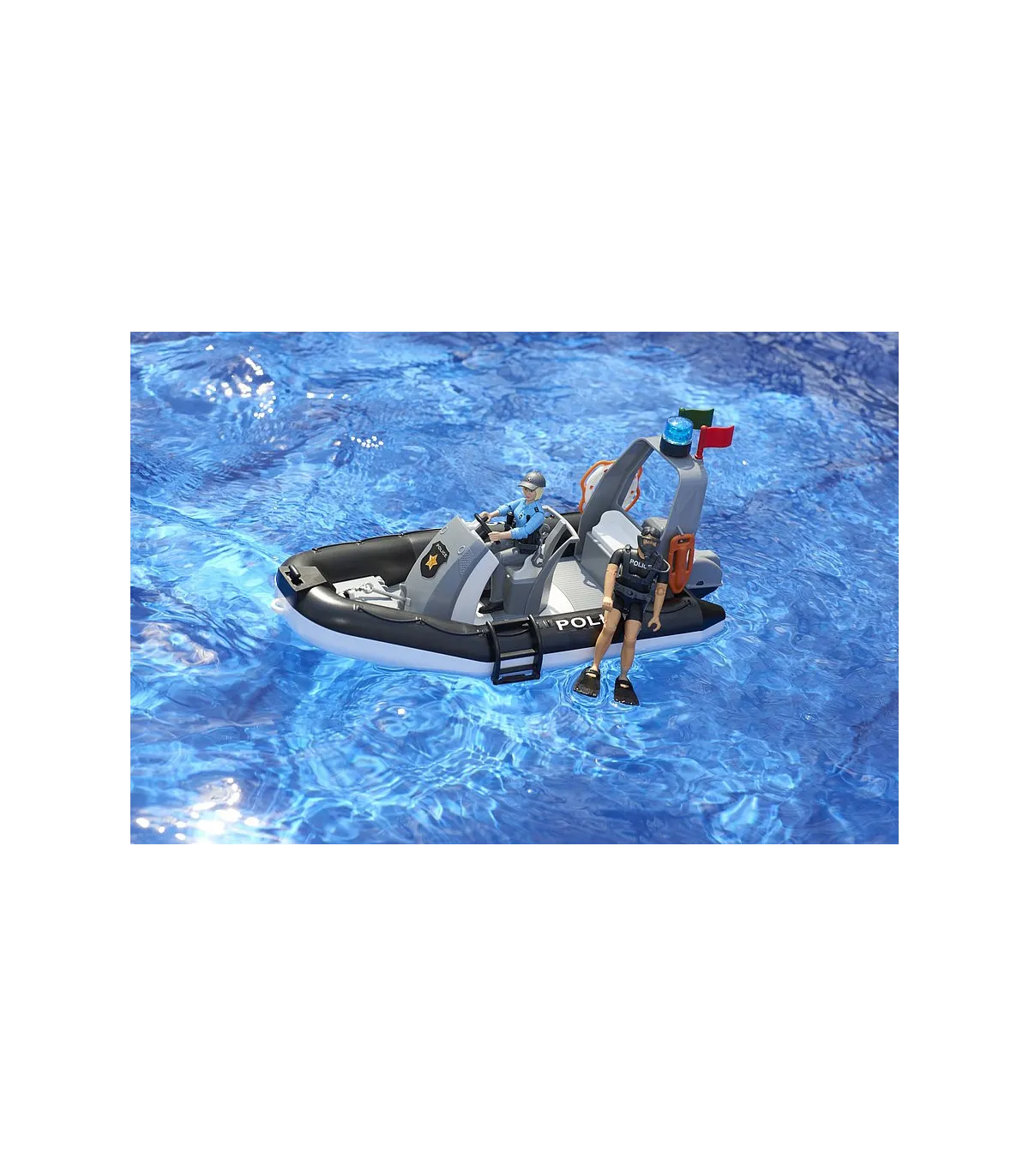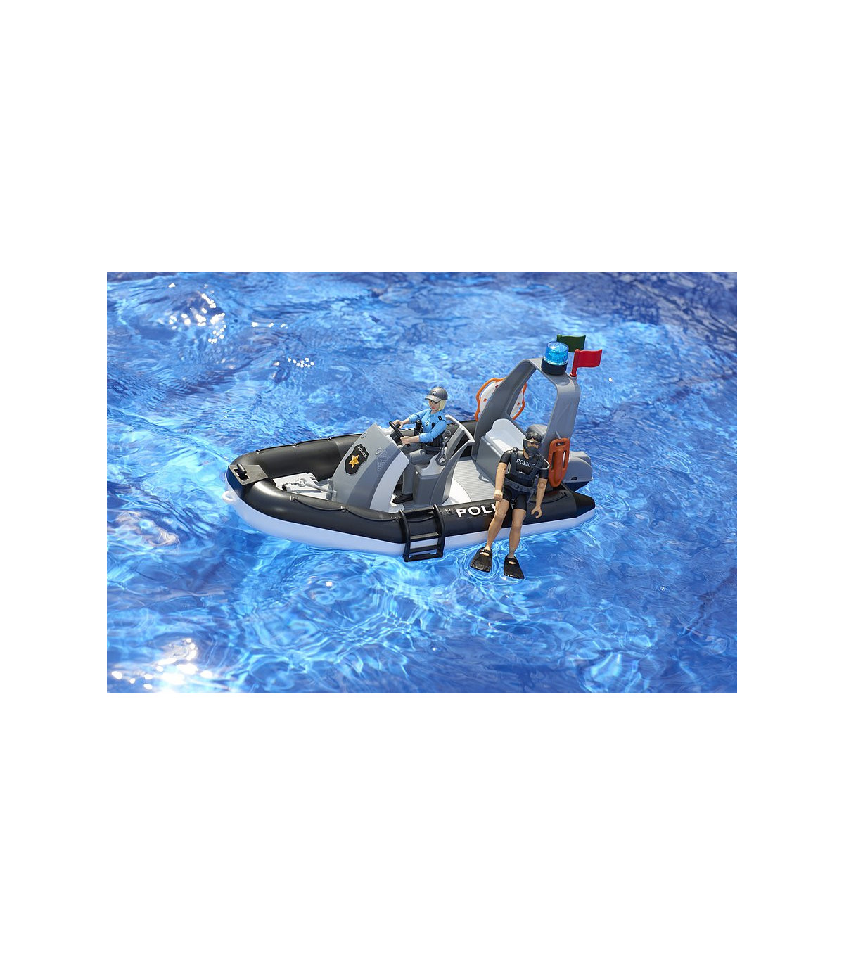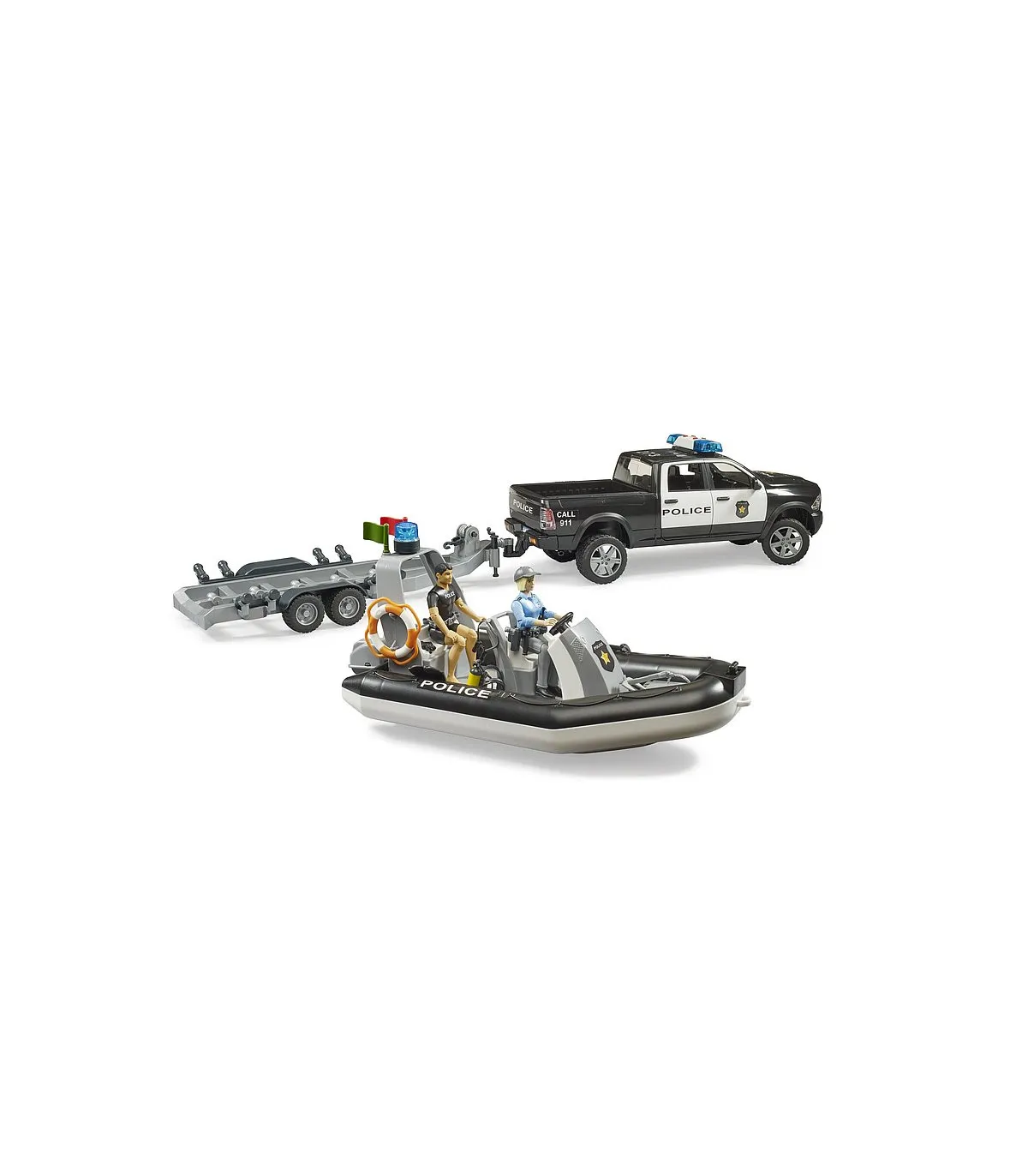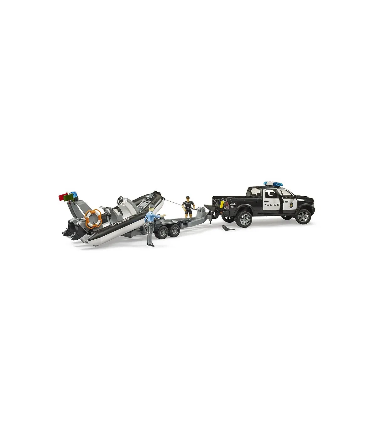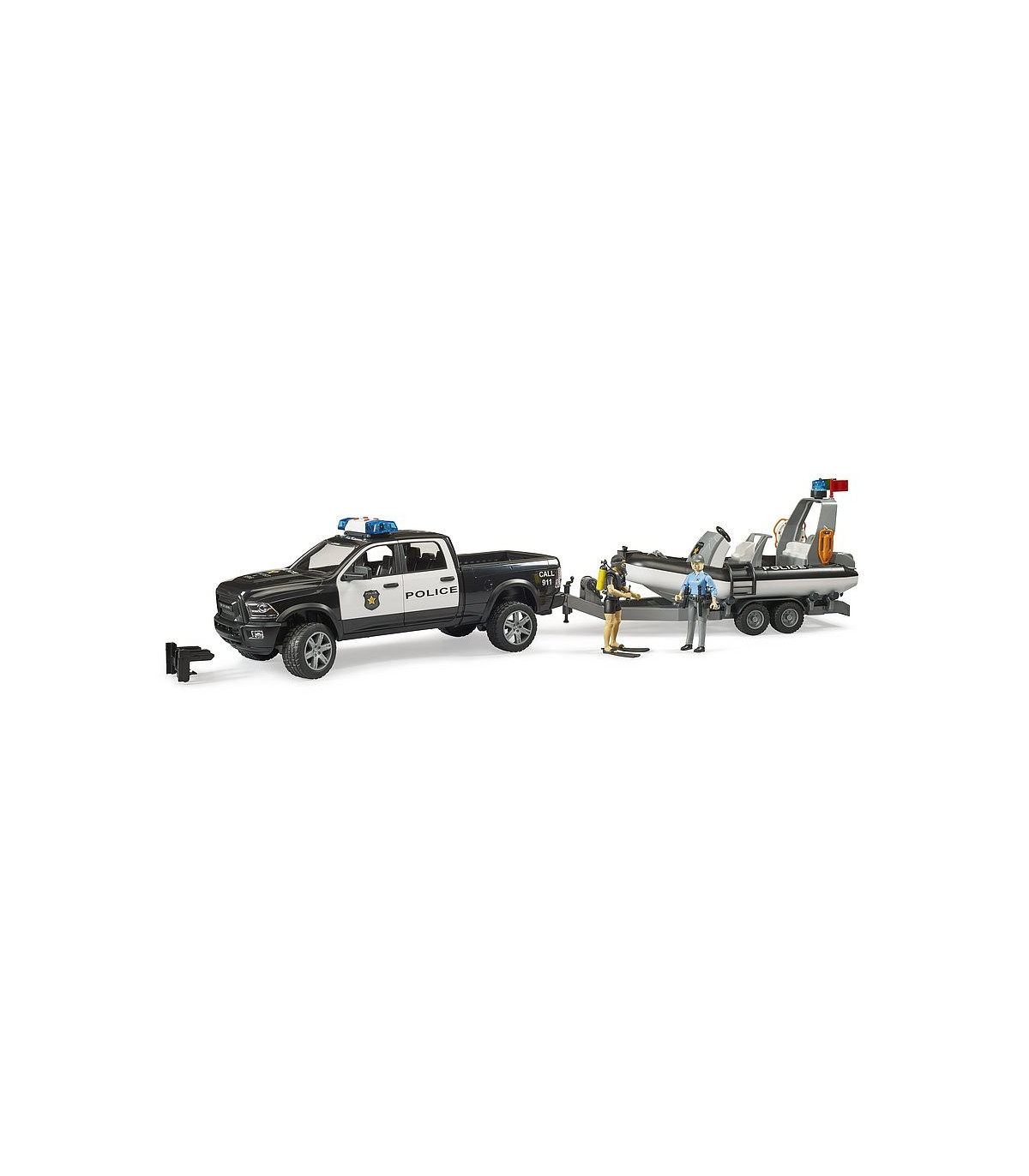 El Departamento de Policía de BRUDER ahora tiene refuerzos y amplía su ámbito de acción al agua. Para poder seguir utilizándose en cualquier tipo de aguas en el futuro, se añade a los servicios de intervención de BRUDER un camión policial 4x4 tipo pick-up con un bote y un buceador de servicio.