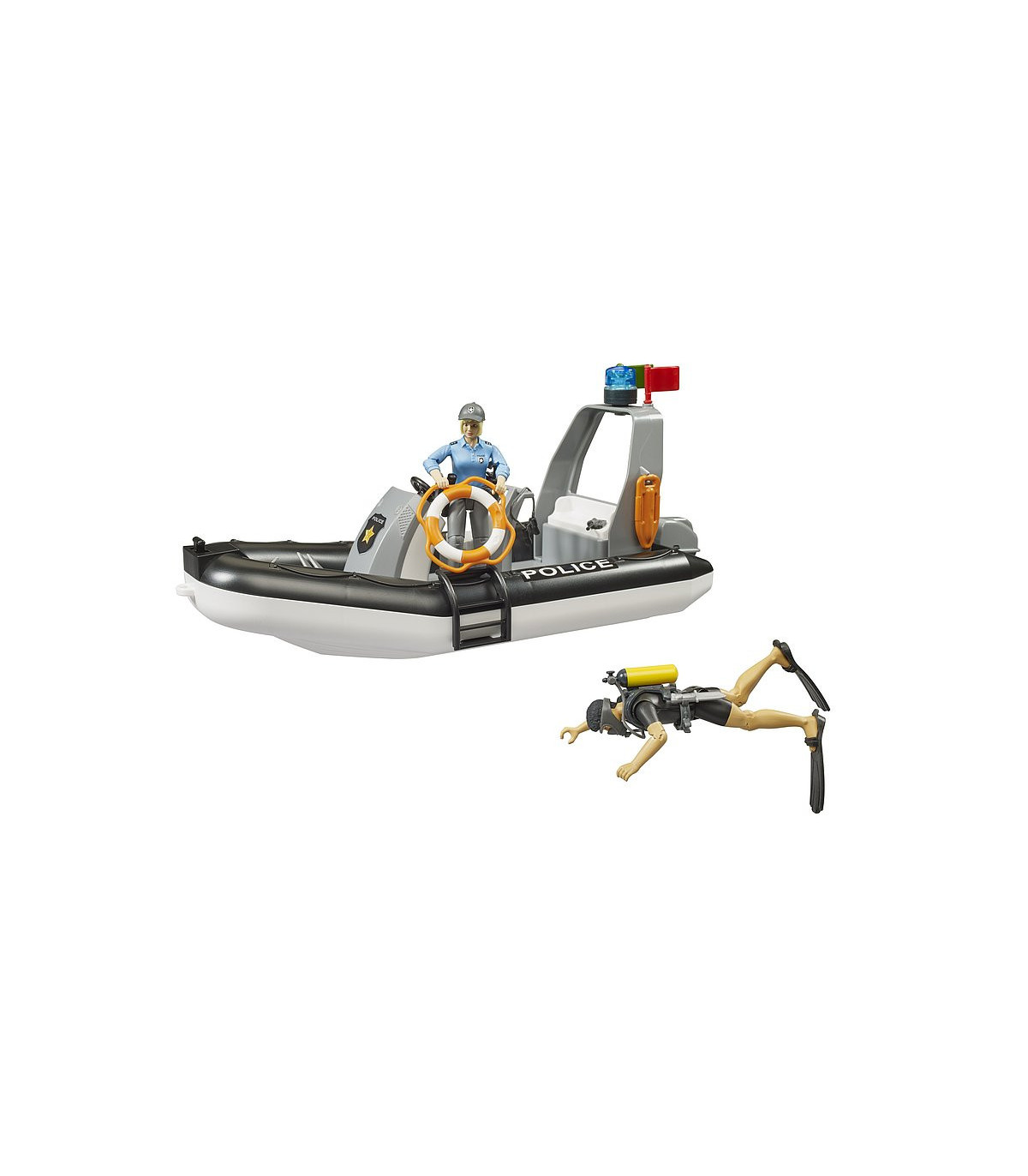 Dos figuras bworld amplían este completo set. Mientras que la mujer policía está destinada al control de la embarcación y el vehículo policial, el buceador de la policía completamente equipado se ocupa de las intervenciones en el agua.