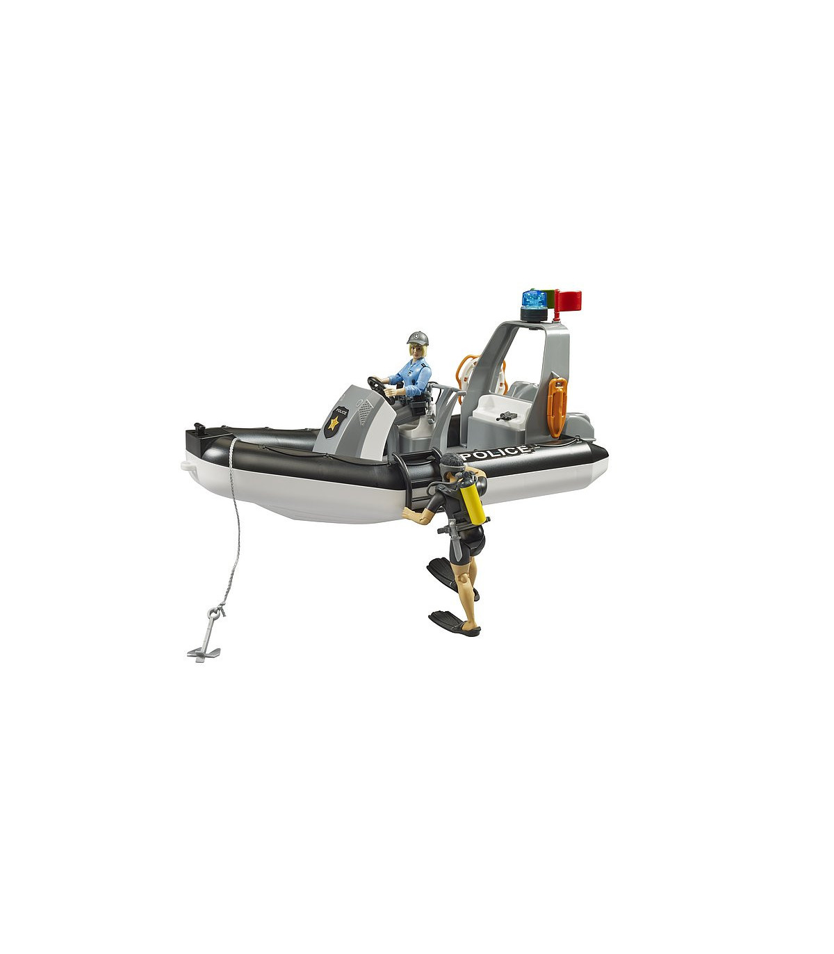 El bote de policía con consola de control es de gran ayuda en el día a día de la policía por su maniobrabilidad y versatilidad, y ofrece espacio para hasta 3 figuras bworld. Para que los niños puedan recrear las intervenciones de la forma más realista posible, el bote de policía BRUDER, que, como es natural, flota, está equipado con una luz omnidireccional.