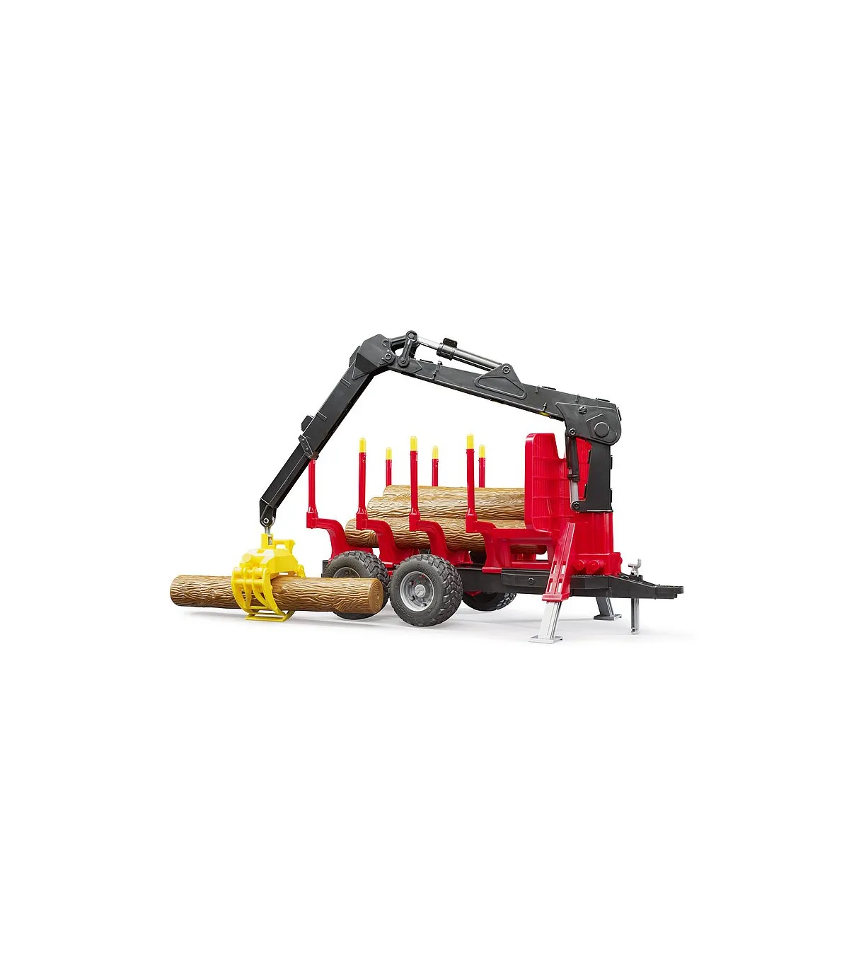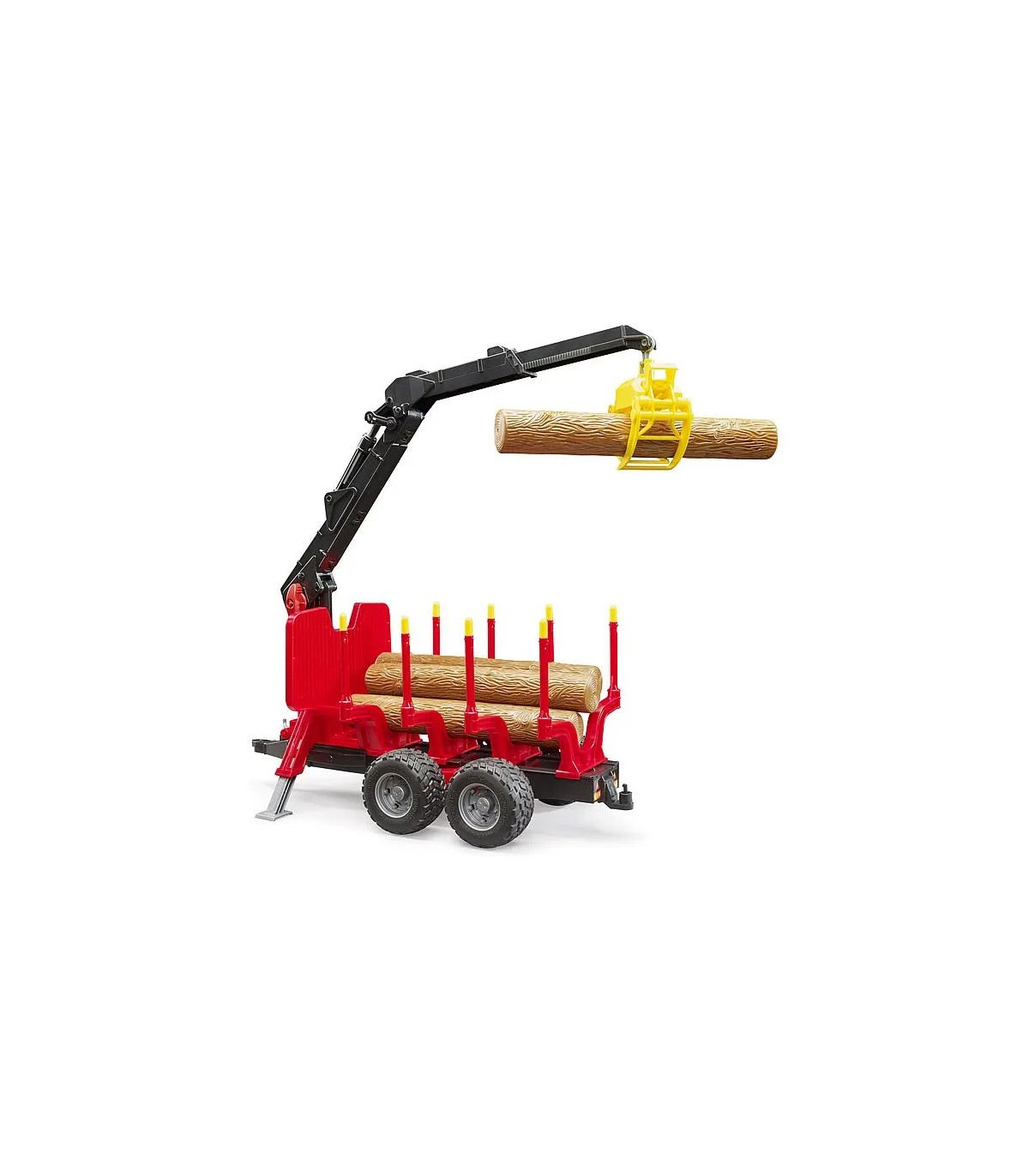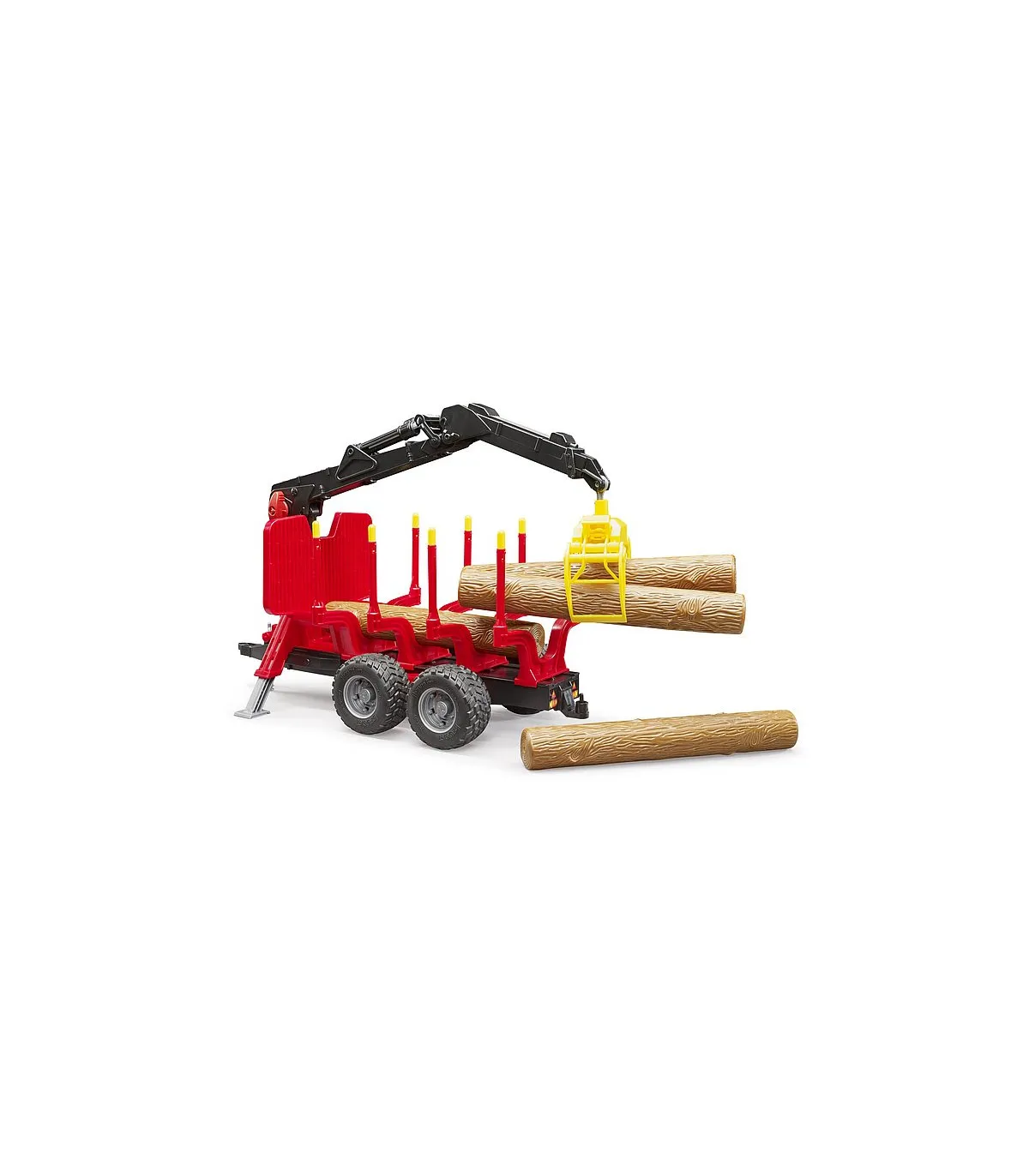La gama BRUDER en el sector forestal ha seguido creciendo. El nuevo remolque de transporte tiene una excelente figura tanto con los tractores forestales especiales como en combinación con muchos otros artículos. Ya equipado con cuatro troncos de árboles, este remolque funcional con un enganche de remolque y cuatro puntales ajustables le invita inmediatamente a jugar. Convence por su alta funcionalidad y detalles realistas. Gracias a los ejes pendulares todoterreno, el remolque puede hacer frente fácilmente a terrenos difíciles. El modelo está equipado con una grúa de carga giratoria y giratoria, por lo que los troncos de los árboles no solo se pueden transportar, sino también cargar y descargar. El acoplamiento trasero estándar existente se puede utilizar para acoplar elementos adicionales según sea necesario. Los neumáticos de banda de rodadura blanda completan el cuadro.
