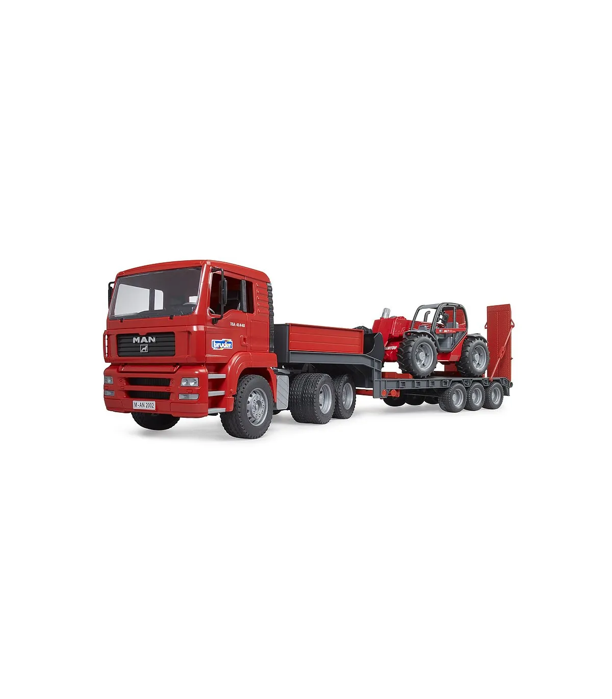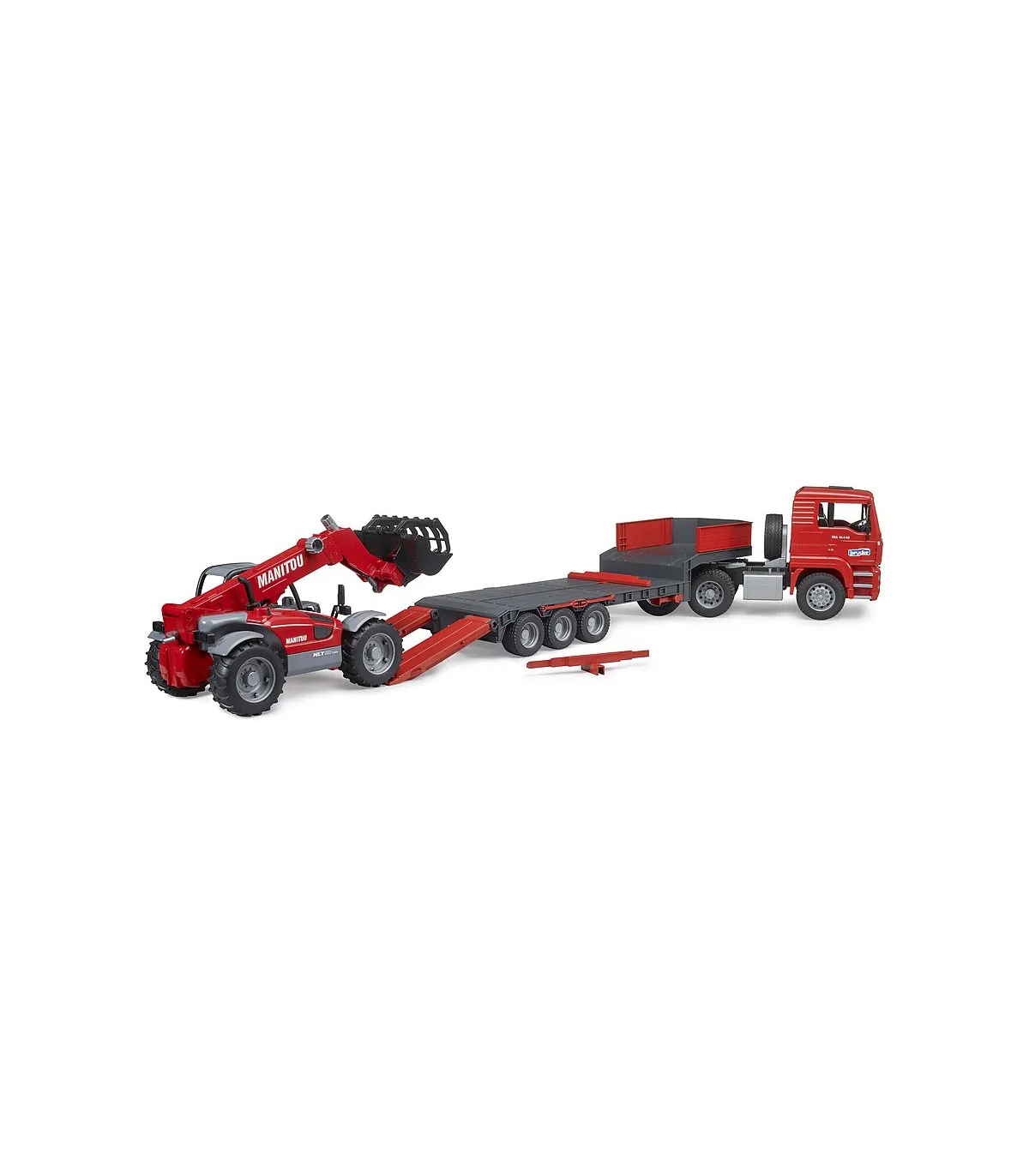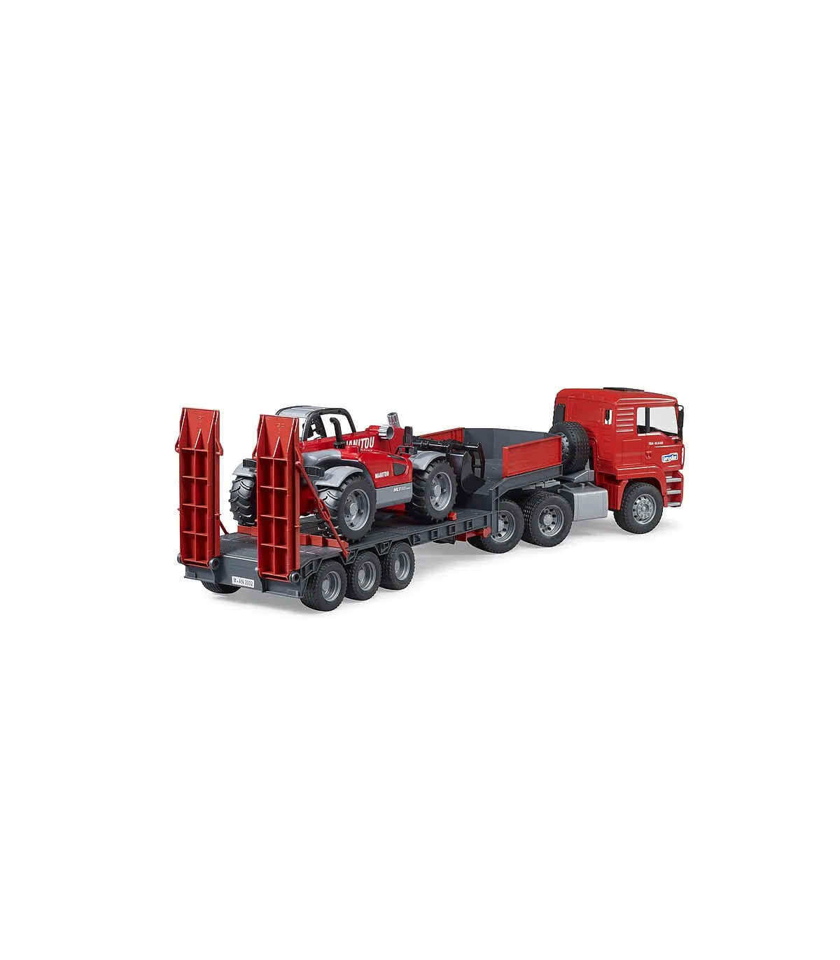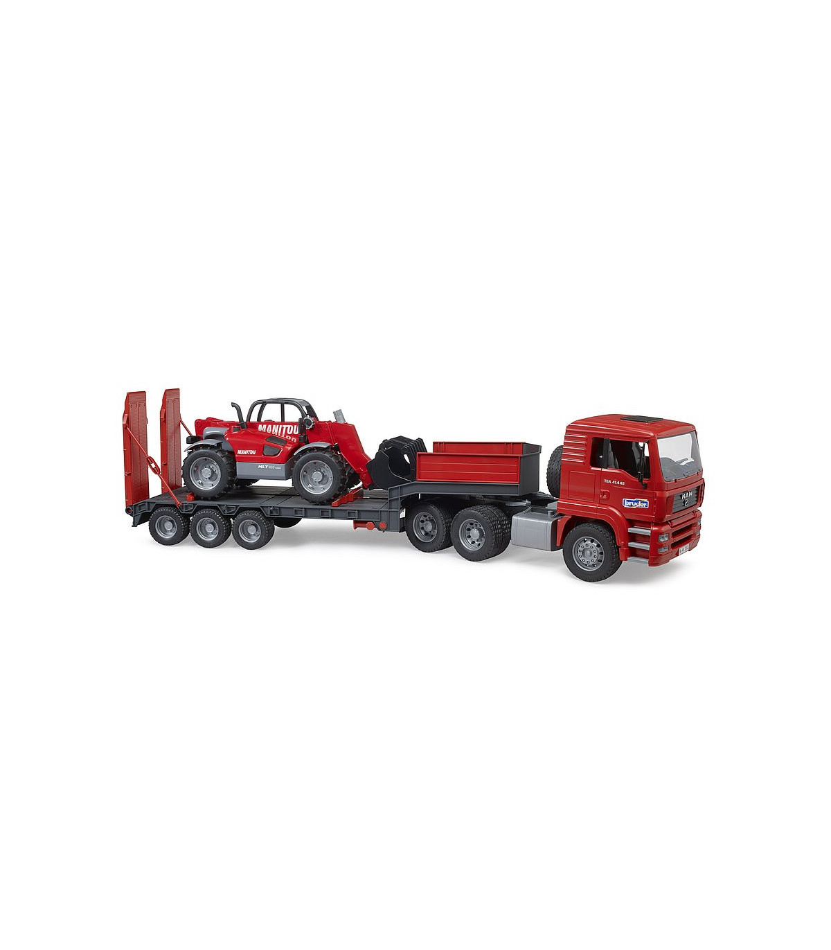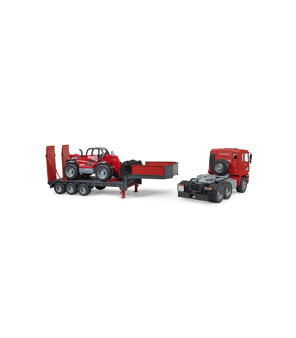 Las palas bajas se utilizan a menudo para resolver tareas de transporte pesado, como el transporte de grandes máquinas de construcción de una obra a otra. En el mundo temático de la construcción de BRUDER, el camión de plataforma baja MAN TGA transporta un Manitou MT633 a la siguiente obra. Este impresionante vehículo cuenta con las características conocidas del camión de plataforma baja MAN, como el acoplamiento giratorio del remolque totalmente funcional, los soportes plegables y las rampas de acceso móviles. El manipulador telescópico dirigible incluido tiene un brazo telescópico extensible y ajustable en altura, así como una pala extraíble.