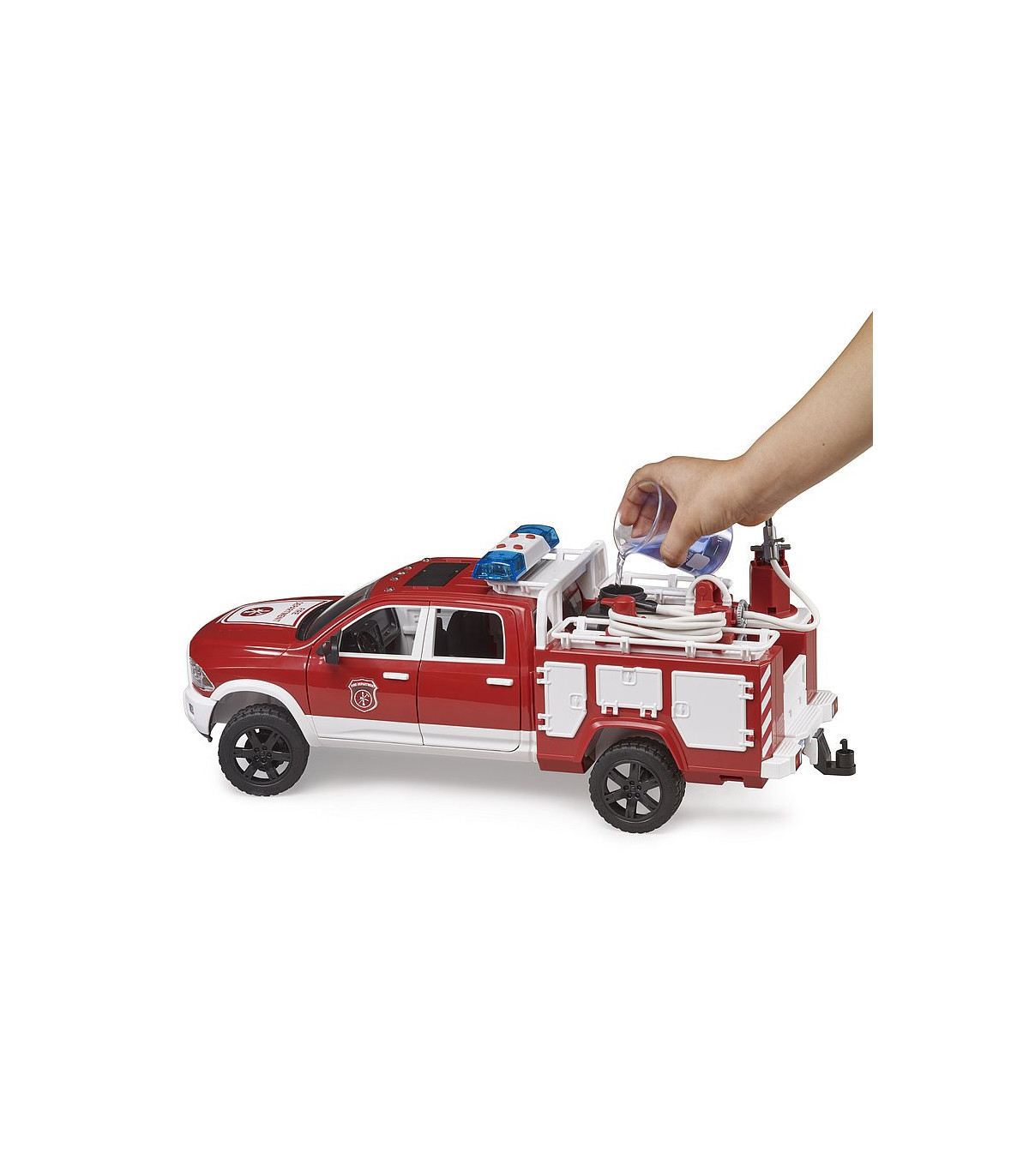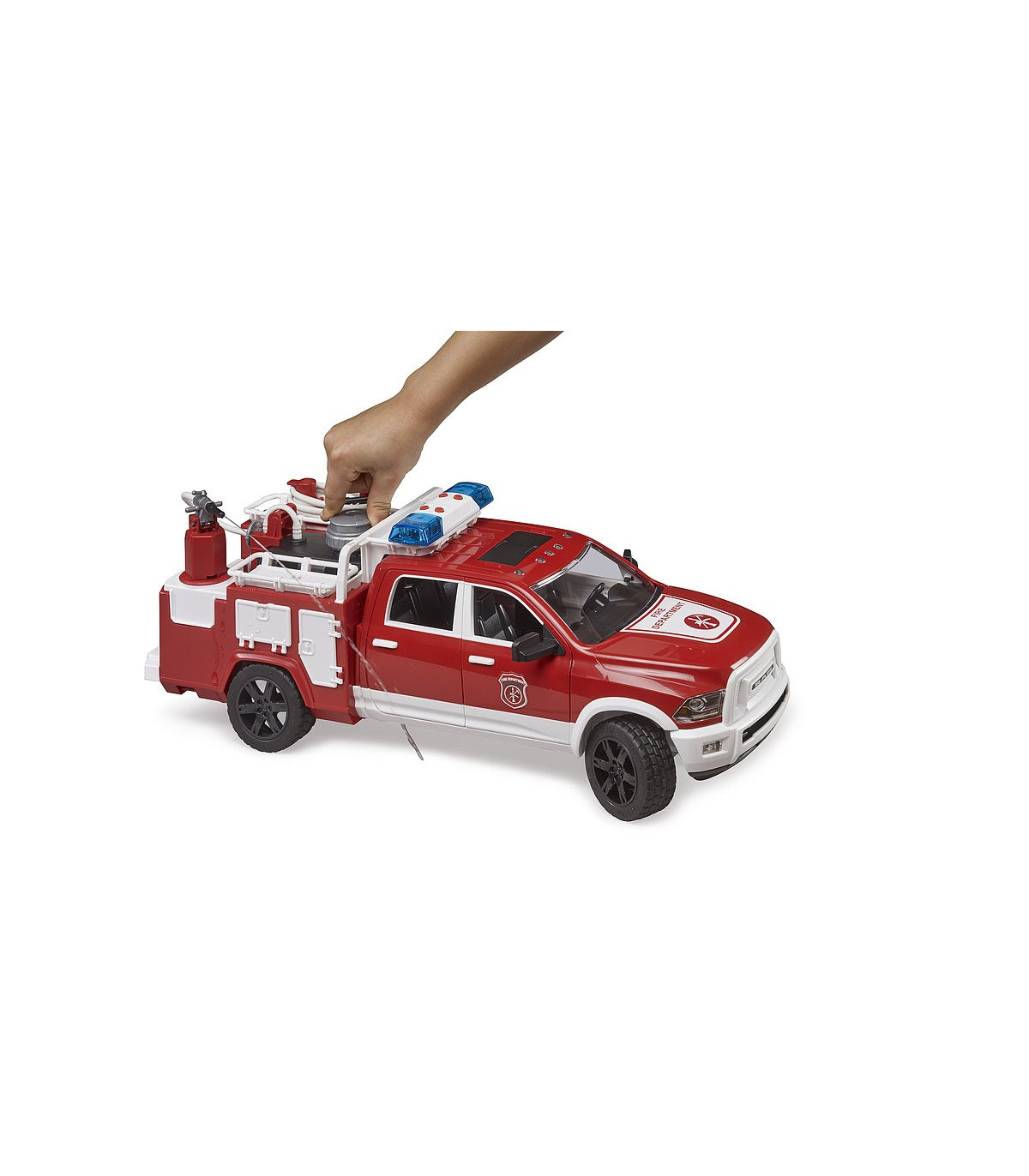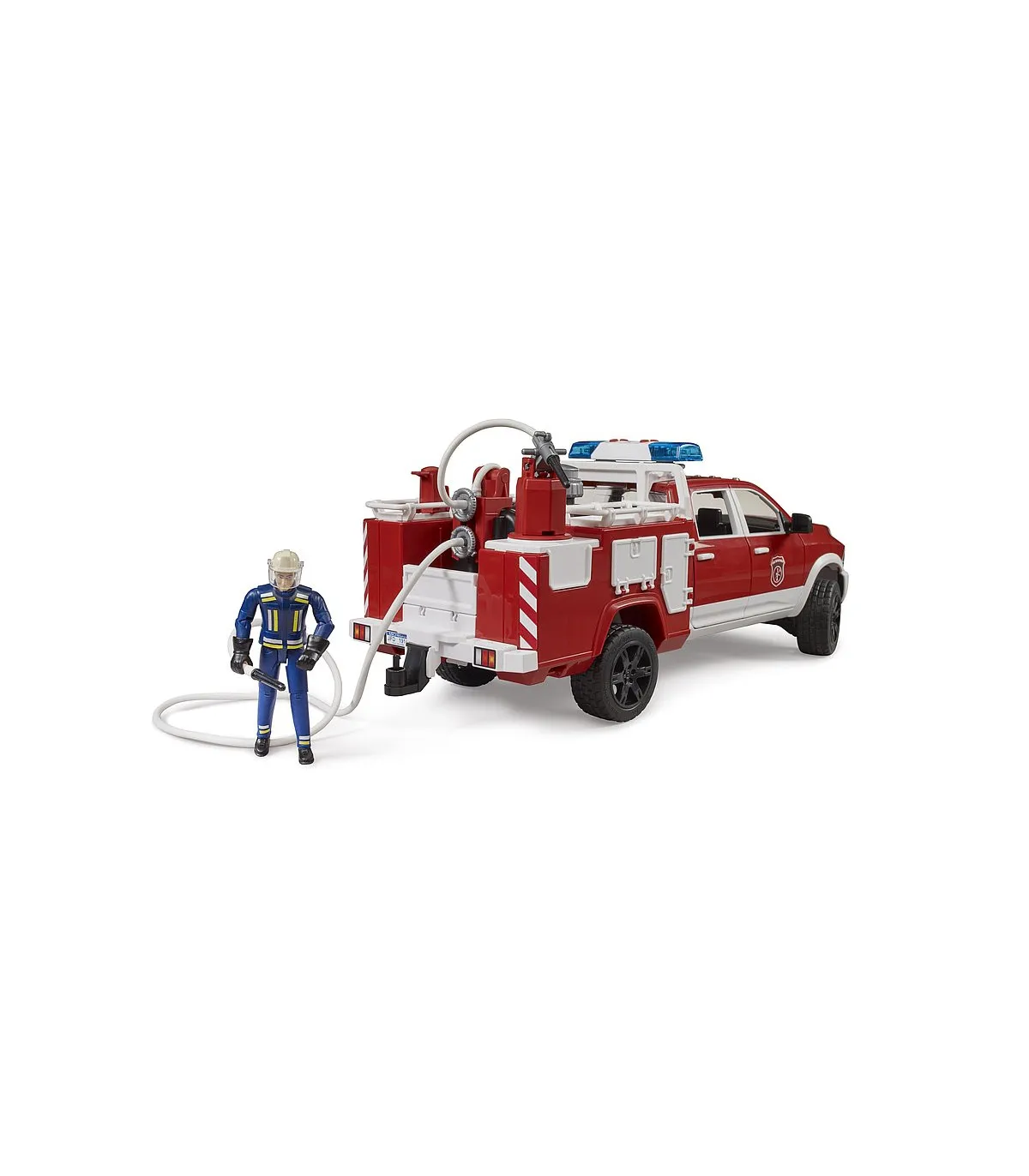 La marca RAM goza de gran reputación, no solo en el ámbito del ocio. Esta camioneta también se utiliza como base para una gran variedad de vehículos industriales, ya que este modelo se ha desarrollado como «camión de recogida de gran rendimiento» de RAM. El camión de bomberos RAM es la última incorporación al sector de los vehículos de emergencia. Gracias a sus ejes con suspensión y a la prolongación del volante, este vehículo de bomberos tiene buena tracción a las cuatro ruedas. Con el nuevo sistema de depósito y el cañón de agua, se llega a zonas de incendios de difícil acceso. Para otros focos de incendio, se puede usar una segunda manguera conectada al depósito de agua. En los numerosos compartimentos se pueden guardar las herramientas necesarias y los extintores de incendios. Este vehículo tiene todo lujo de detalles y también incluye un módulo de luces y sonido. Puede acompañar el camión con el bombero bworld (n°. de art. 60100) o la estación de bomberos bworld (n°. de art. 62702).