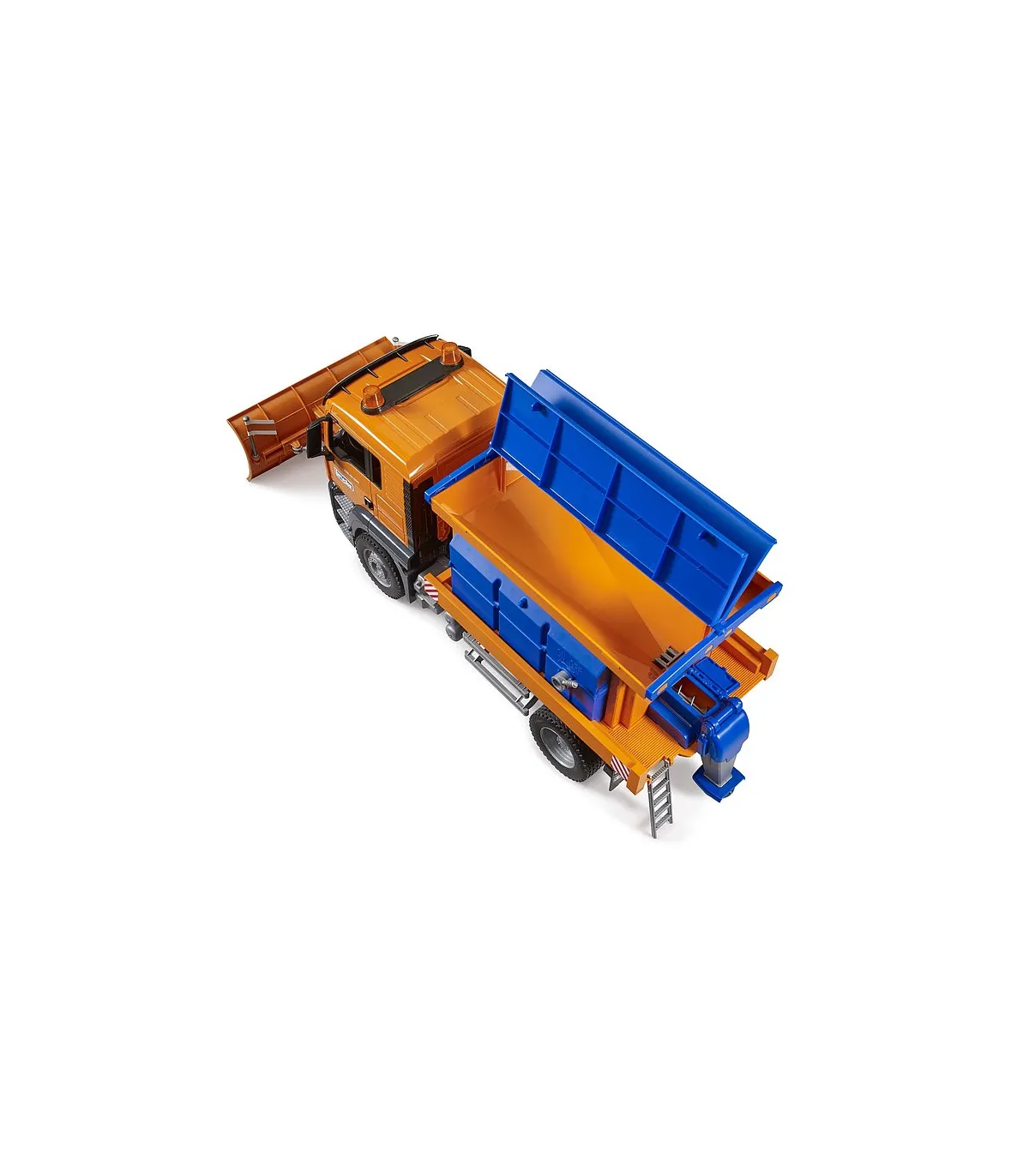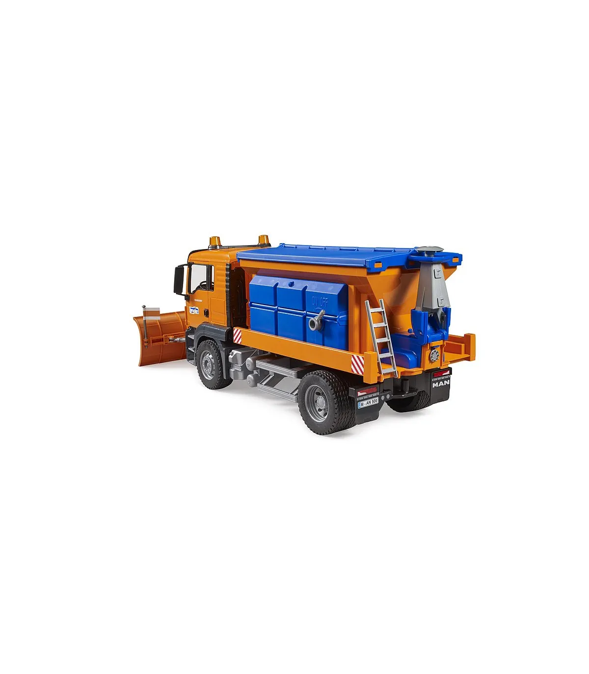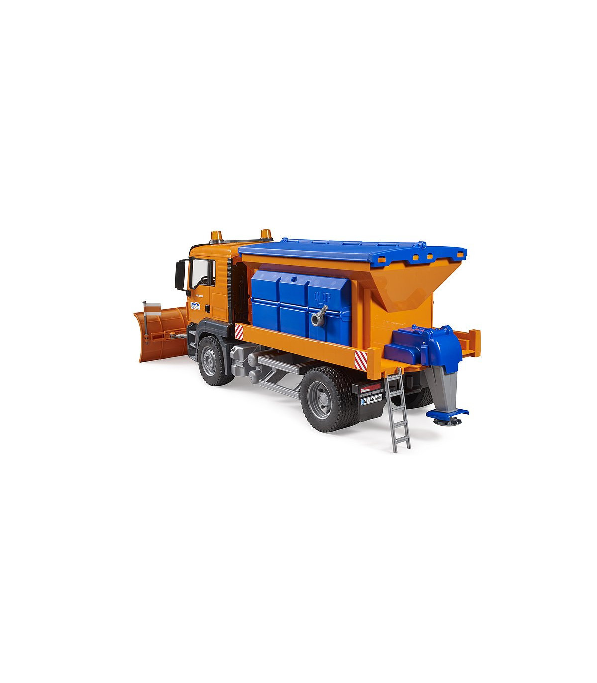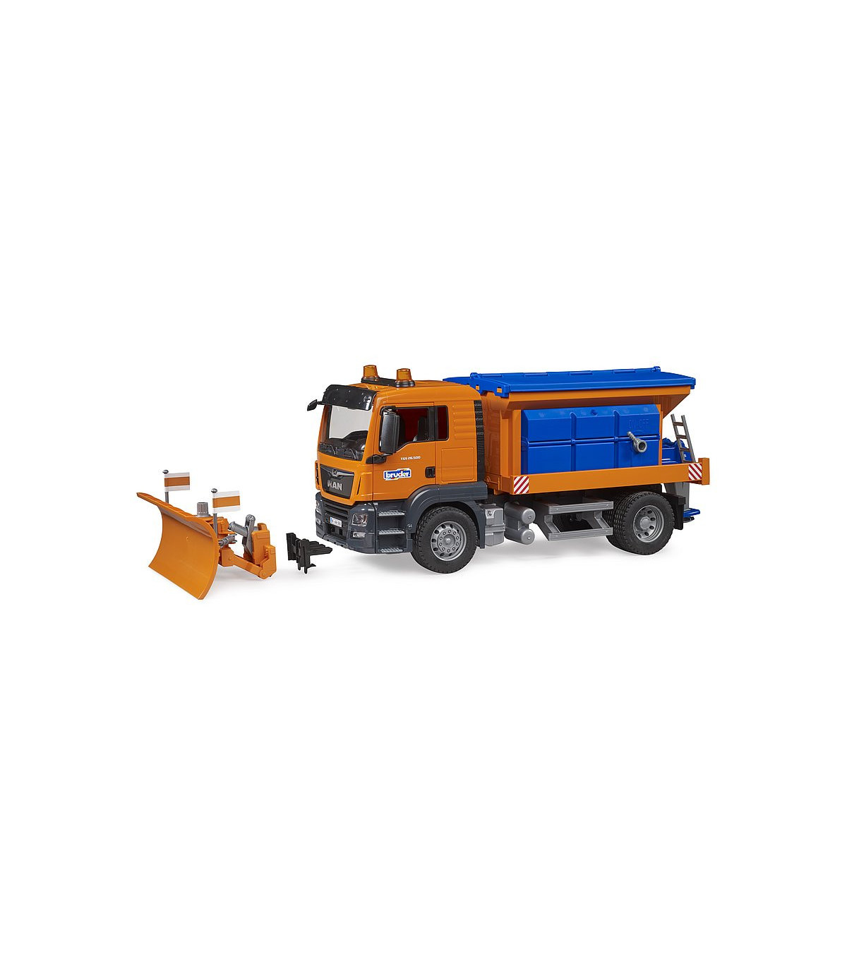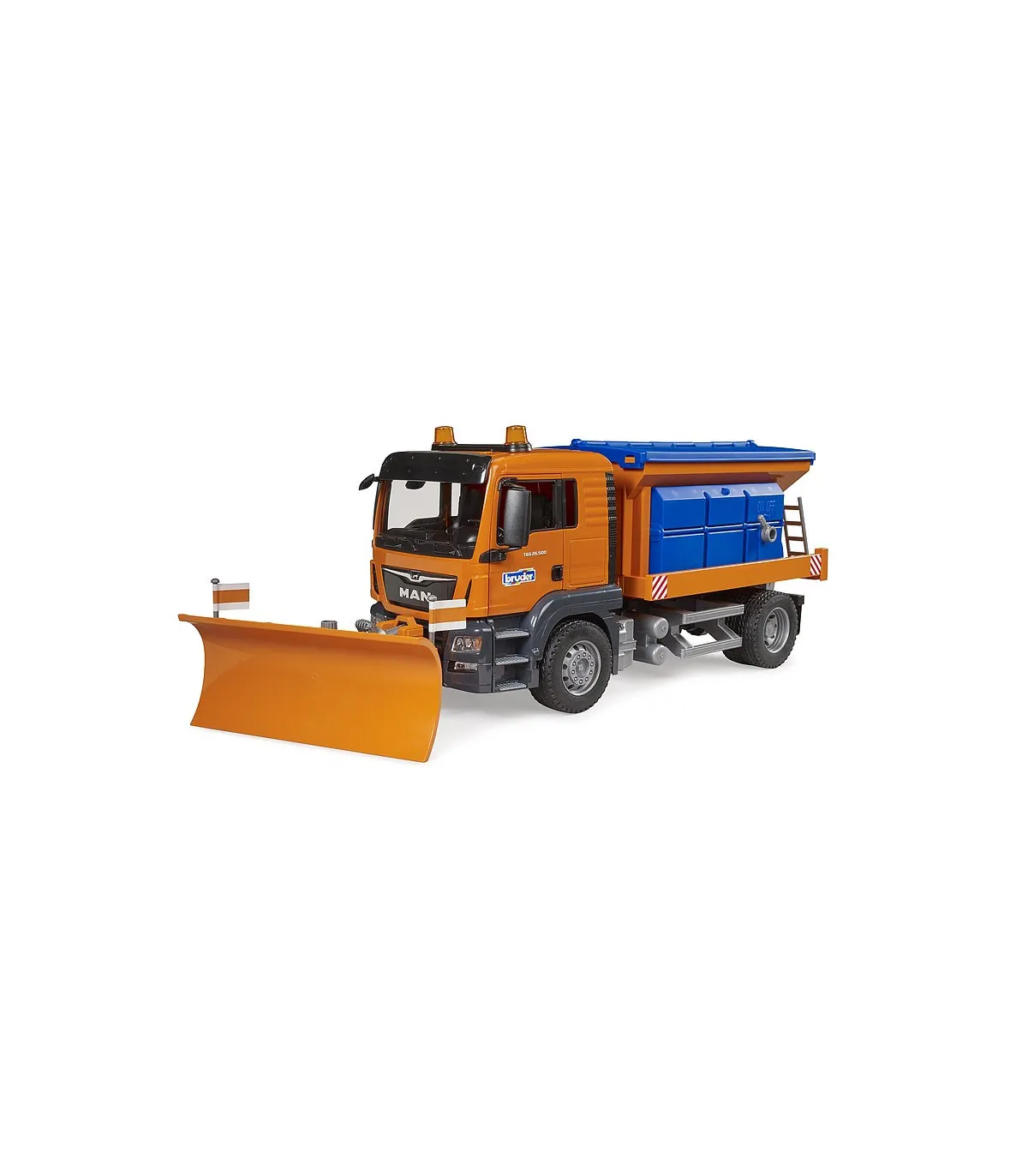 «...fuertes nevadas hasta en cotas bajas...», tan pronto como escuchemos esto en la radio con información sobre tráfico, estarán de servicio permanente las quitanieves. BRUDER, conocida por sus vehículos realistas y aptos para todo tipo de clima, ha desarrollado con el MAN TGS de servicio de invierno un impresionante vehículo de limpieza de nieve que no tiene nada que envidiar al original. La pala niveladora ancha, regulable en altura y que también se puede quitar es capaz de retirar hasta la cubierta de nieve más grandes dejando un carril transitable y el mecanismo de esparcido totalmente realista puede esparcir arena u otro material para conseguir así que se pueda circular sin resbalar. El camión MAN TGS puede ser reequipado con el módulo de luz y sonido BRUDER (n.º art. 02801).