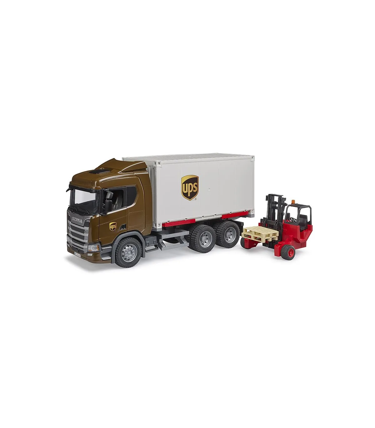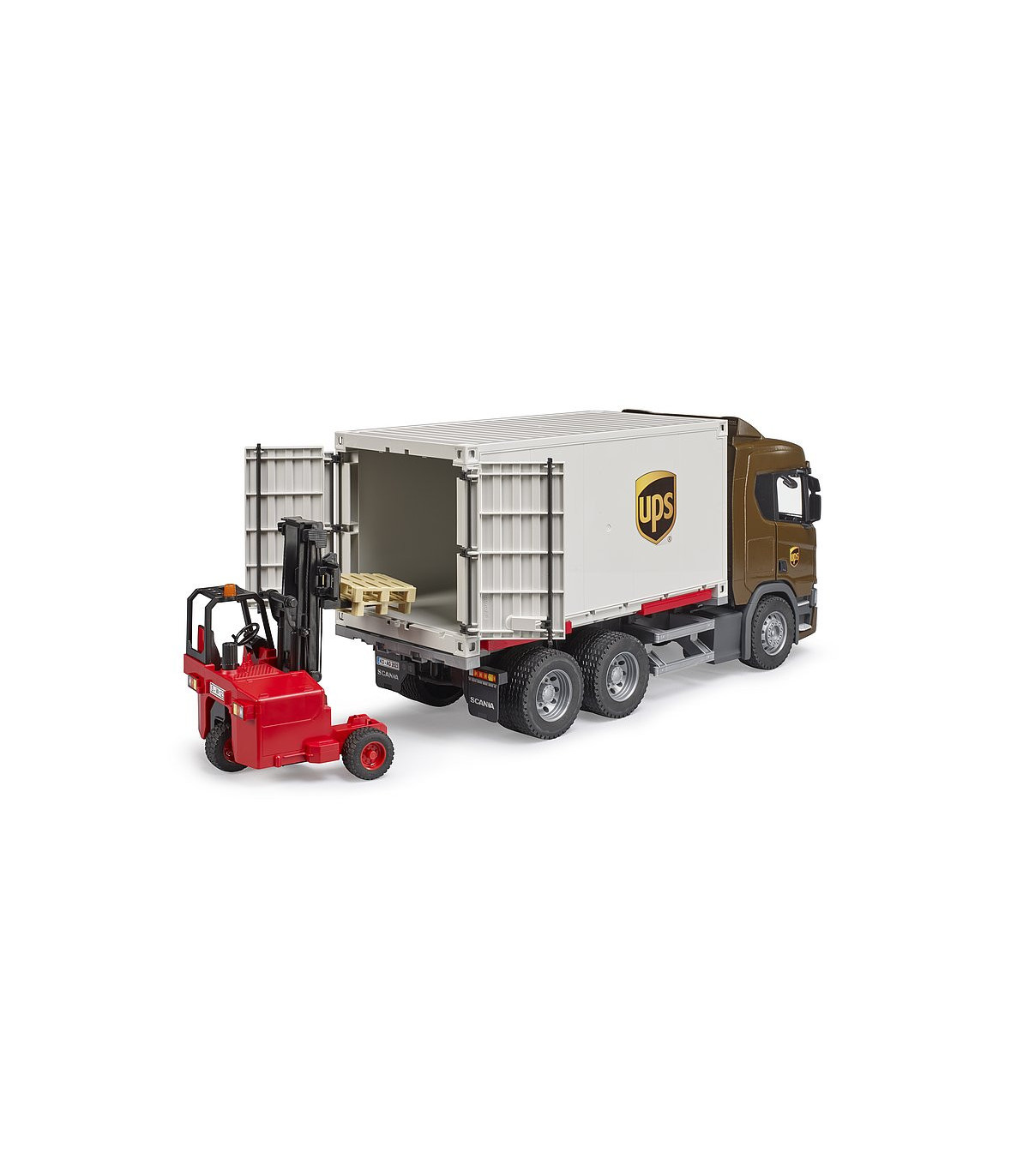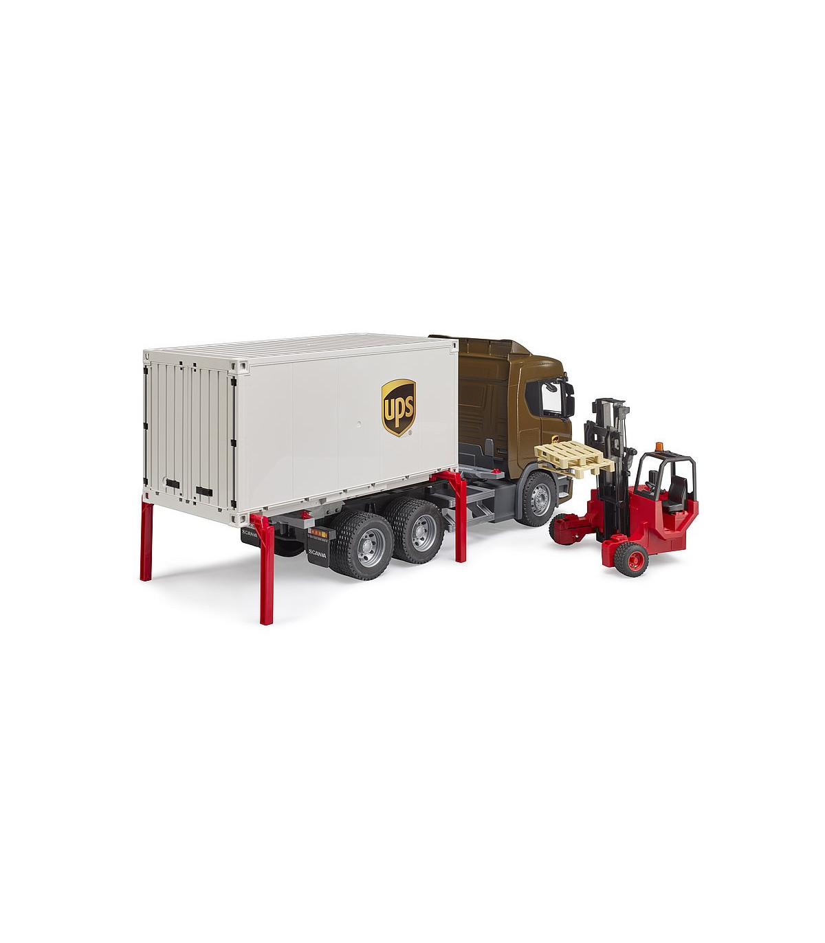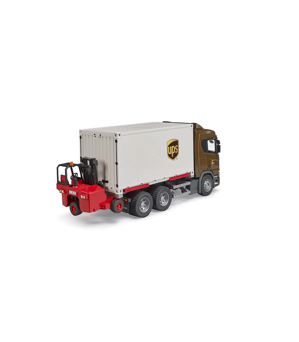 BRUDER ofrece ahora una versión con tres ejes, una plataforma intercambiable de contenedor, así como un toro transportable. La estructura del contenedor del vehículo tractor puede desarmarse en todas sus piezas individuales y tiene una puerta de dos hojas en la parte trasera. Otra posibilidad de juego destacada de este vehículo es la plataforma intercambiable, la cual se puede separar del vehículo automáticamente al extraerla y extender sus pies de apoyo y eleva el contenedor, permitiendo entonces que el camión circule por debajo de la plataforma intercambiable. La nueva cabina del conductor muestra el diseño dinámico típico de Scania de la nueva serie R. Por supuesto, se incluyen también retrovisores exteriores abatibles, así como un acristalamiento de policarbonato de alta calidad, puertas que pueden abrirse o la posibilidad de añadir un módulo de luces y sonido.