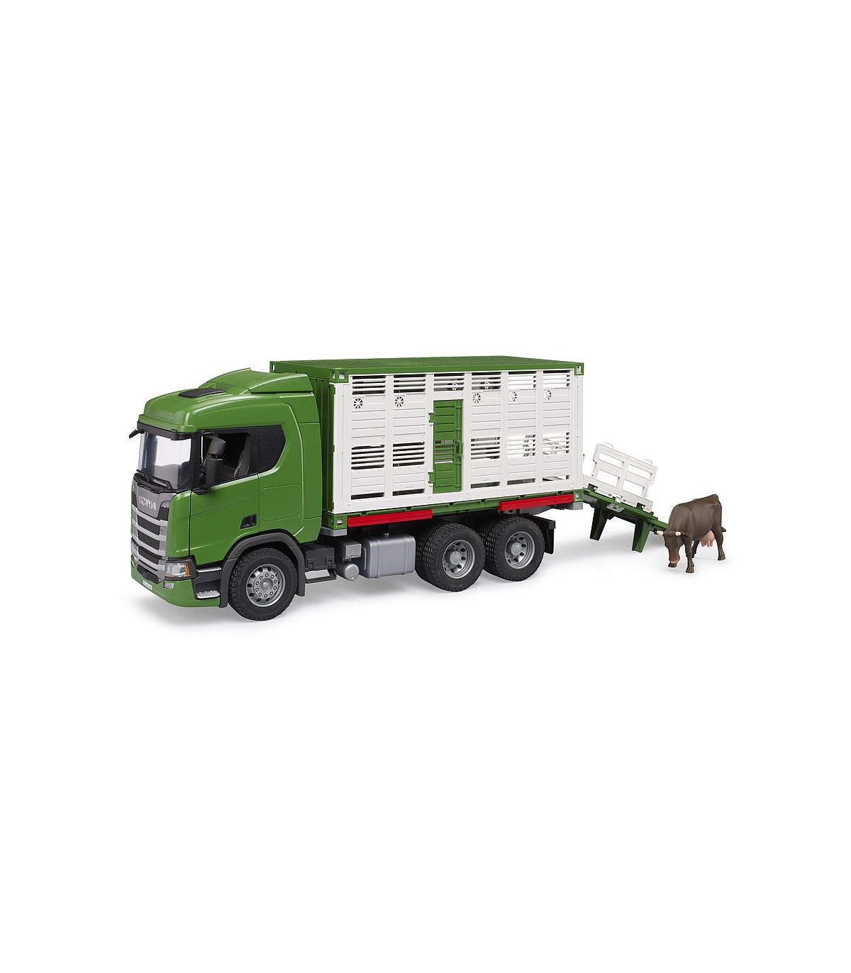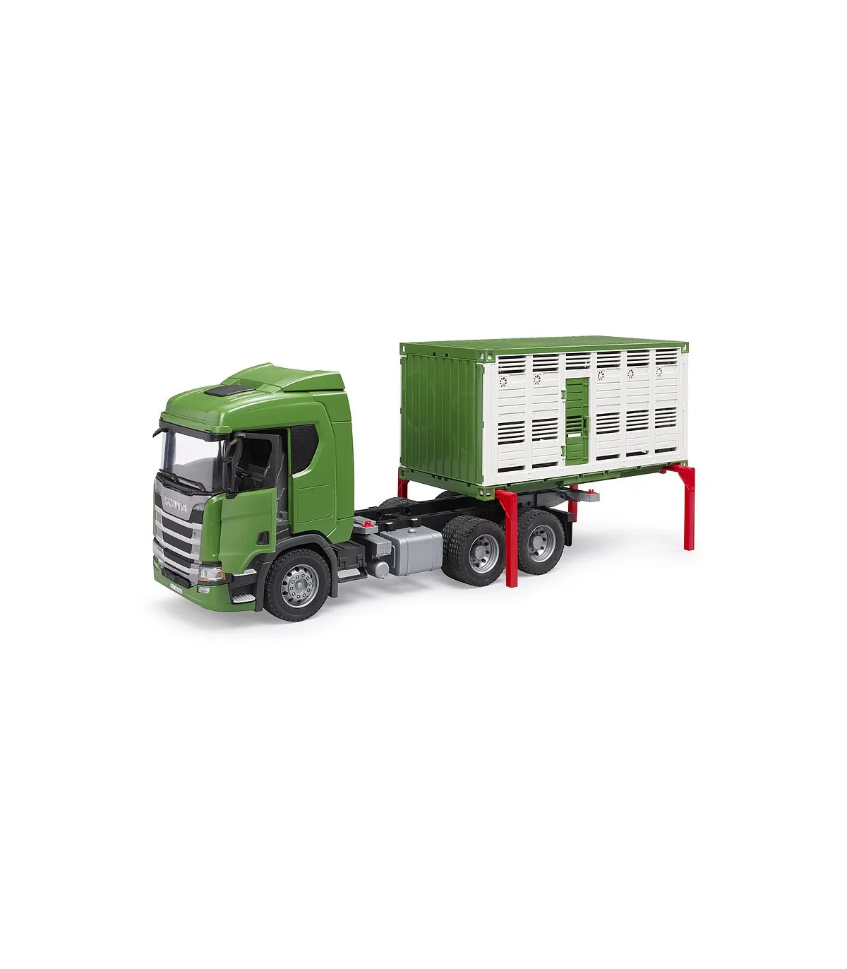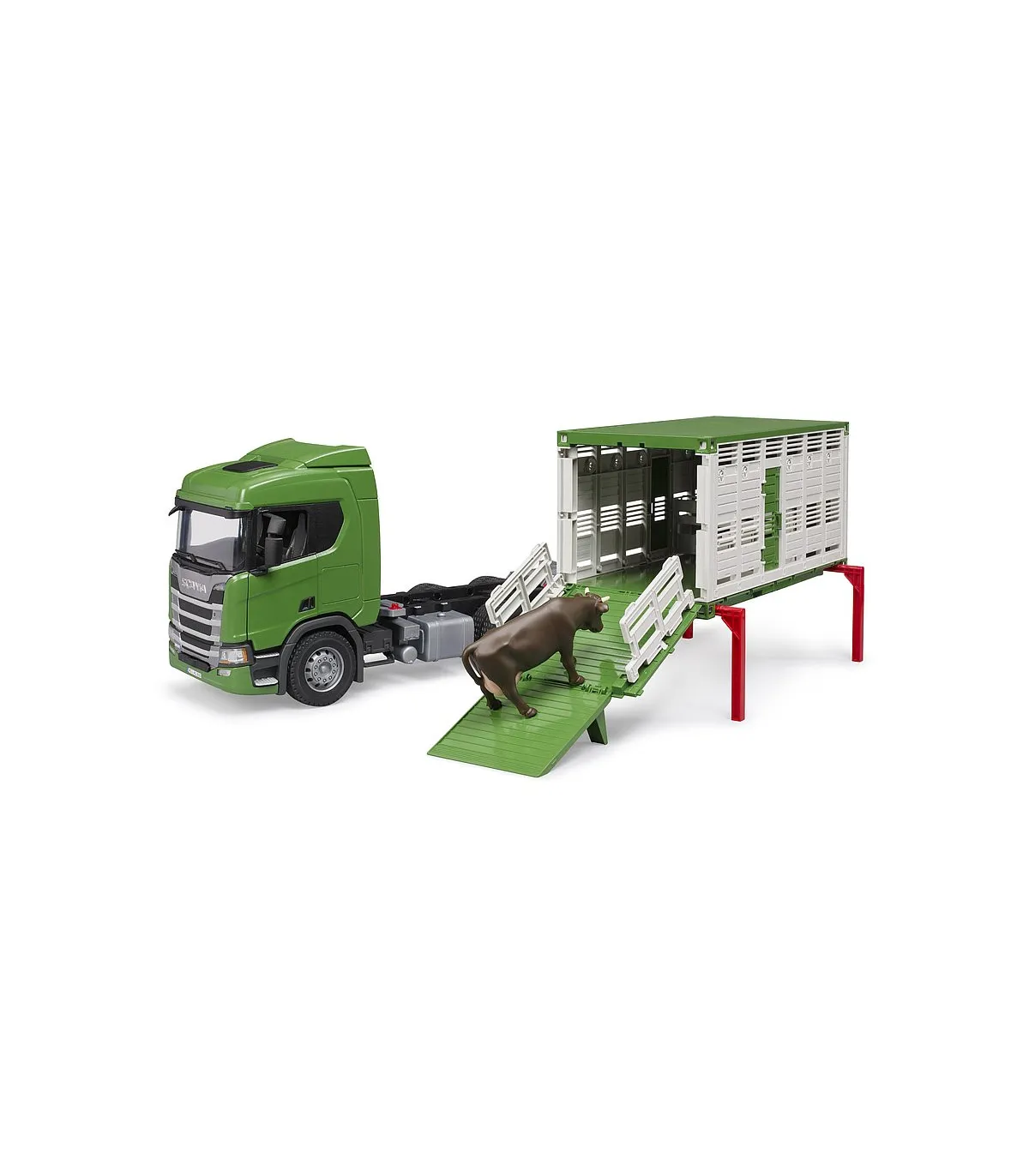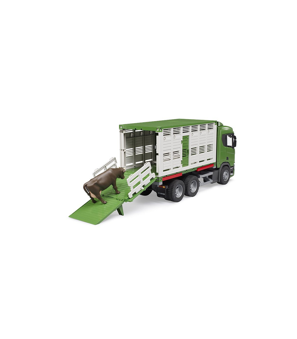 El camión de transporte de animales incluye todo lo necesario hoy en día para un transporte adecuado y adaptado a los animales: carga y descarga de animales sin peligro de lesiones mediante una rampa abatible y ampliable con rejas que pueden plegarse hacia arriba, rejas separadoras interiores plegables para ajustarse a la necesidad de espacio de las diferentes especies, bebederos que se pueden colgar, etc. Se incluye una res a escala de Scania, además de vacas y toros adicionales con los números de artículo 02308 y 02309. La nueva cabina del conductor muestra el diseño dinámico típico de Scania. Dispone de retrovisores exteriores abatibles y de puertas que se pueden abrir, y también se puede complementar con un módulo de luz y sonido (n.º de artículo 02801).
