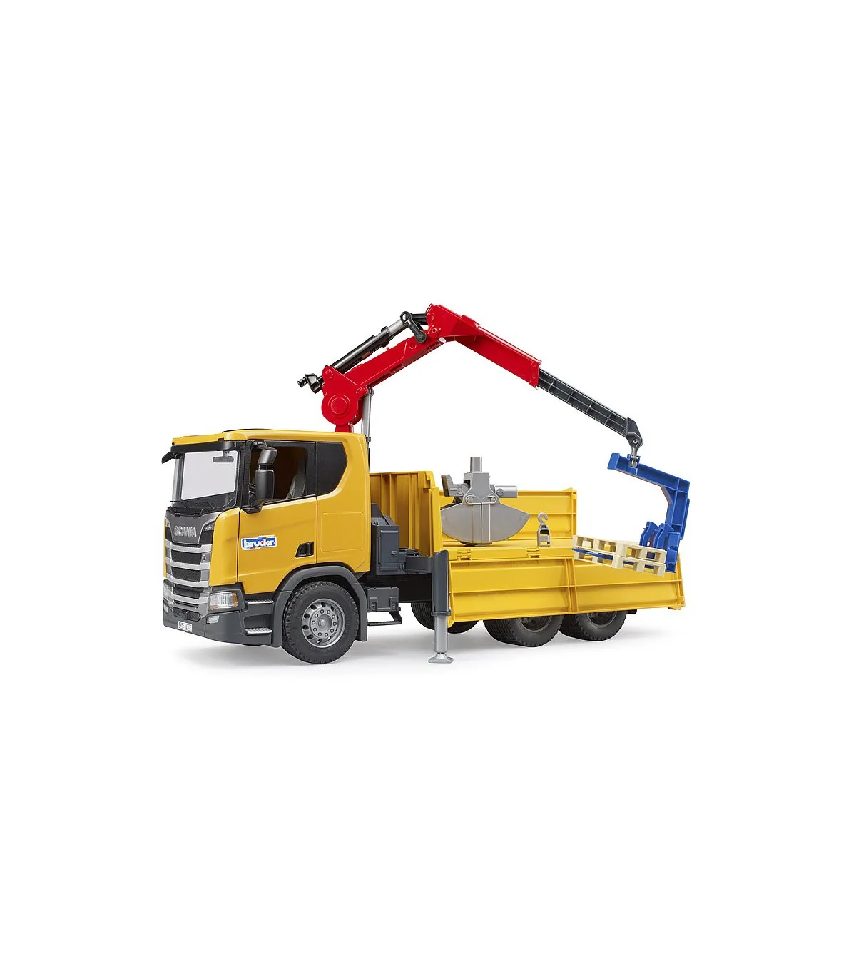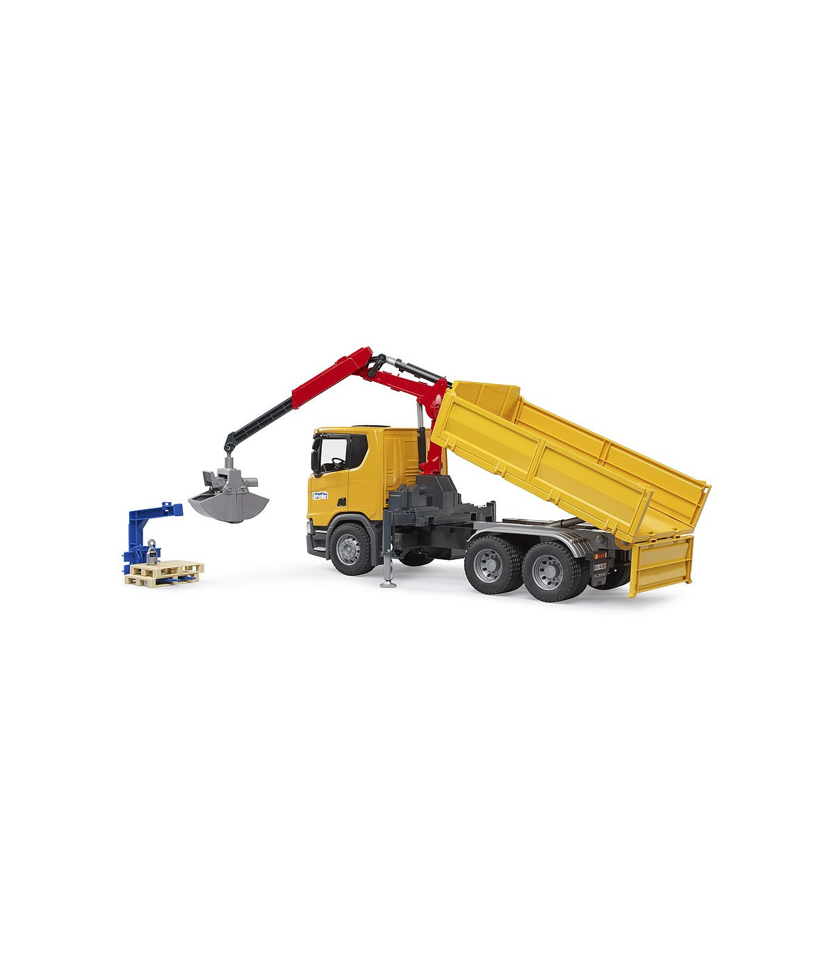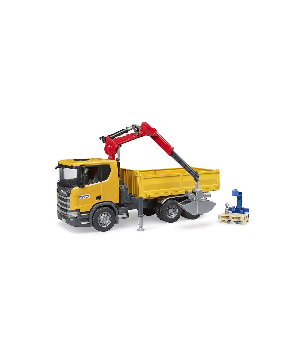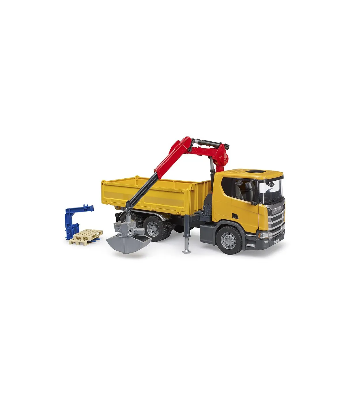 La nueva cabina del conductor muestra el diseño dinámico típico de Scania. Dispone de retrovisores exteriores abatibles y puertas que se abren. La carrocería del vehículo está formada por una superficie de carga basculante con tres paredes laterales abatibles. La parte posterior de la cabina del conductor dispone de una grúa de carga giratoria, plegable y telescópica que gira 360°. Se puede mover libremente a manoy colocar en cualquier posición con el dispositivo de bloqueo. Además, contiene soportes extensibles y abatibles en el lateral de la grúa de carga para proporcionar más estabilidad al vehículo durante el proceso de carga. El juego puede comenzar de inmediato gracias a la horquilla de palés con dos palés y a la cuchara de la pala incluidos.