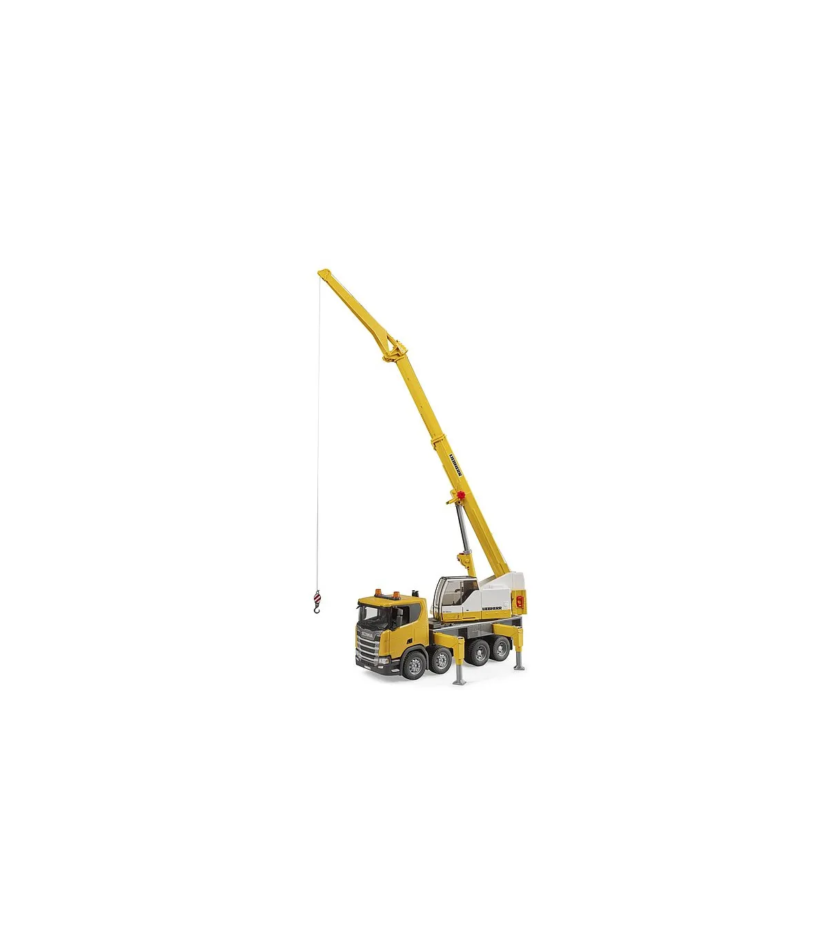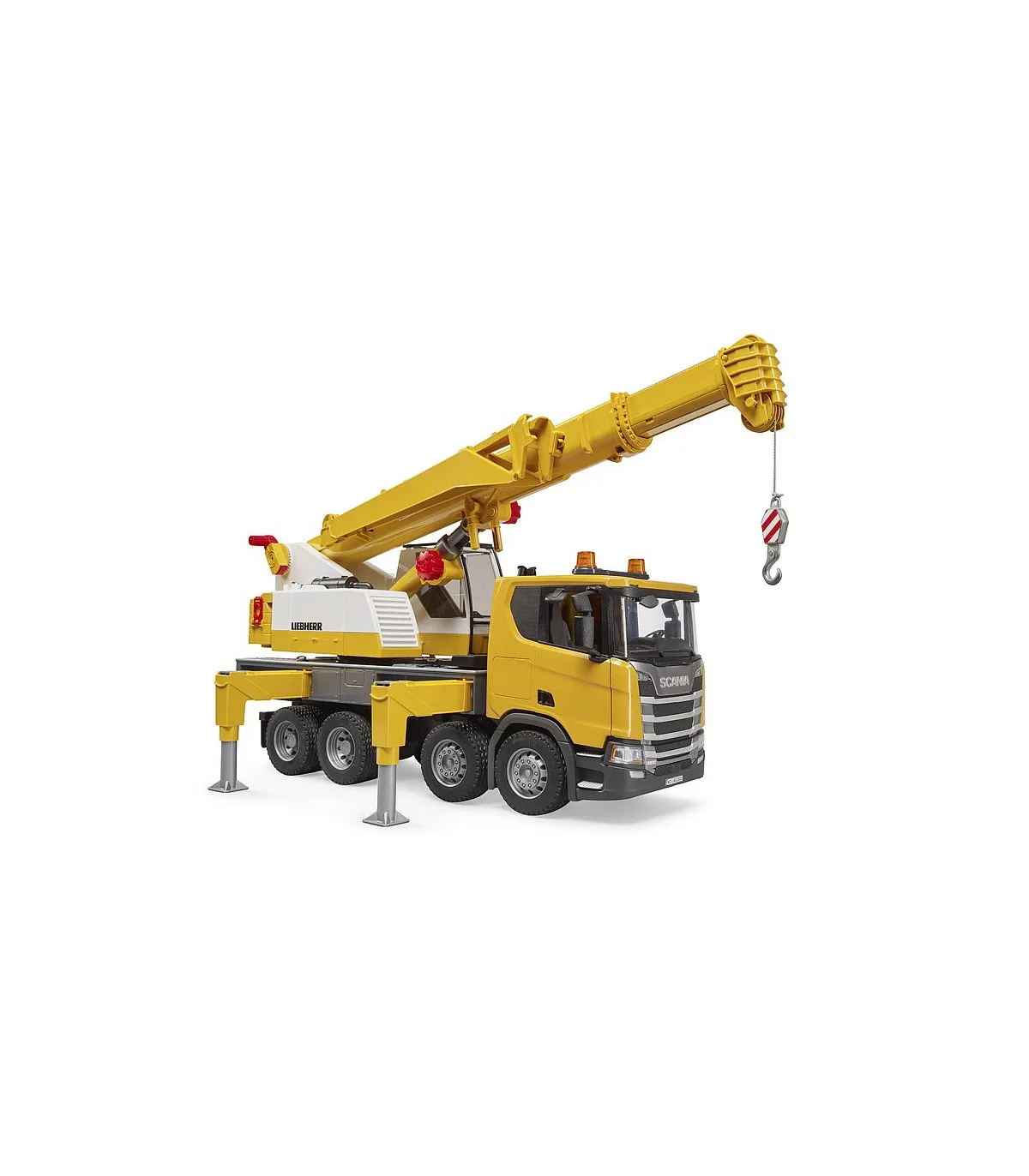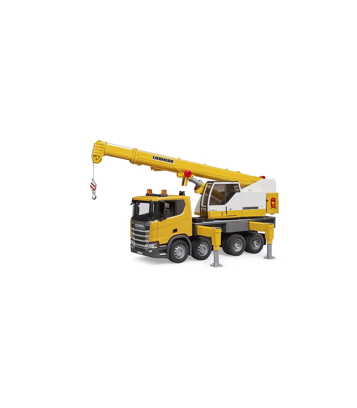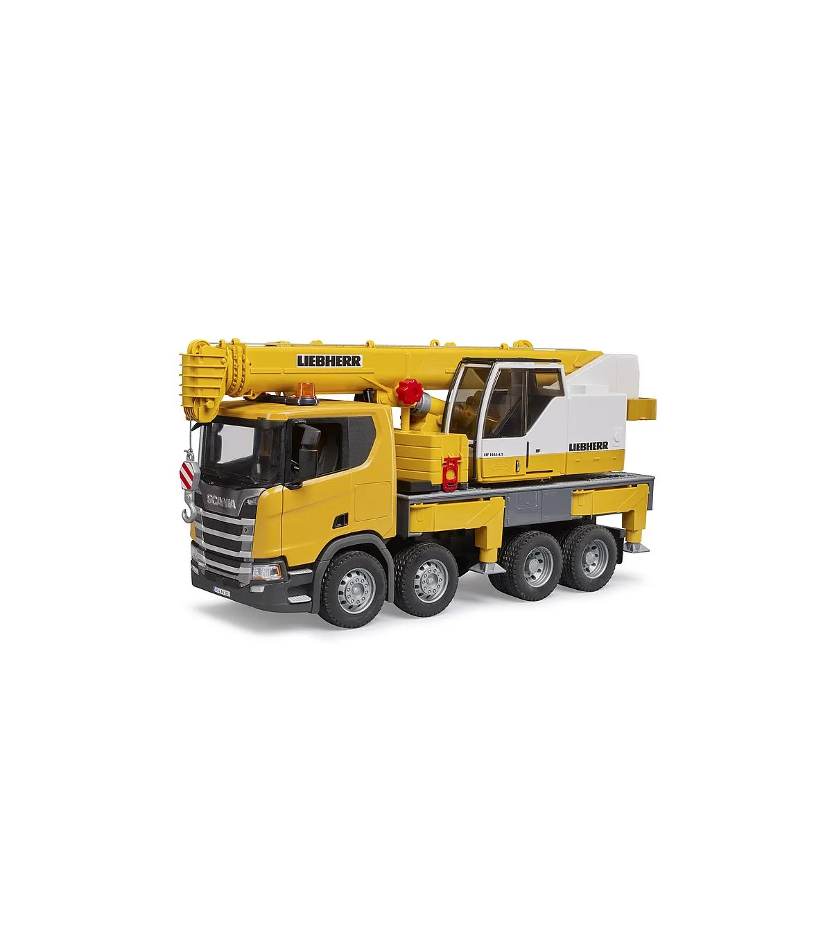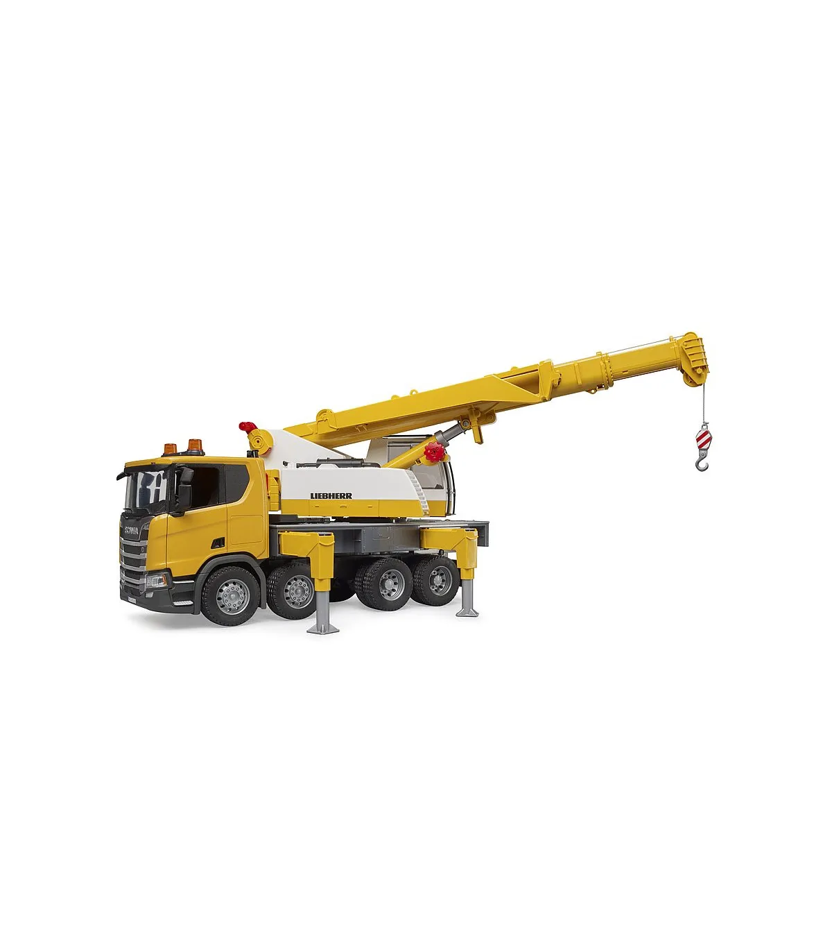 El camión grúa tiene unas dimensiones considerables cuando la longitud del brazo telescópico está extendida y puede alargarse más con una pluma adicional. La grúa mide 1,30 m de altura con el brazo de la grúa totalmente extendido y recto; más que algunos de los pequeños constructores. Por supuesto, la estabilidad es imprescindible con estas dimensiones. Se consigue una elevada estabilidad frente al vuelco gracias a las patas de apoyo orientables y ajustables individualmente de la plataforma del vehículo. Si se desea una mayor estabilidad, se puede utilizar el contrapeso adicional, al igual que en la grúa original. El modelo se puede rellenar con arena para que tenga el peso suficiente. El torno de cable con dispositivo de bloqueo y seguro contra sobrecarga permite un manejo sencillo del gancho de la grúa durante la elevación y el descenso, incluso con piezas grandes. Al igual que en el original, la cabina del operador dispone de un bastidor de protección con cristal y una puerta corredera que se puede abrir. El compartimento de herramientas integrado en la plataforma completa las numerosas funciones de la grúa. La nueva cabina del conductor del Scania Super R está diseñada con puertas que se abren y retrovisores exteriores abatibles. El módulo de luces y sonido de BRUDER también está incluido para ofrecer una mayor diversión.
