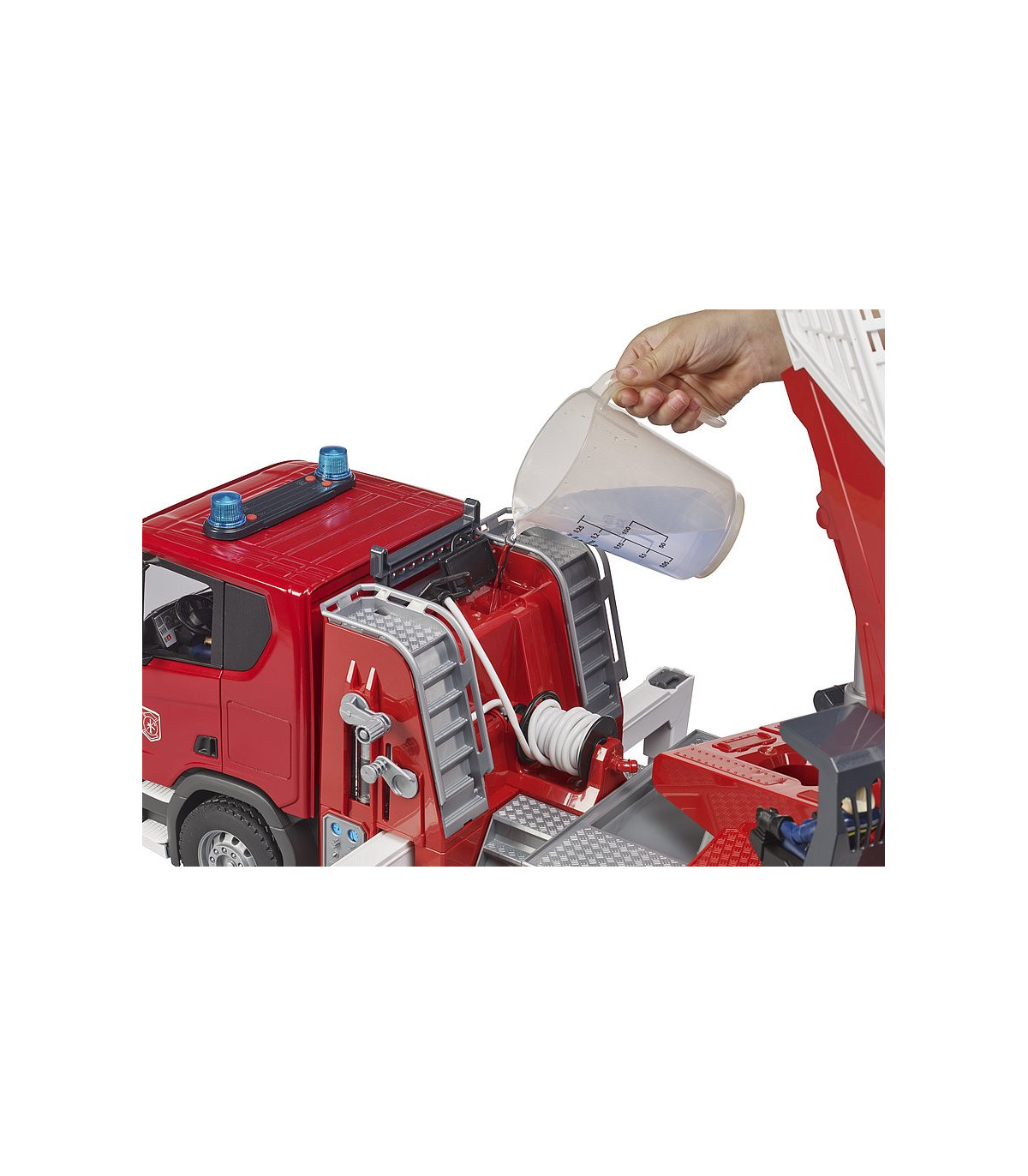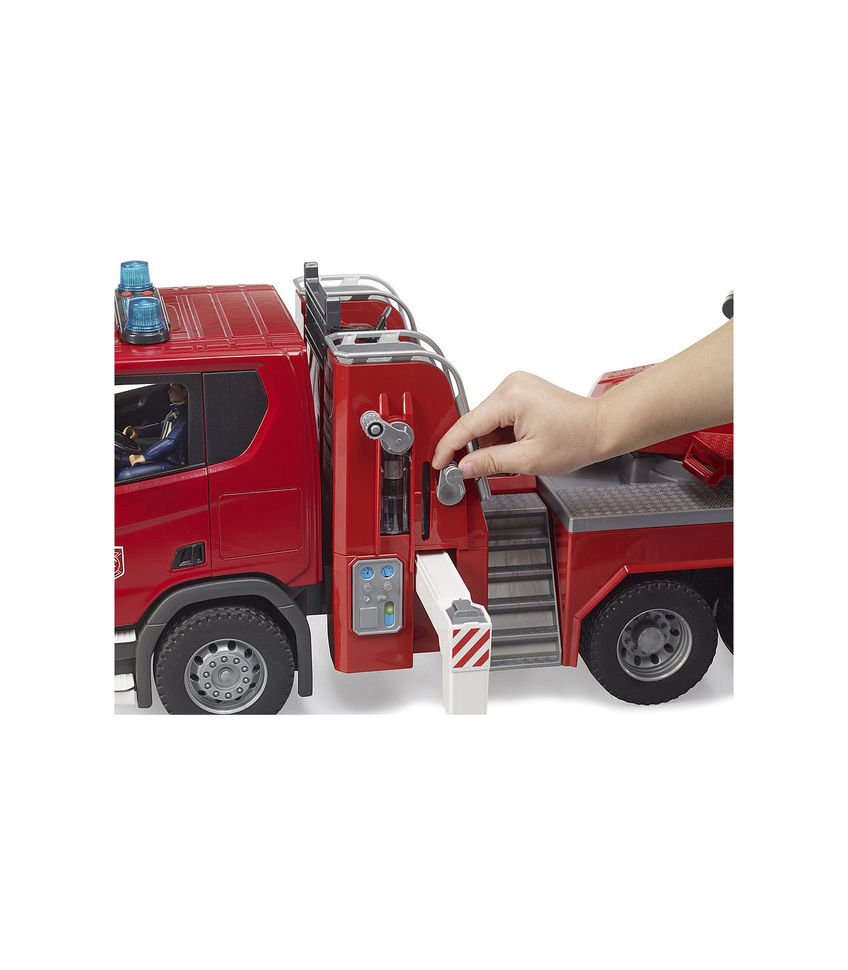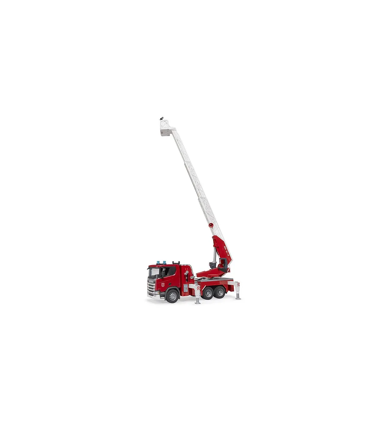 No existe nada más fascinante que reproducir una gran actuación de los bomberos. El producto estrella con temática de bomberos de la gama BRUDER es el camión de bomberos con escalera Scania Super 560R. Además de todos los detalles, como las puertas que se abren, los espejos abatibles, etc., el vehículo dispone de un depósito de agua integrado que se puede llenar mientras se juega. La manguera de agua es desenrollable y la pueden sujetar las figuras de BRUDER (por ejemplo, n.º de artículo 60100, no incluido en el volumen de suministro). También se puede sujetar al cesto de la escalera y tiene una boquilla de agua completamente funcional. La escalera giratoria con cesto de salvamento se puede desplegar y regular en altura mediante un volante. Además de los dos asientos de la cabina del conductorhay otro asiento adicional para la figura de bworld en la escalera de bomberos. Los cuatro pies de apoyo garantizan una fijación segura del vehículo en cualquier situación y el compartimento con puerta abatible crea espacio adicional para guardar herramientas. El módulo de luces y sonido, n.º de artículo 02801, con cuatro funciones distintas como ruido de motores, luz intermitente y ruido de sirenas se incluye en el volumen de suministro y aumenta más la diversión de este lujoso coche de bomberos. La estación de bomberos bworld (n.º de artículo 62702) es el complemento ideal para este apasionante vehículo de bomberos.