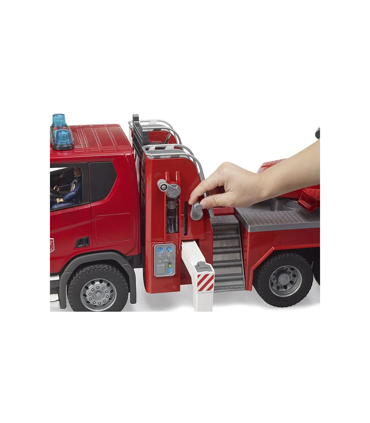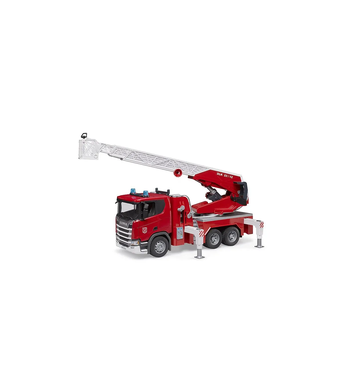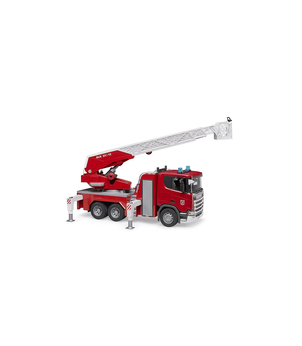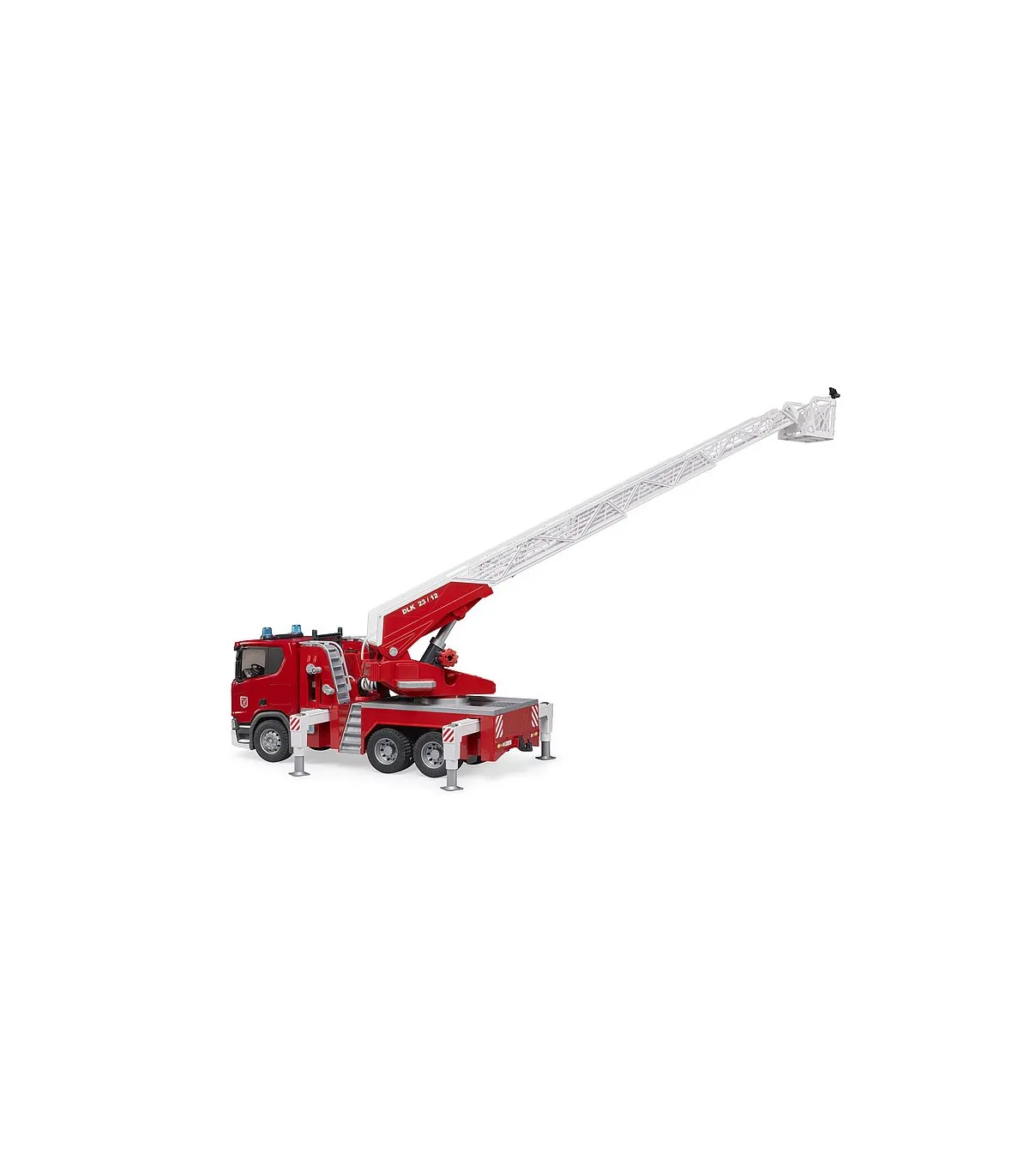 No existe nada más fascinante que reproducir una gran actuación de los bomberos. El producto estrella con temática de bomberos de la gama BRUDER es el camión de bomberos con escalera Scania Super 560R. Además de todos los detalles, como las puertas que se abren, los espejos abatibles, etc., el vehículo dispone de un depósito de agua integrado que se puede llenar mientras se juega. La manguera de agua es desenrollable y la pueden sujetar las figuras de BRUDER (por ejemplo, n.º de artículo 60100, no incluido en el volumen de suministro). También se puede sujetar al cesto de la escalera y tiene una boquilla de agua completamente funcional. La escalera giratoria con cesto de salvamento se puede desplegar y regular en altura mediante un volante. Además de los dos asientos de la cabina del conductorhay otro asiento adicional para la figura de bworld en la escalera de bomberos. Los cuatro pies de apoyo garantizan una fijación segura del vehículo en cualquier situación y el compartimento con puerta abatible crea espacio adicional para guardar herramientas. El módulo de luces y sonido, n.º de artículo 02801, con cuatro funciones distintas como ruido de motores, luz intermitente y ruido de sirenas se incluye en el volumen de suministro y aumenta más la diversión de este lujoso coche de bomberos. La estación de bomberos bworld (n.º de artículo 62702) es el complemento ideal para este apasionante vehículo de bomberos.