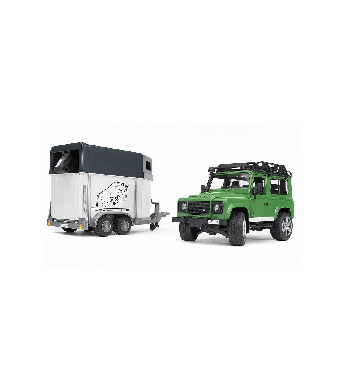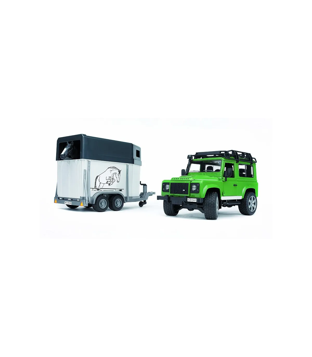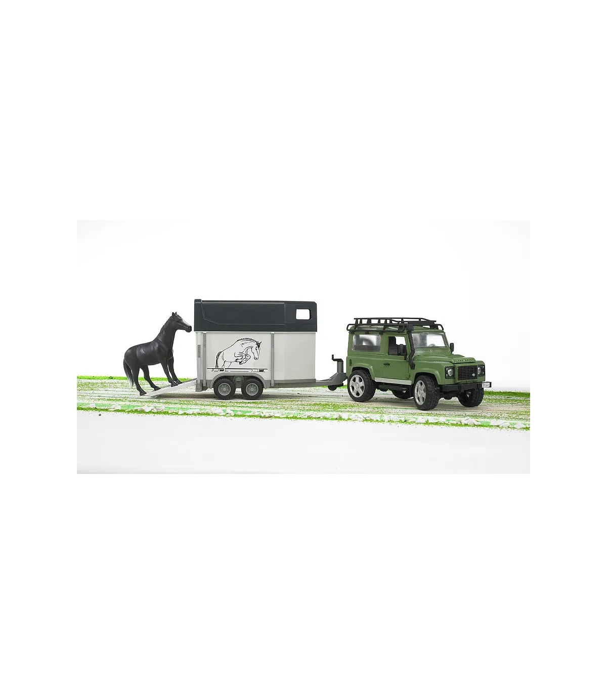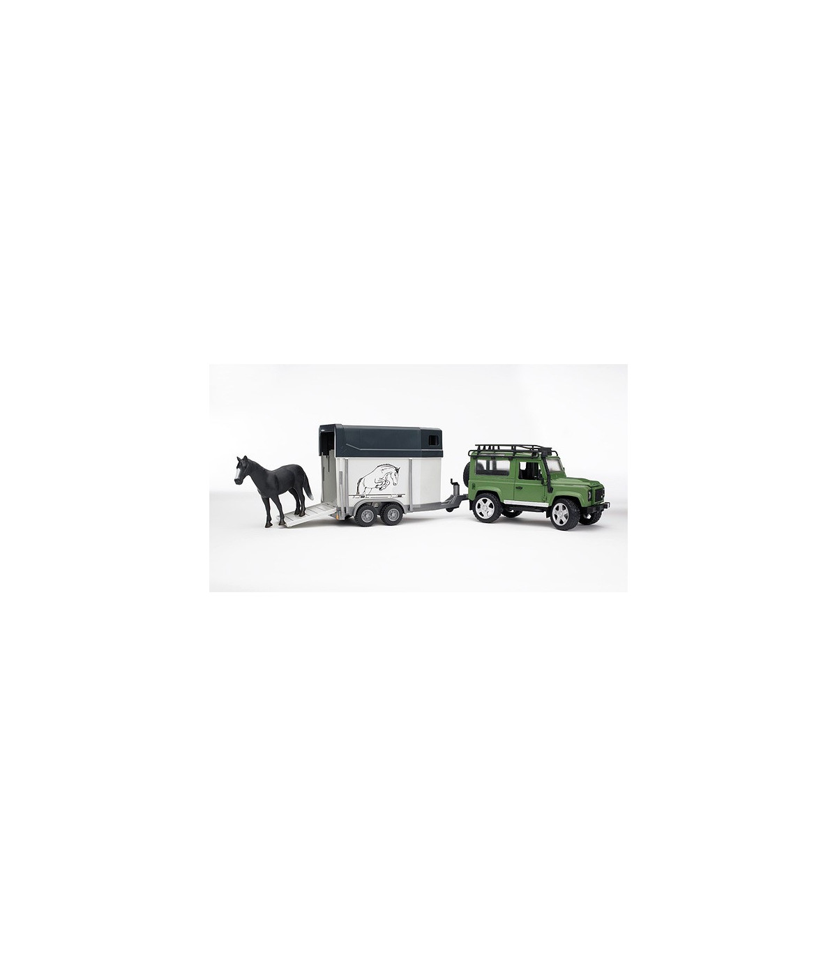 El nuevo Defender de BRUDER ofrece cualidades todoterreno fascinantes combinadas con el diseño intemporal de Land Rover. Como todos los vehículos, este modelo también recrea el original en detalle. No sólo seducirá a los fans de la marca Land Rover el modelo resultante con sus detalles sorprendentes, como p. ej. la chapa de la estructura en relieve del capó de motor y las numerosas funciones con las que se puede jugar. Además del capó de motor que permite ver el detallado bloque de motor, se pueden abrir las puertas traseras y laterales, el asiento trasero se puede extraer y el acoplamiento de remolque se puede desmontar. Gracias a la suspensión de ambos ejes jugando también es posible atravesar cualquier terreno con facilidad. Además, el eje delantero es dirigible mediante árbol de dirección adicional (incluido en el volumen de suministro) conocido por los tractores de BRUDER, ofreciendo así un control fácil sobre el vehículo. La combinación de su capacidad todoterreno, su diseño elegante y el remolque de caballos enganchado hace que este vehículo sea especialmente atractivo para los aficionados a la equitación.