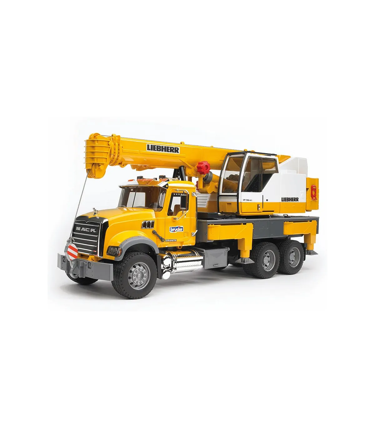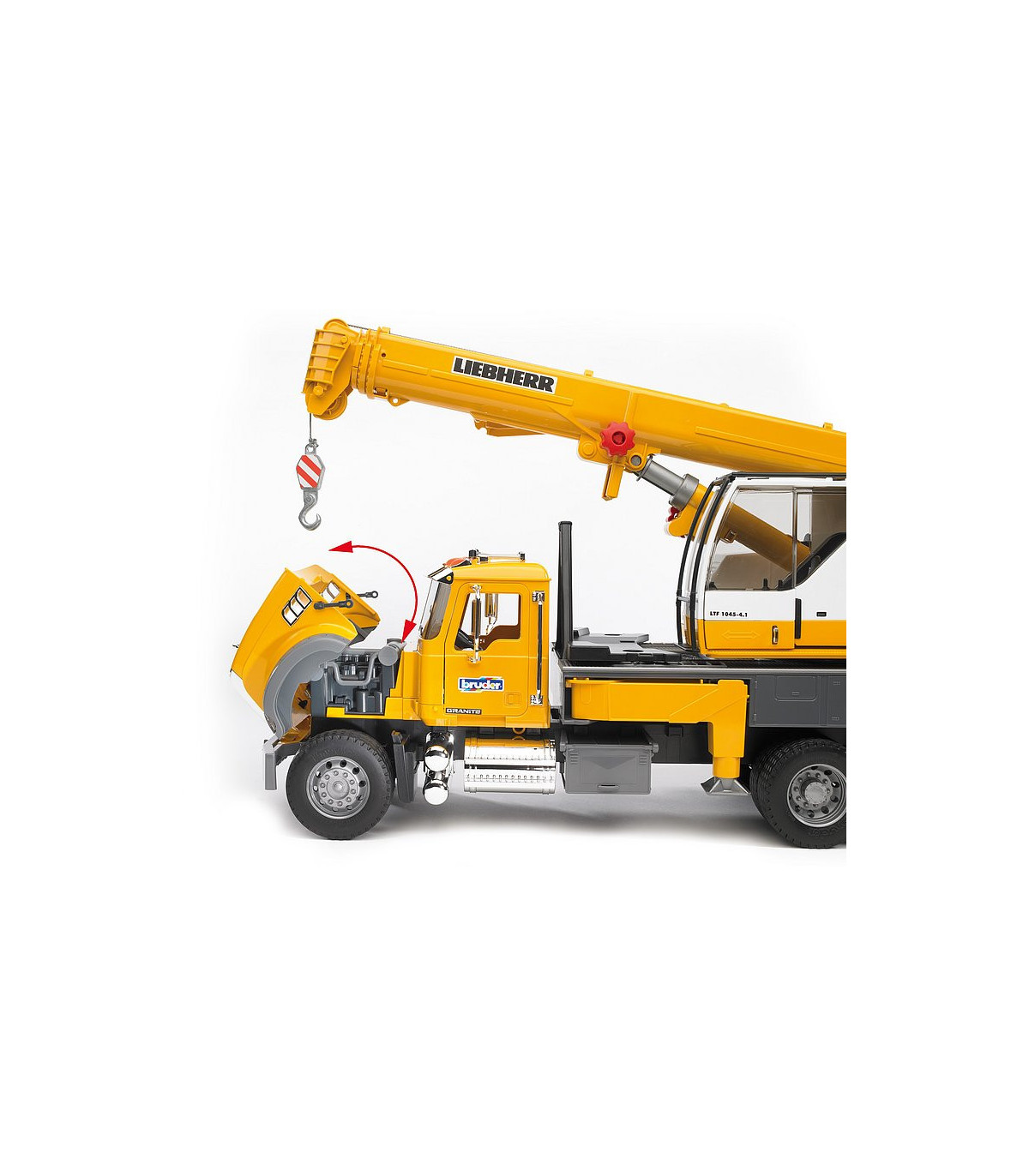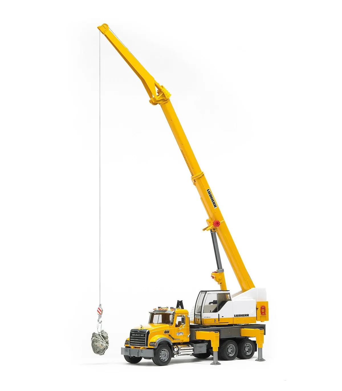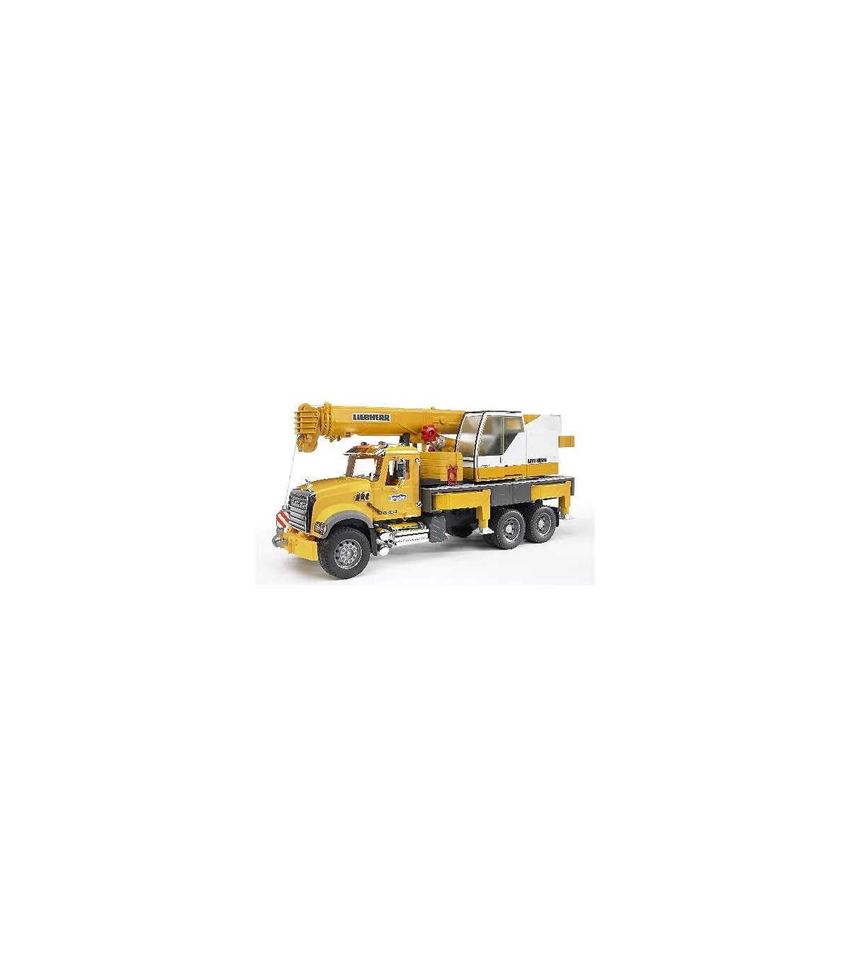 En el sentido más literal de la palabra, la impresionante grúa telescópica sobre camión de BRUDER sobresale de entre los vehículos industriales de BRUDER. La grúa sobre camión tiene ya una altura considerable con la pluma telescópica desplegada, pero todavía puede aumentarse con un brazo extensible adicional. Nuestros clientecillos alucinarán con el tamaño de la grúa que, con el brazo desplegado y totalmente vertical, alcanza 1,30 m de alto, con el que superará a algunos de los maestros de obra más pequeñitos. Con este tamaño, la estabilidad es absolutamente necesaria. La elevada resistencia a la basculación que presenta este vehículo se consigue gracias a las patas estabilizadoras giratorias y de ajuste individual de la plataforma del vehículo. Si todavía se requiere más estabilidad, se podrá utilizar el contrapeso acoplado, como en la grúa original. Para conferir más peso al modelo, se puede llenar con arena. El eslogan de BRUDER "multifuncional" se hace especialmente visible en este modelo. Un torno de cable de nuevo desarrollo con sistema de fijación y seguridad de sobrecarga permite manejar con total facilidad el gancho de la grúa cuando sube y baja, también con piezas grandes. El amor por los detalles tampoco se detiene ante la cabina del conductor. Como la grúa original, dispone de un marco de protección de los cristales y una puerta corredera que se puede abrir. Un compartimento para herramientas integrado en la plataforma completa las numerosas funciones de la grúa. Idéntico aspecto presenta también la cabina Mack: sus muchas piezas cromadas y su gran capó del motor son la representación de la "American way of life". Un camión con muchas funciones, como las puertas y el capó del motor, que se pueden abrir.